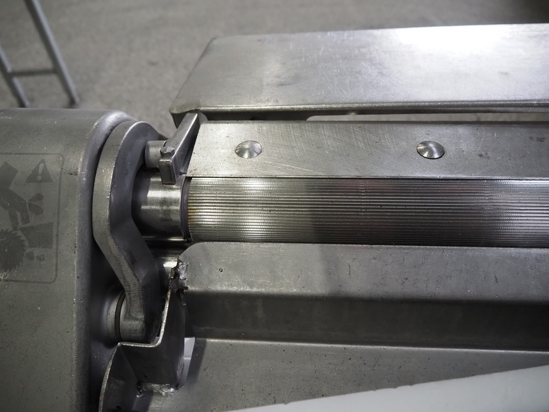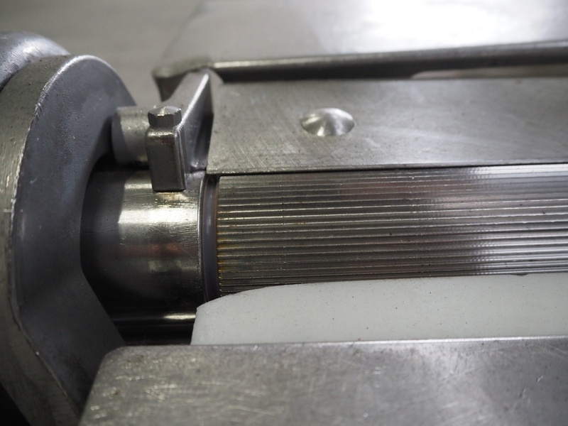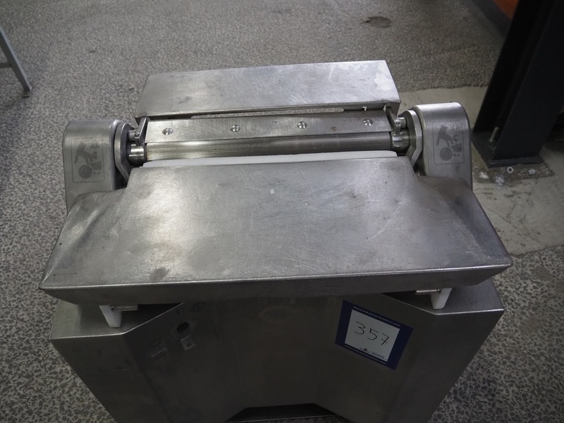 Townsend mobile skinning machine, model: 7620, serial number: 569, year of construction: 1995, 380 V, 3 Ph, 50 Hz, 2.0 A, working width: 210 mm, foot control, total dimensions: 260 mm x 950 mm x 1000 mm.