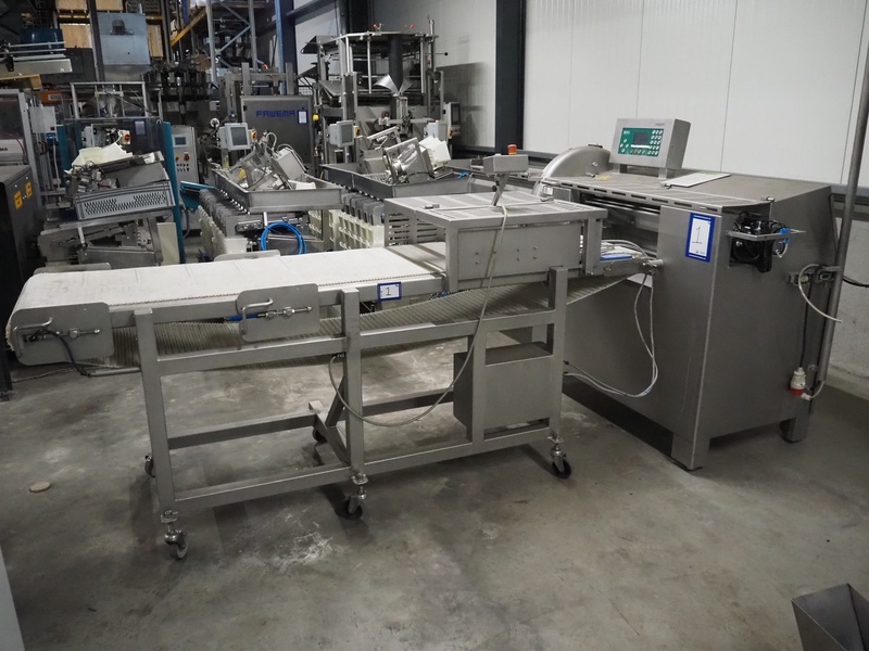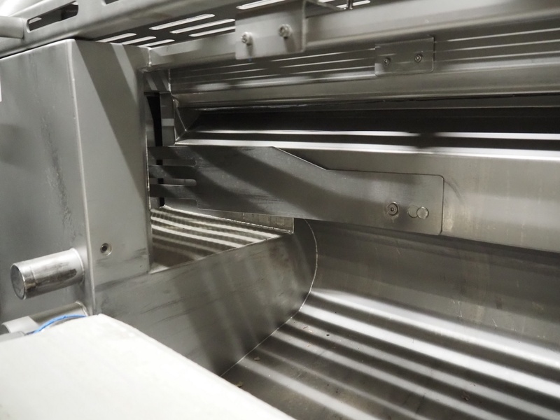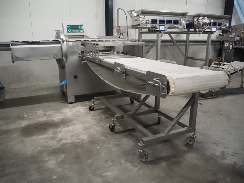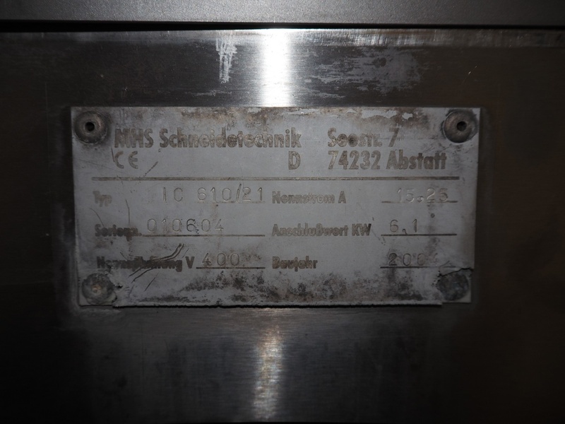MHS Schneidetechnik GmbH slicer with infeed belt, type: IC610/21, serial number: 010604, year of construction: 2004, 400 V, 15.25 A, 6.1 kW, plastic belt, belt width: 610 mm, dimensions chamber: 210 mm x 210 mm, total dimensions: 2400 mm x 800 mm x 1500 mm, dimensions infeed belt: 2700 mm x 860 mm x 1500 mm.