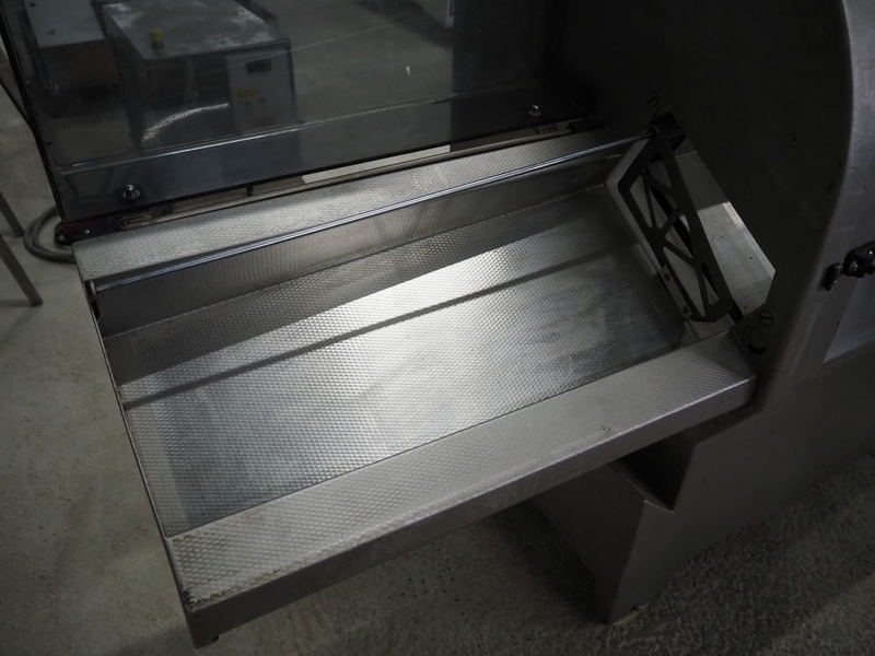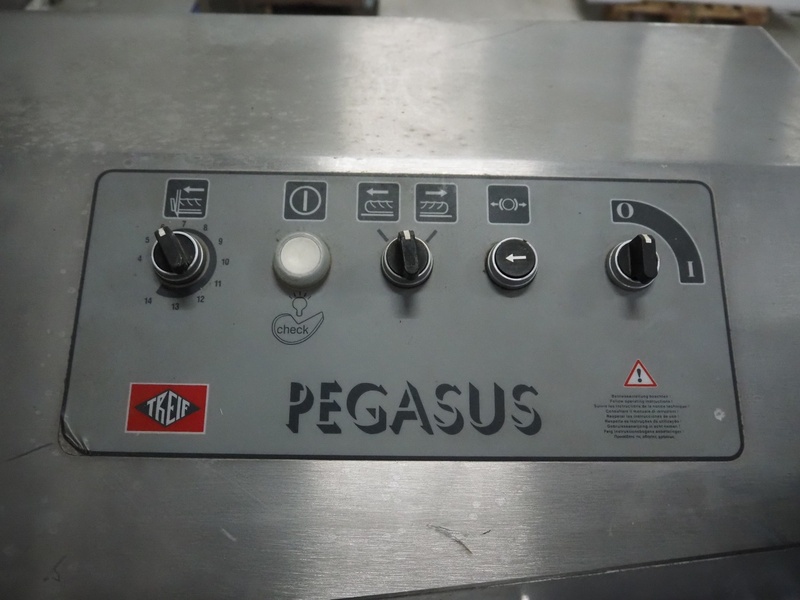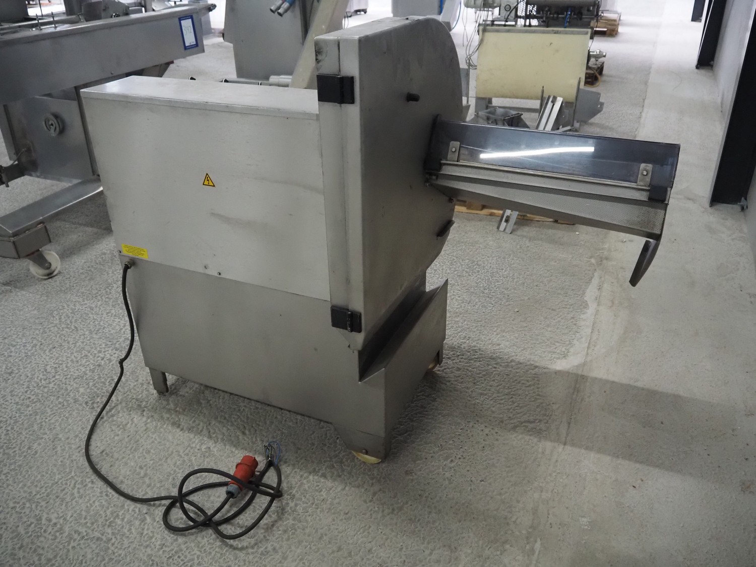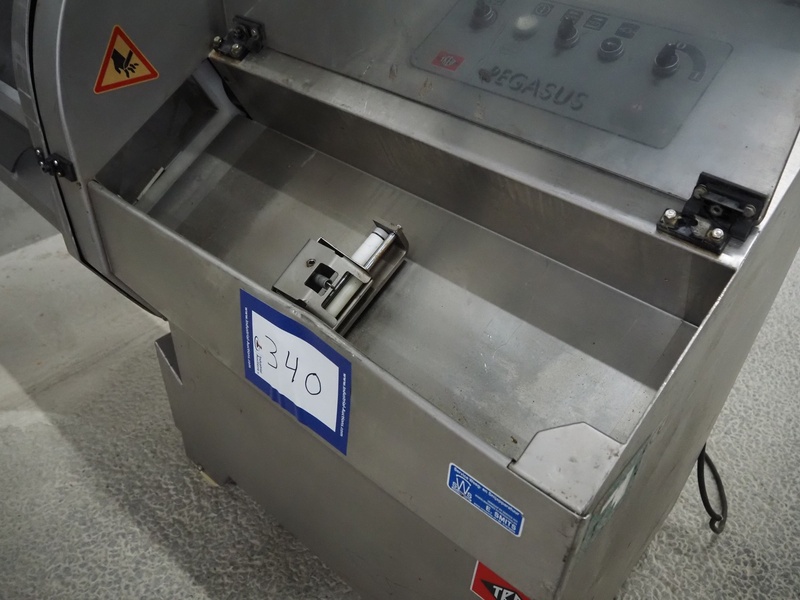 Treif Maschinenbau GmbH mobile slicer, model: 2616, machine number: 261607.97691.0211, year of construction: 2001, 400 V, 50 Hz, 2.25 A, 0.90 kW, weight: 210 kg, dimensions chamber, 250 mm x 150 mm, total dimensions: 1700 mm x 800 mm x 1400 mm. Cover broken, technical condition unknown.