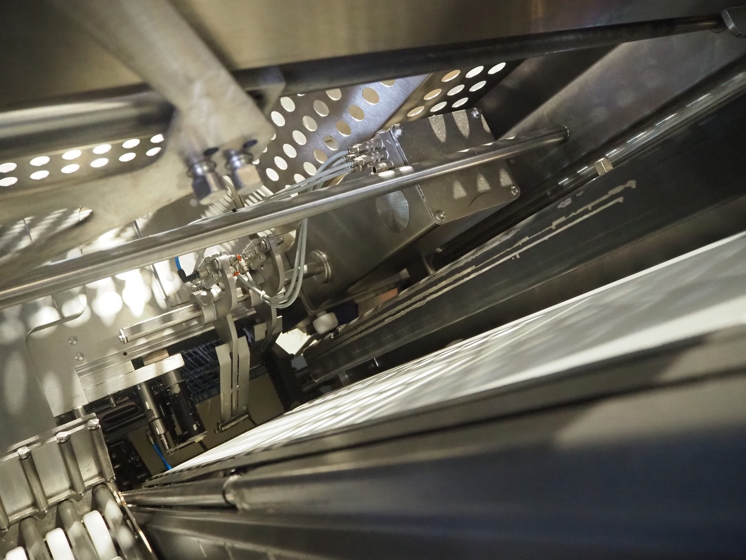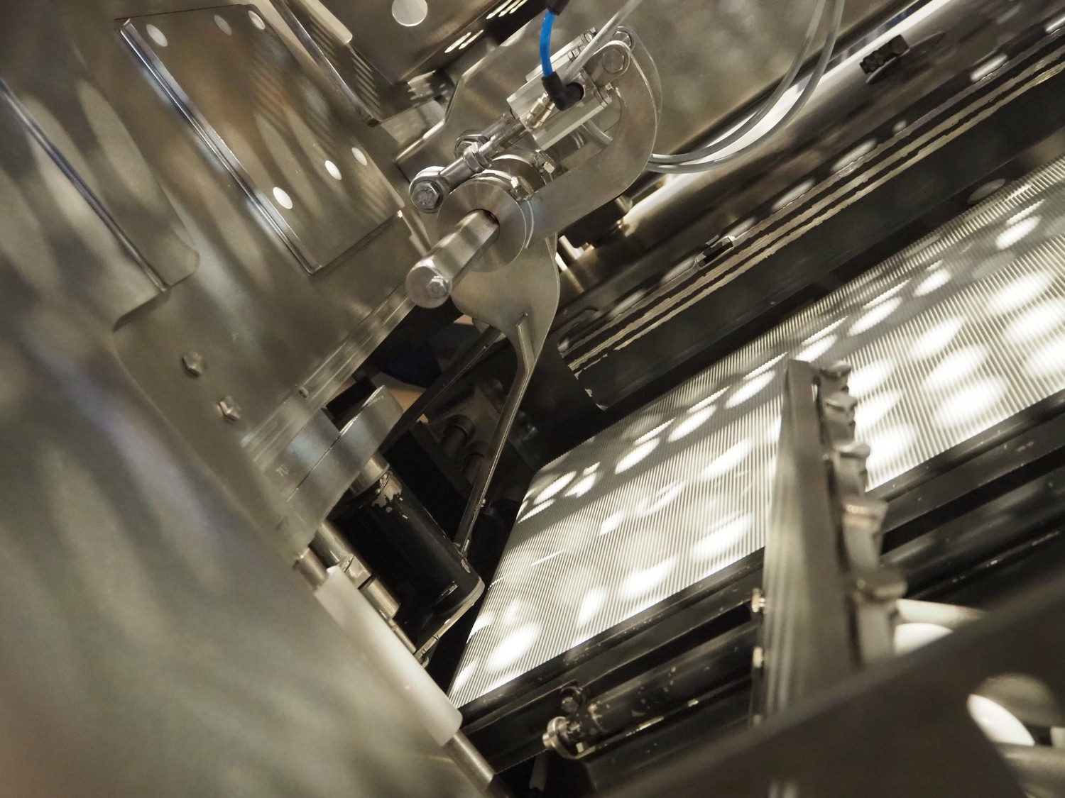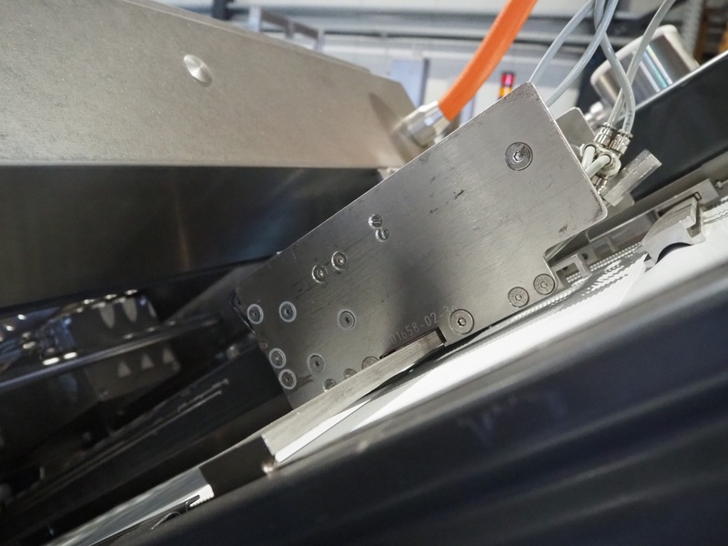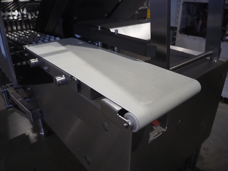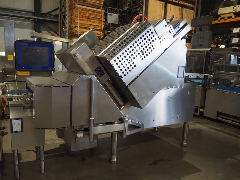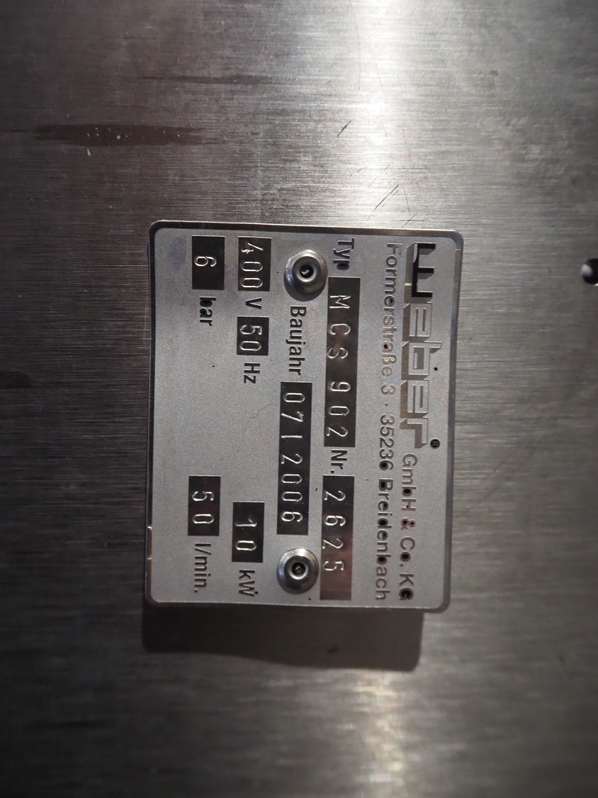 Weber slicer, type: MCS 902, number: 2625, year of construction: 07/2006, 400 V, 50 Hz, 10 kW, 6 bar, plastic wired outfeed belt, belt width: 400 mm, total dimensions: 3150 mm x 1700 mm x 2600 mm.