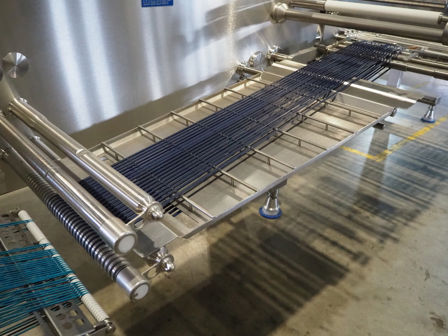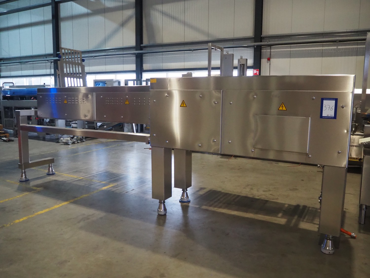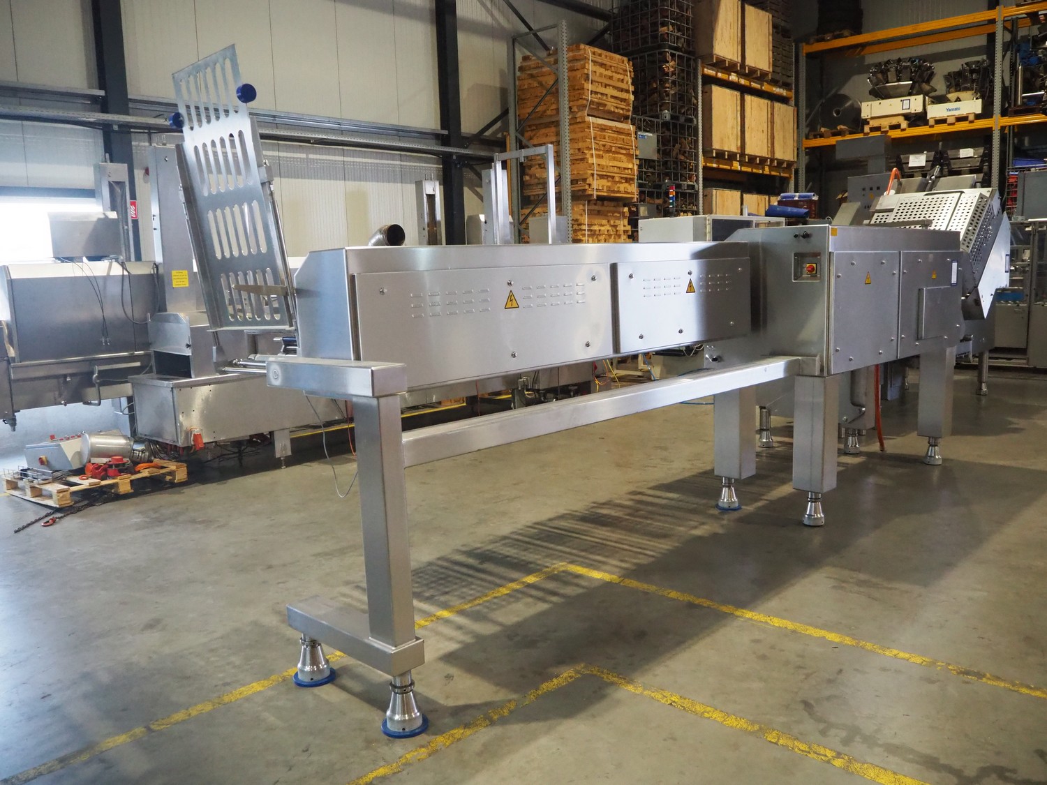 Weber outfeed belt, type: CCA, number: 2622, year of construction: 2006, 400 V, 50 Hz, 7 kW, plastic wired belt, belt width: 520 mm, total dimensions: 5370 mm x 1800 mm x 1800 mm.