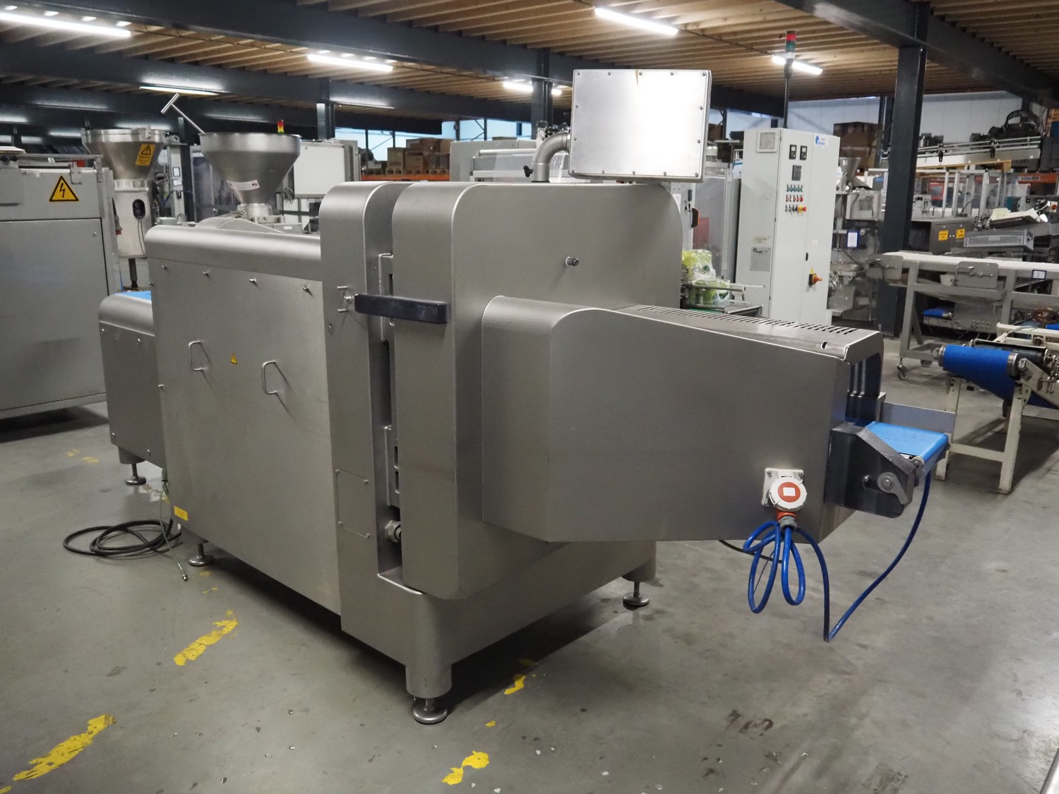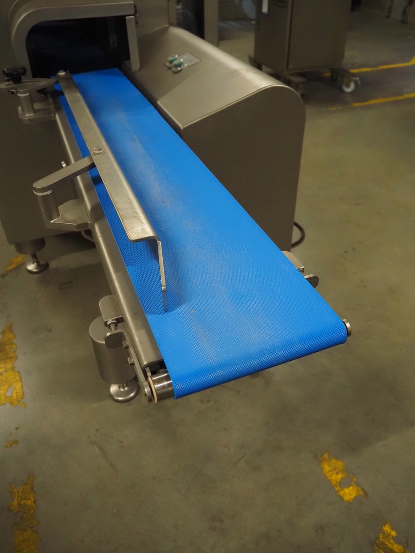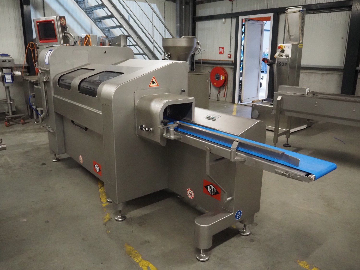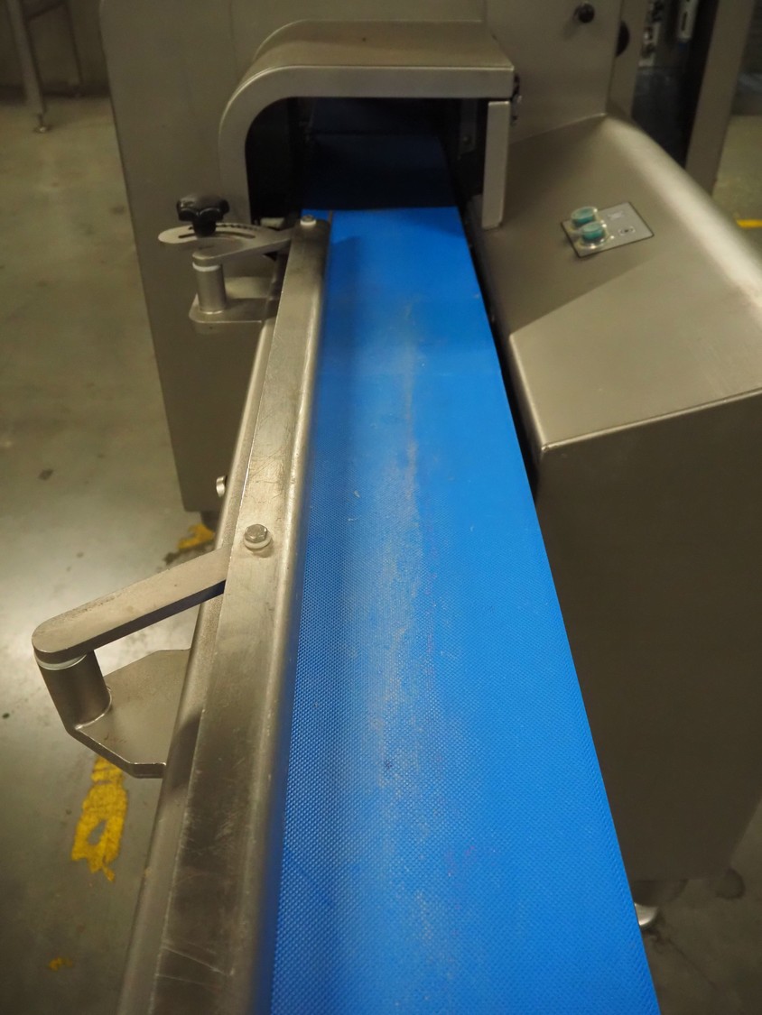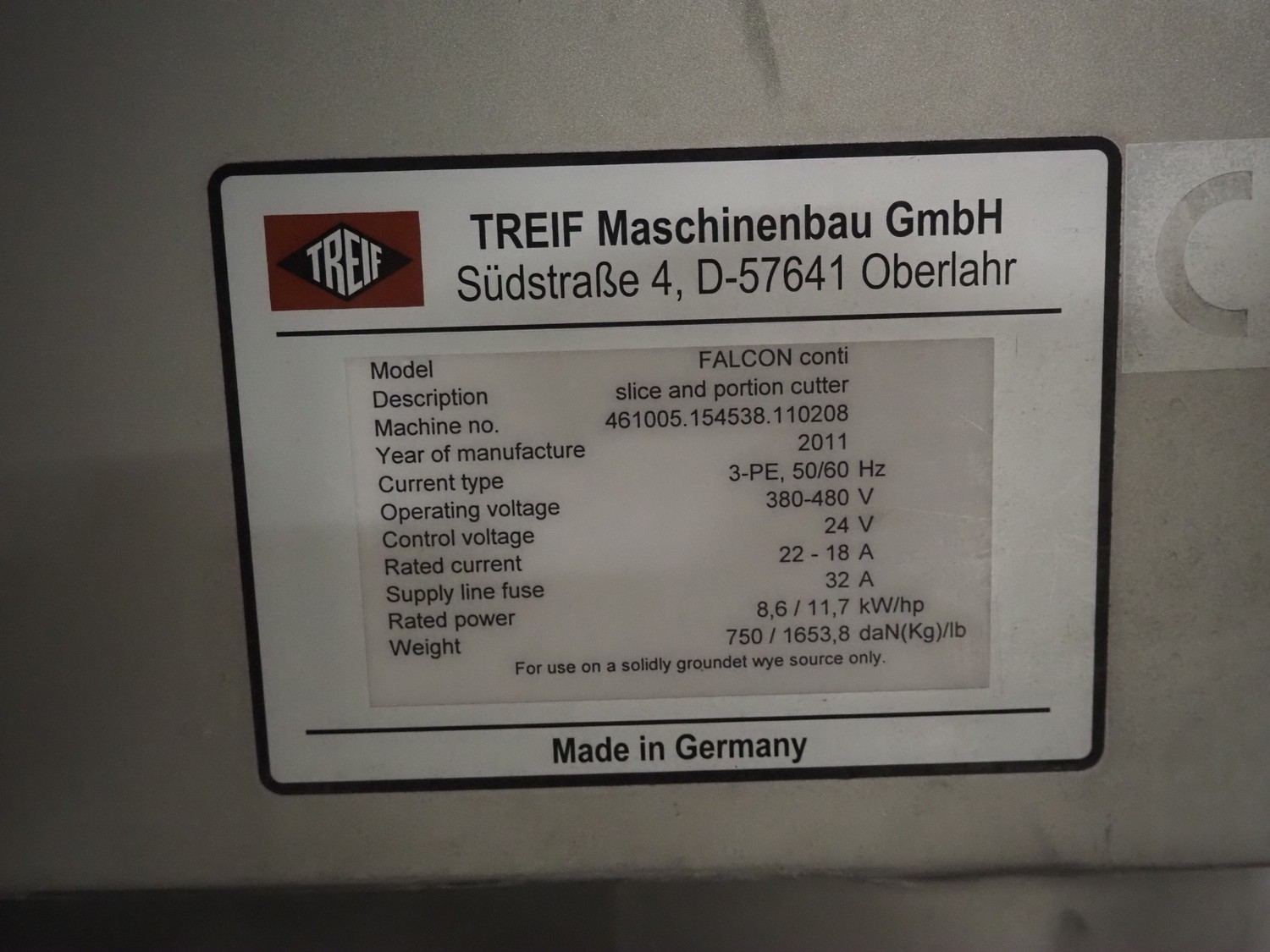Treif Maschinenbau GmbH slicer and portion cutter, model: FALCON conti, machine number: 461005.154538.110208, year of construction: 2011, 380-480 V, 3 Ph, 50/60 Hz, 32 A, 8.6 kW, weight: 750 kg, plastic belt, belt width: 220 mm, clearance: 290 mm x 180 mm, total dimensions: 4630 mm x 1300 mm x 1900 mm.