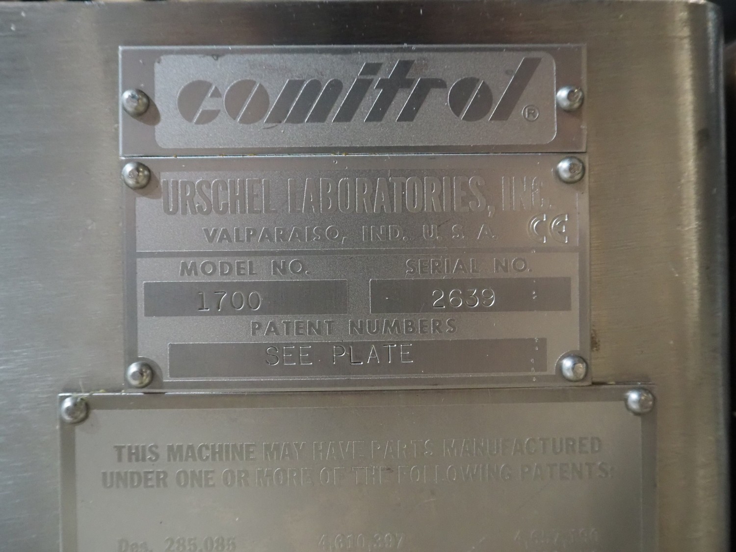 Urschel Laboratories slicer, model: 1700, serial number: 2639, diameter drum: 155 mm, total dimensions: 1350 mm x 900 mm x 1900 mm.