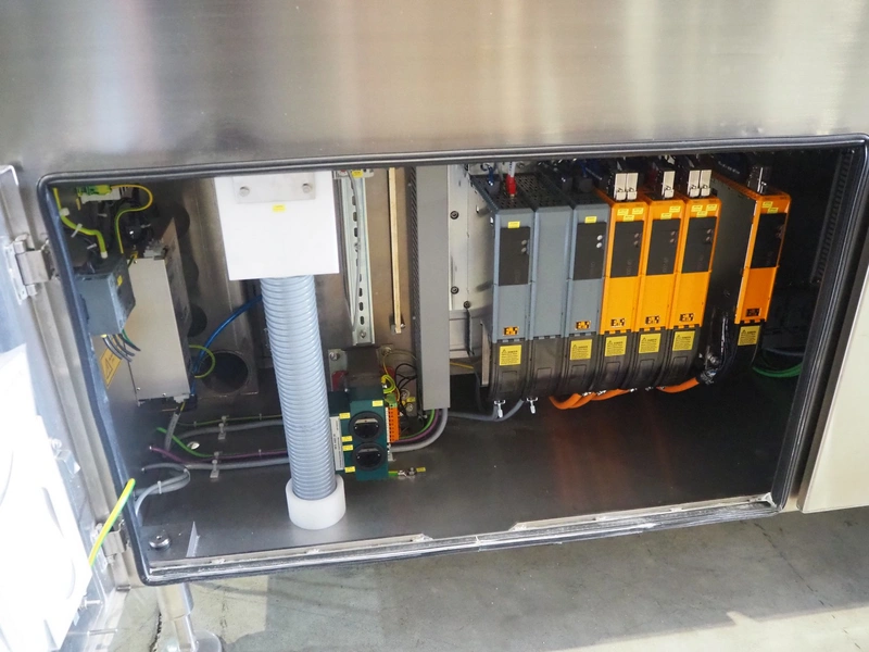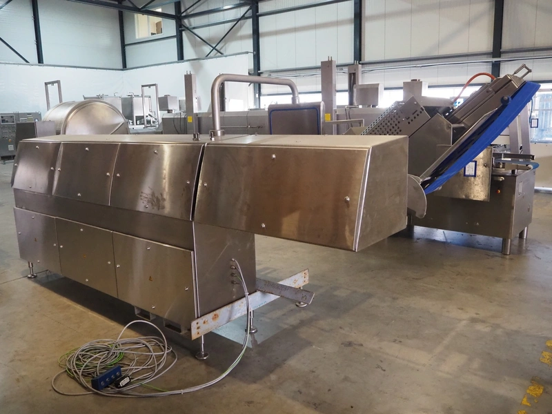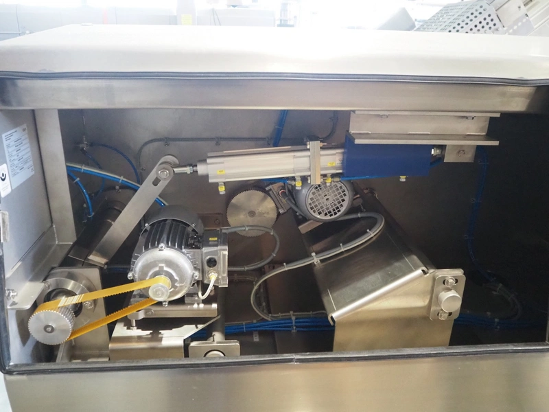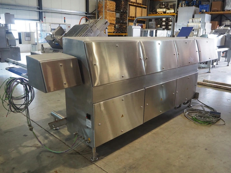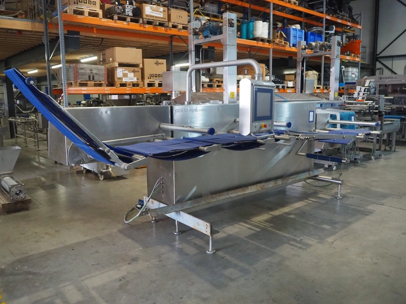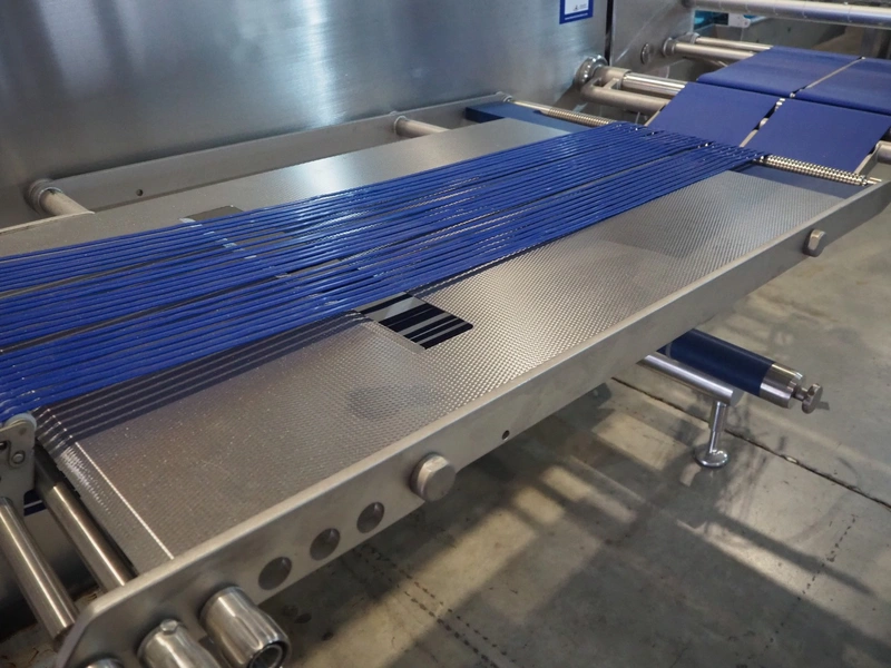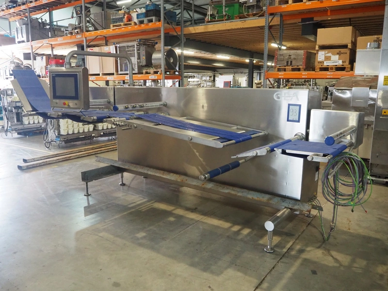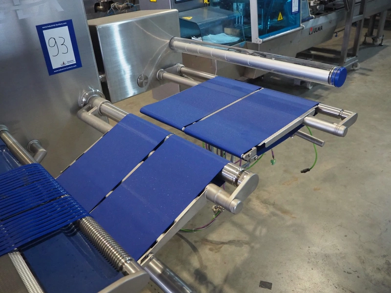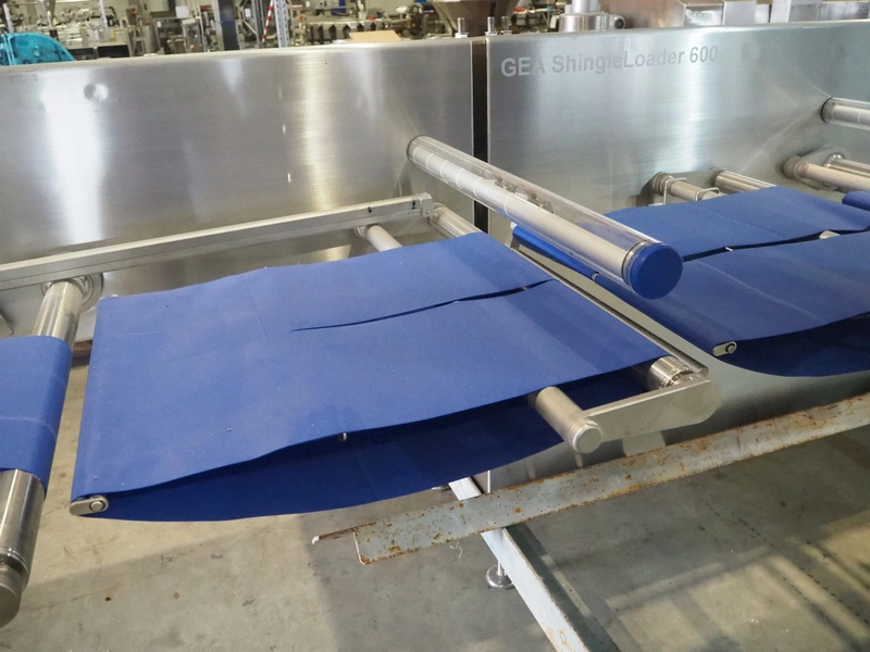 Outfeed belt for GEA slicer, type: Shingle Loader 600, serial number: 4040860453, year of construction: 2015, 400 V, 3 Ph, 15.0 A, plastic belts, belt width: (2x) 250 mm, (3x) 120 mm, (2x) 300 mm and (1x) 380 mm, plastic string conveyor, belt width: 360 mm, total dimensions: 5400 mm x 1700 mm x 2050 mm.