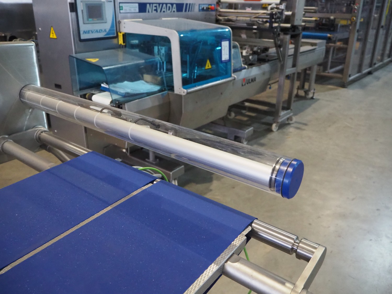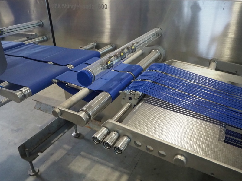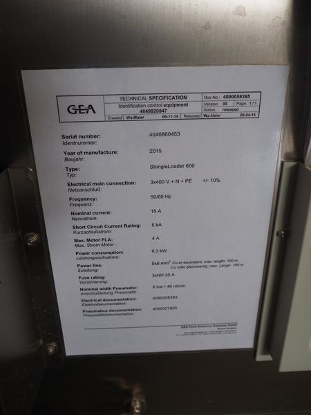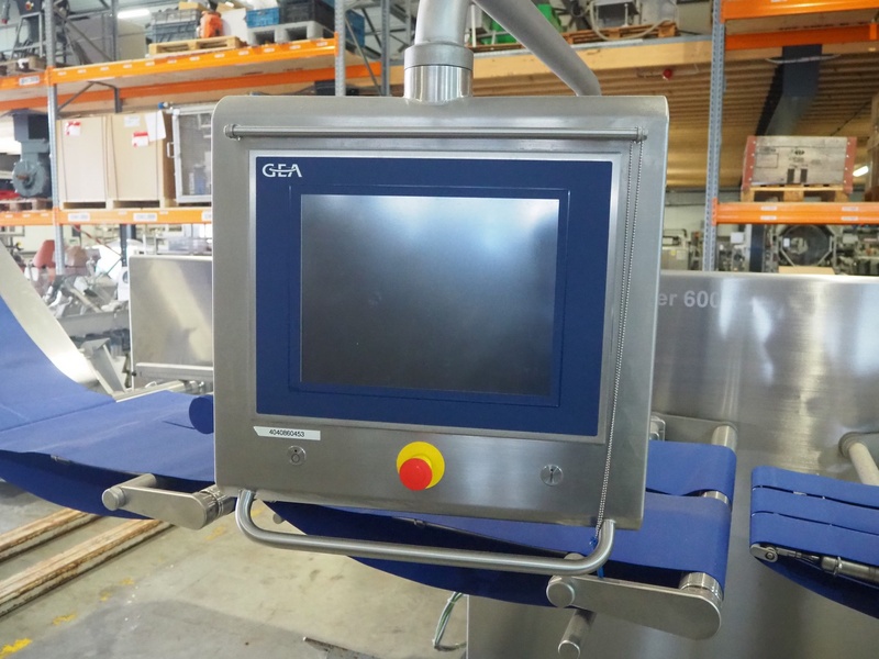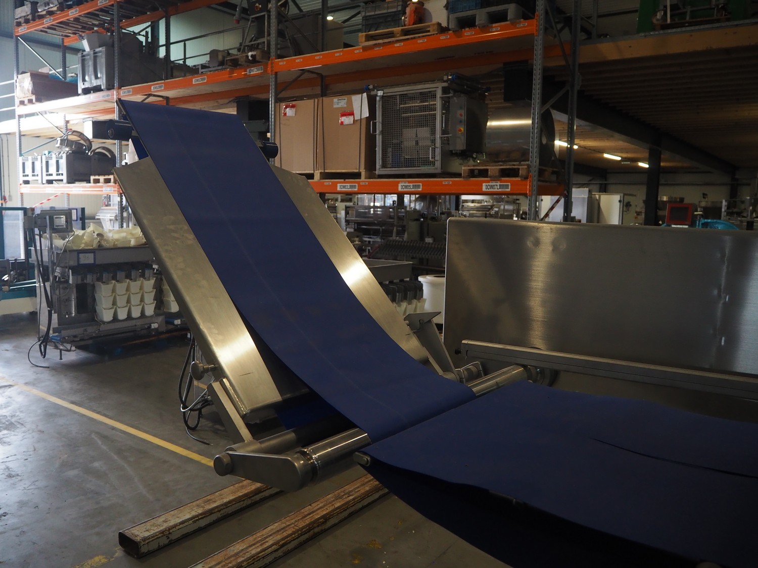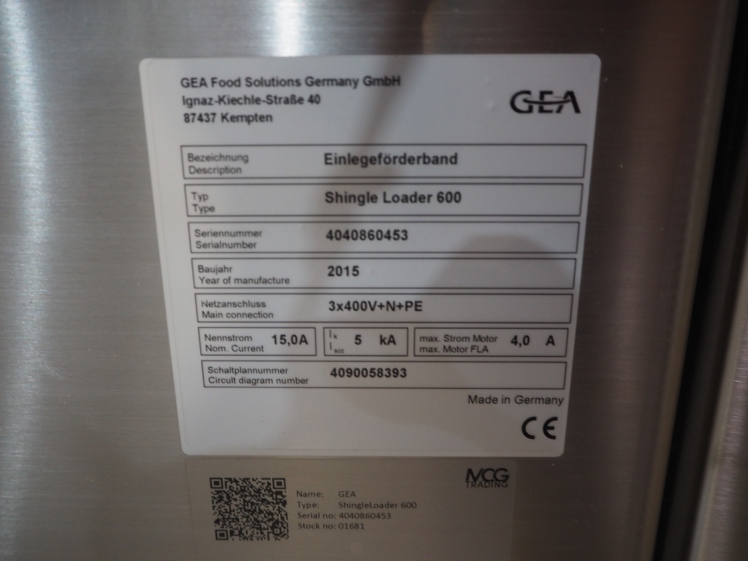 Outfeed belt for GEA slicer, type: Shingle Loader 600, serial number: 4040860453, year of construction: 2015, 400 V, 3 Ph, 15.0 A, plastic belts, belt width: (2x) 250 mm, (3x) 120 mm, (2x) 300 mm and (1x) 380 mm, plastic string conveyor, belt width: 360 mm, total dimensions: 5400 mm x 1700 mm x 2050 mm.
