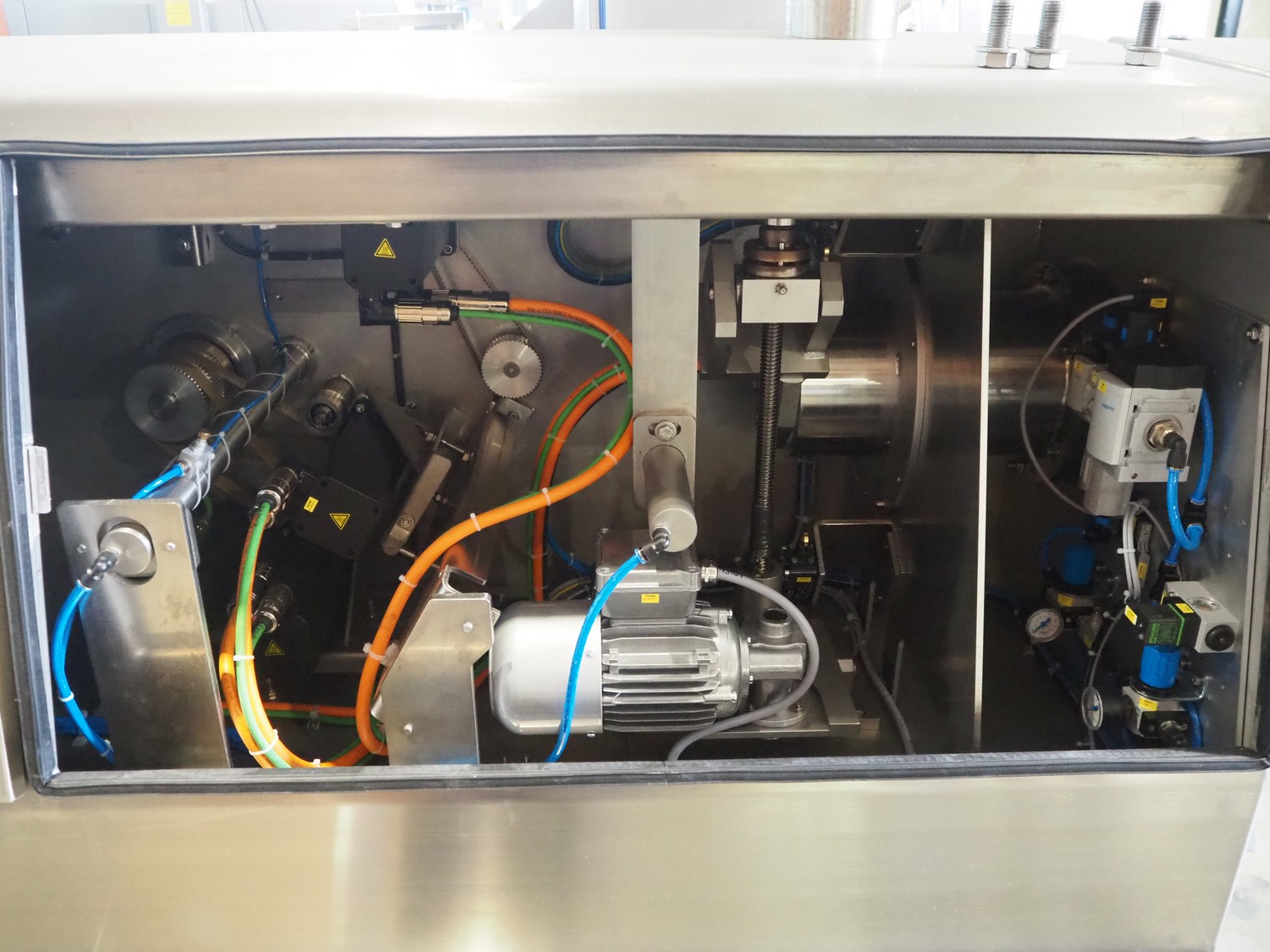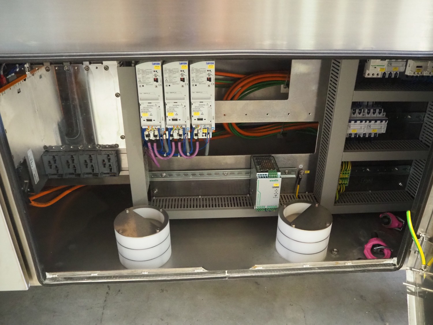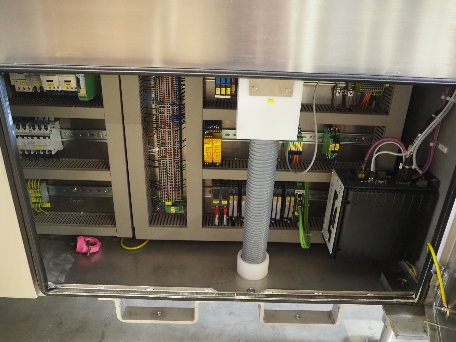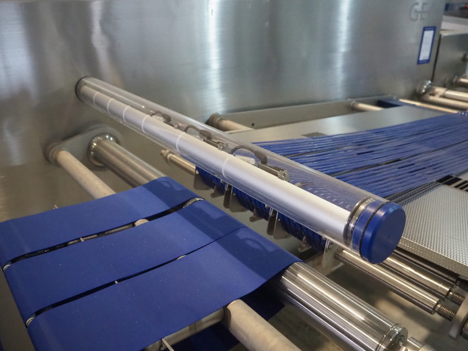 Outfeed belt for GEA slicer, type: Shingle Loader 600, serial number: 4040860453, year of construction: 2015, 400 V, 3 Ph, 15.0 A, plastic belts, belt width: (2x) 250 mm, (3x) 120 mm, (2x) 300 mm and (1x) 380 mm, plastic string conveyor, belt width: 360 mm, total dimensions: 5400 mm x 1700 mm x 2050 mm.