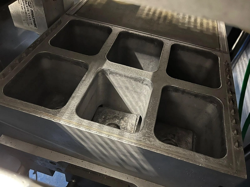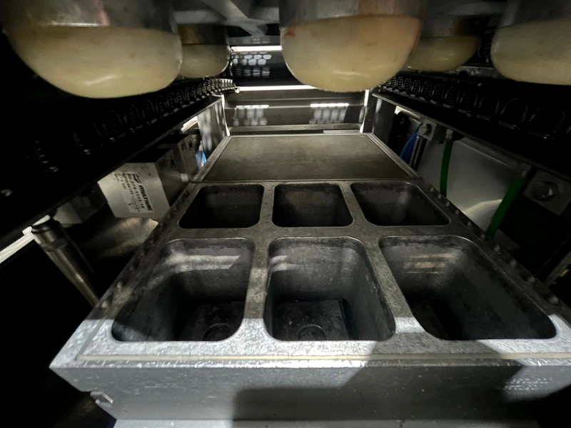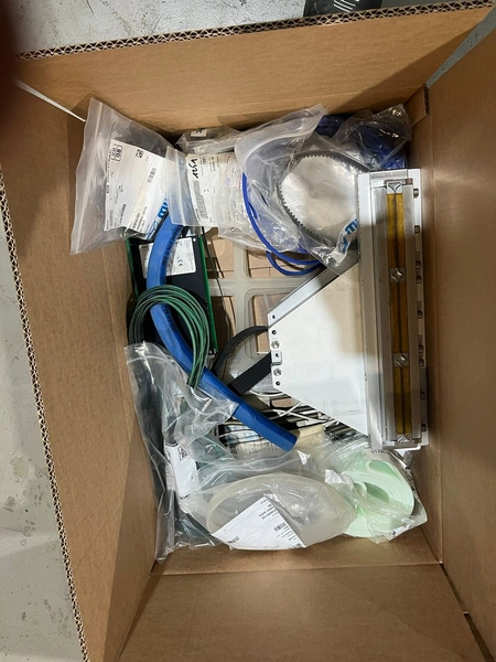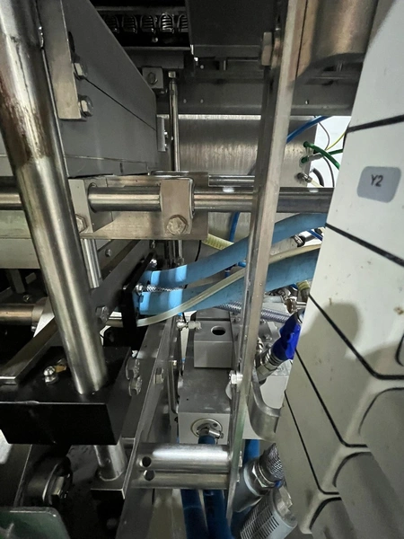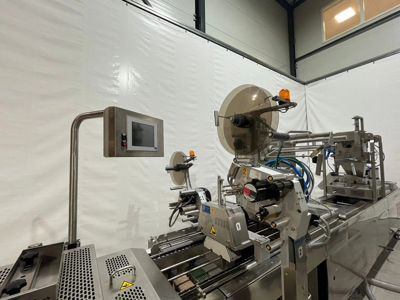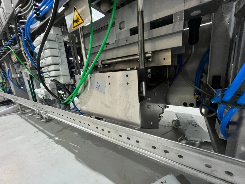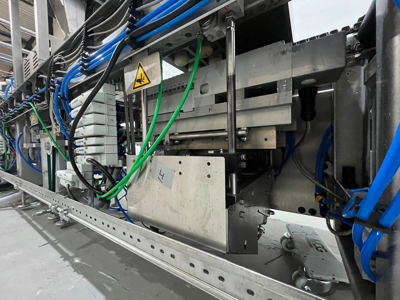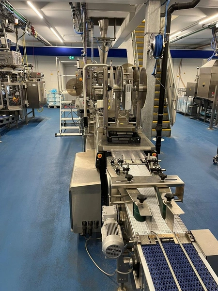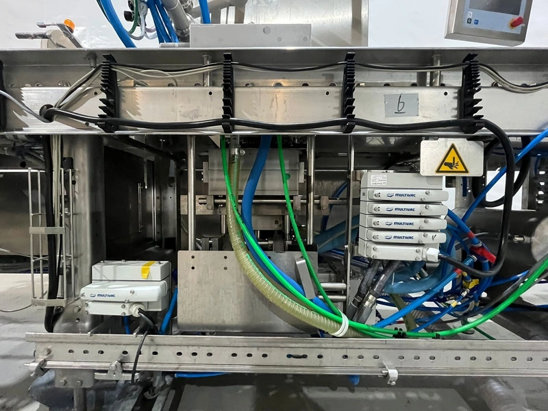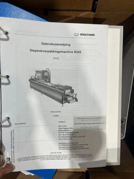 Multivac thermoformer, type: R245, machine number: 124685, year of construction: 2008, 400 V, 3 Ph, 50 Hz, 18 A, 7 kW, film width: 356 mm, dye: 100 mm x 90 mm, with batcher, Busch vacuum pump, total dimensions: 9090 mm x 1000 mm x 2500 mm. And pallet with parts. Without rollies and vacuum pump skid.