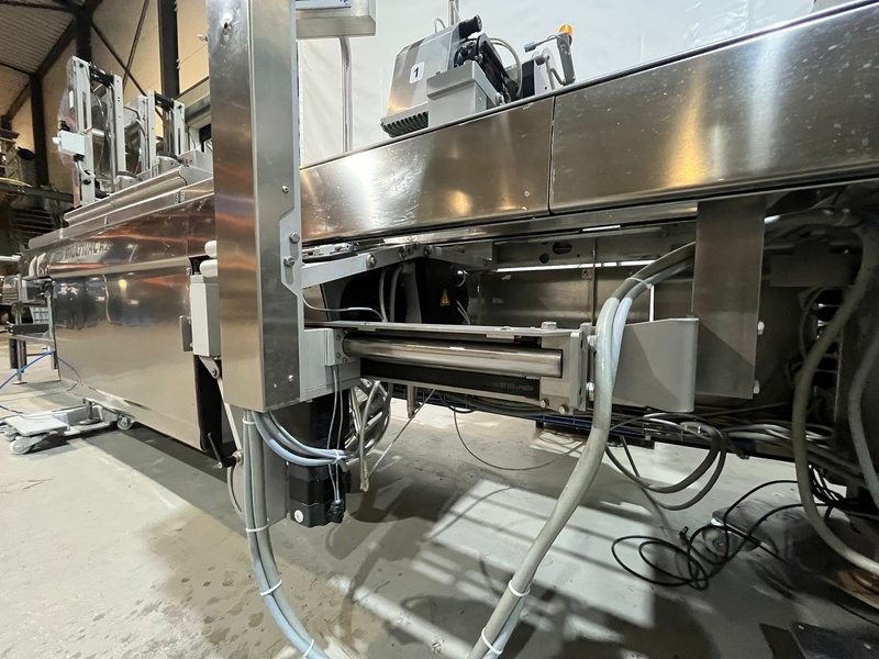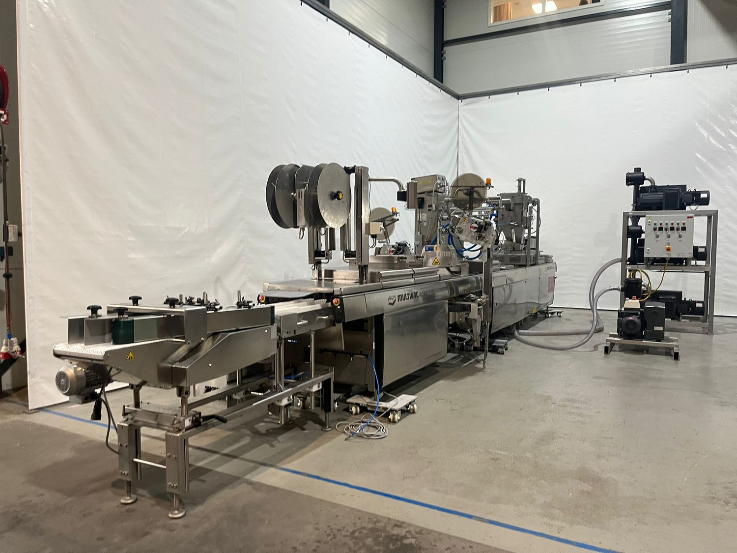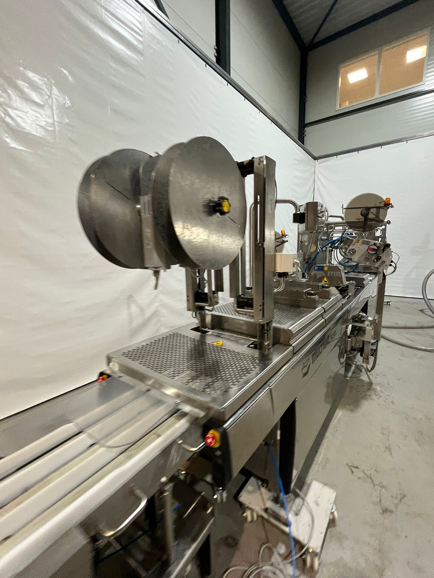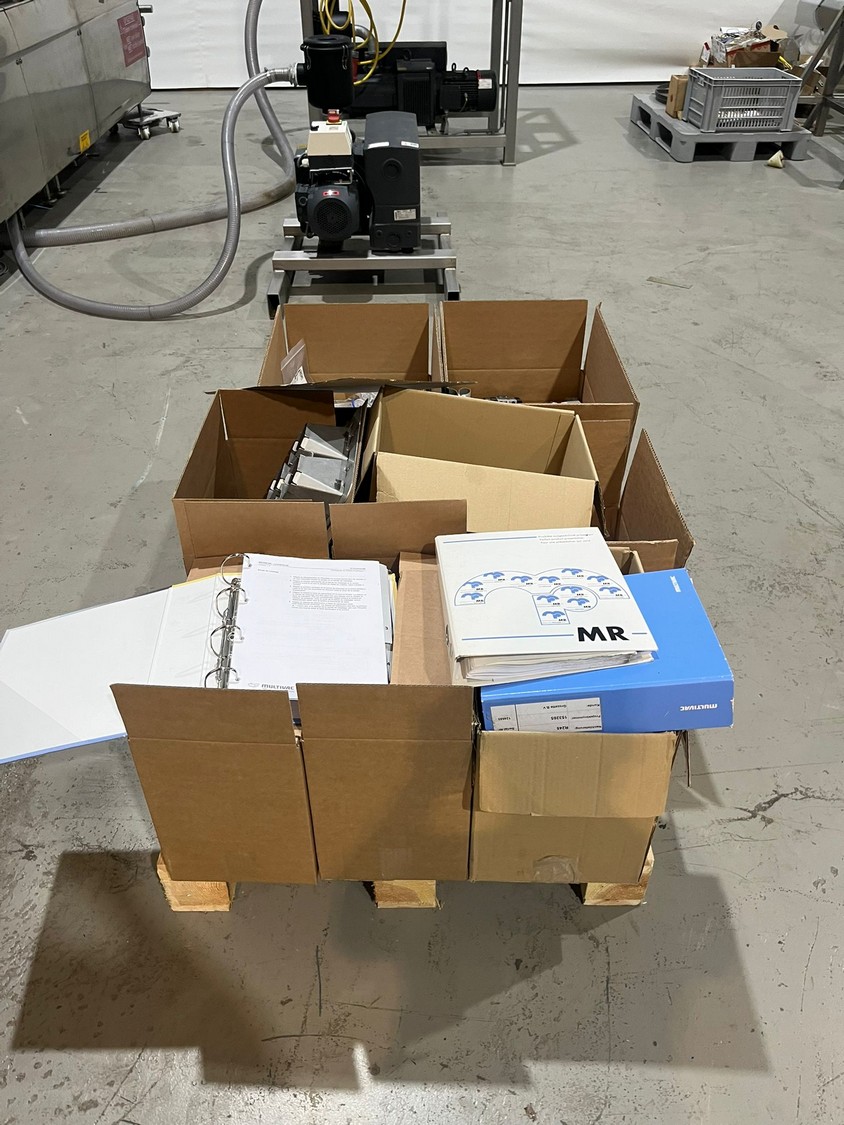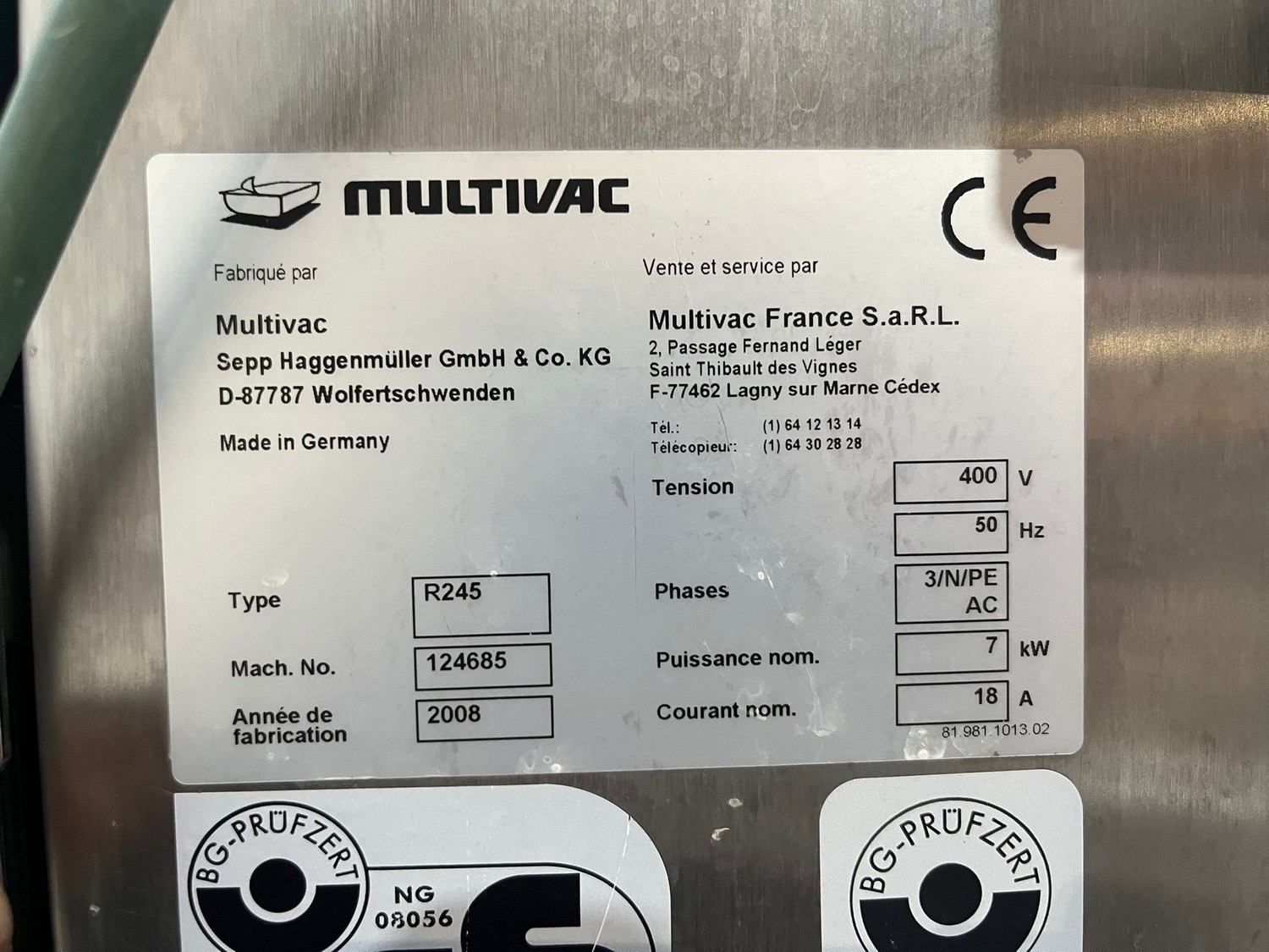 Multivac thermoformer, type: R245, machine number: 124685, year of construction: 2008, 400 V, 3 Ph, 50 Hz, 18 A, 7 kW, film width: 356 mm, dye: 100 mm x 90 mm, with batcher, Busch vacuum pump, total dimensions: 9090 mm x 1000 mm x 2500 mm. And pallet with parts. Without rollies and vacuum pump skid.