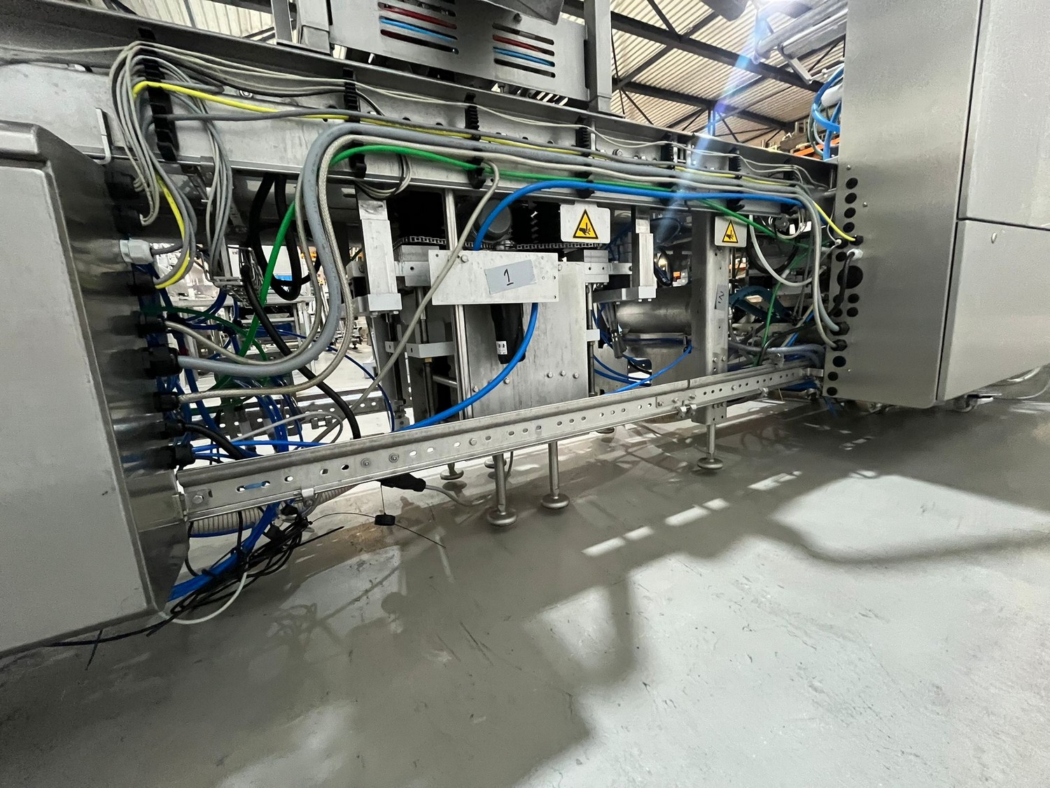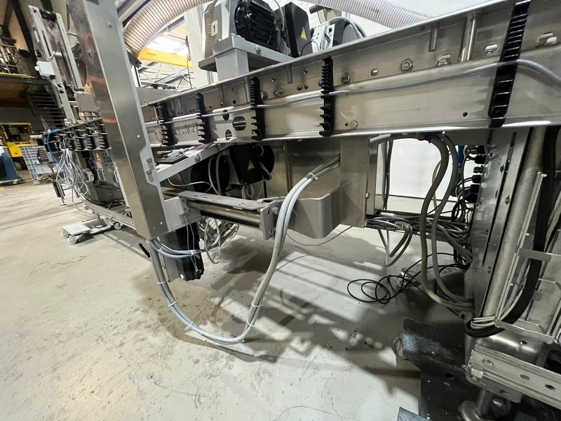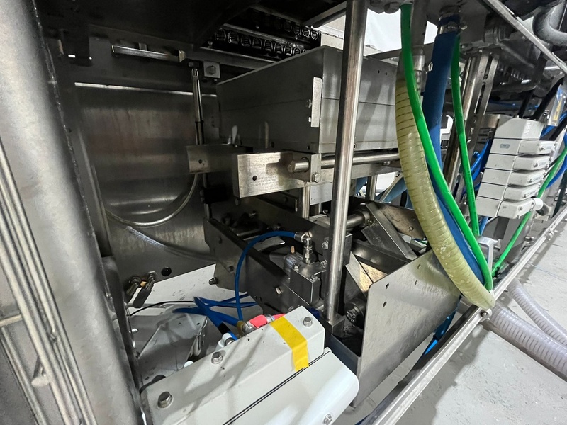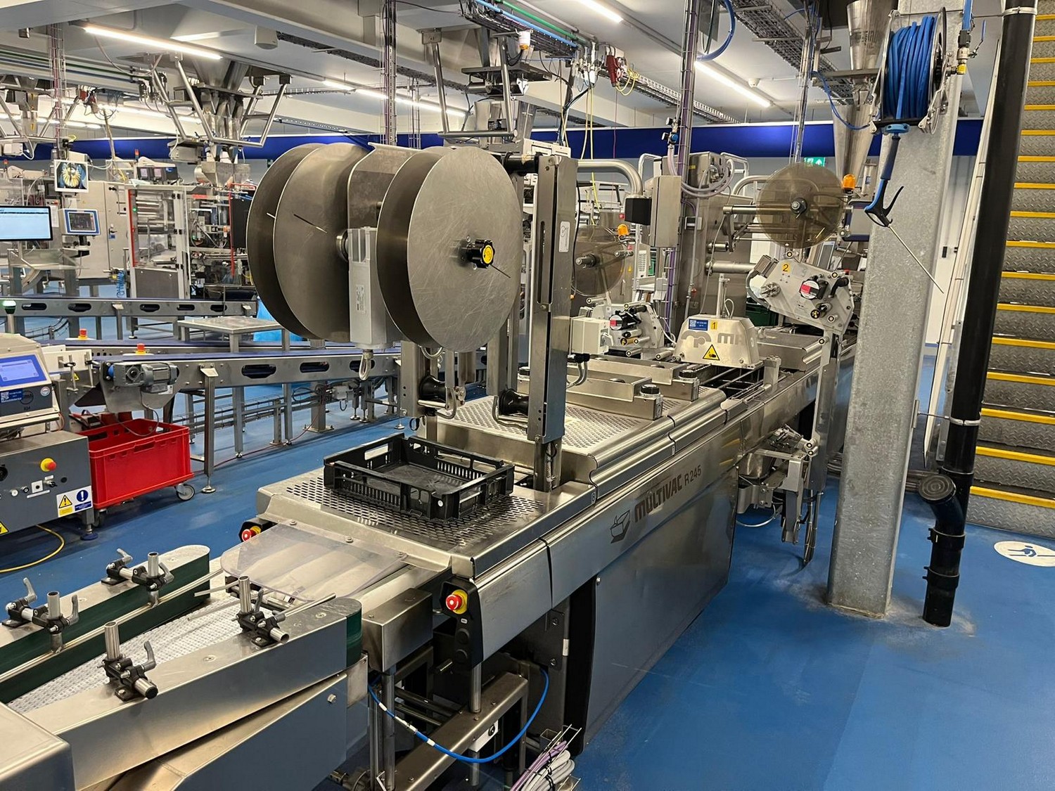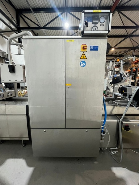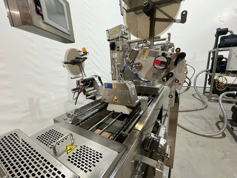 Multivac thermoformer, type: R245, machine number: 124685, year of construction: 2008, 400 V, 3 Ph, 50 Hz, 18 A, 7 kW, film width: 356 mm, dye: 100 mm x 90 mm, with batcher, Busch vacuum pump, total dimensions: 9090 mm x 1000 mm x 2500 mm. And pallet with parts. Without rollies and vacuum pump skid.