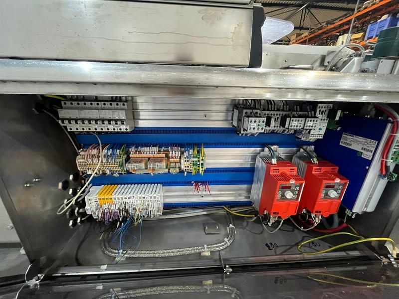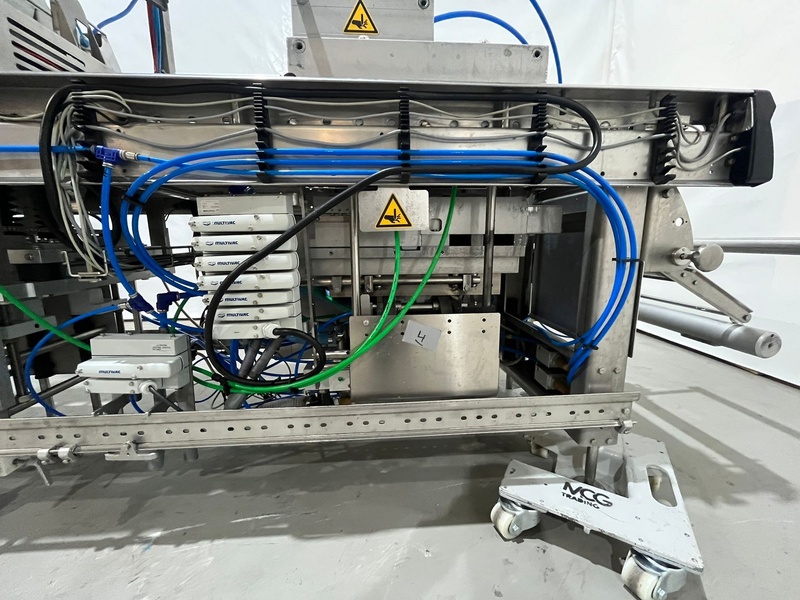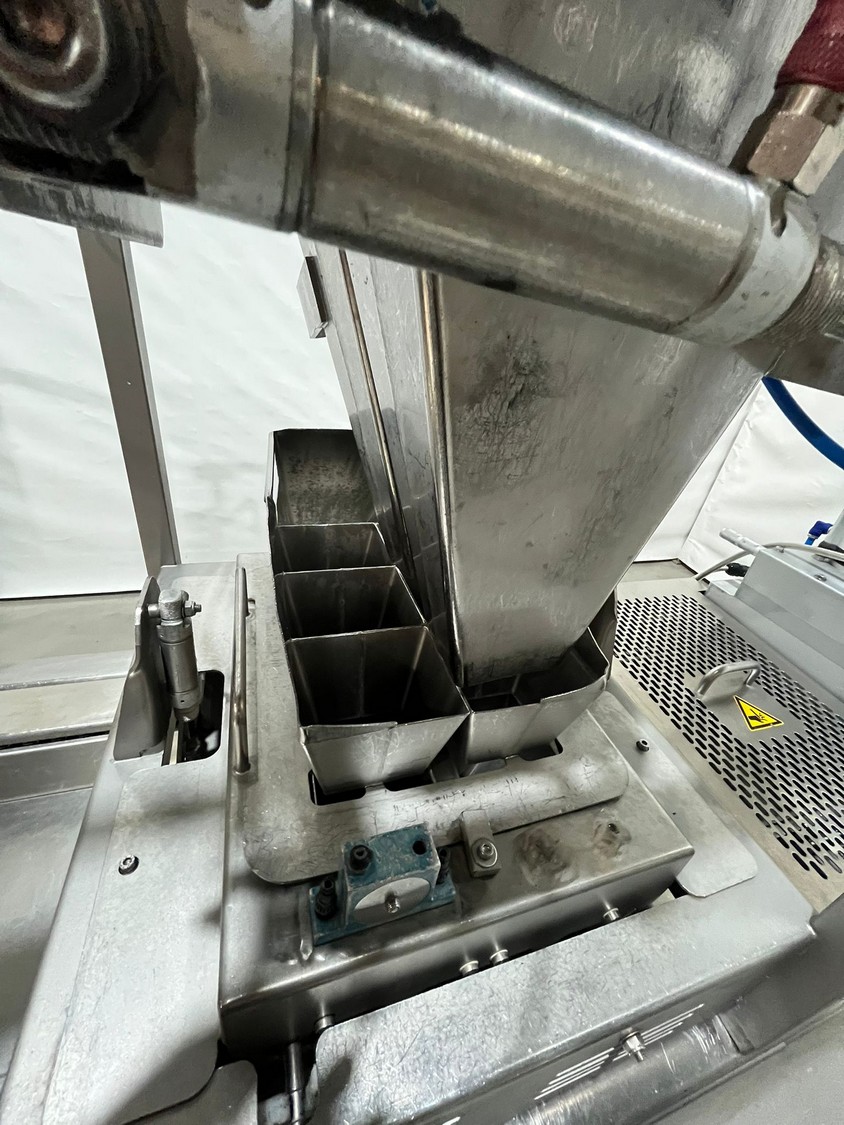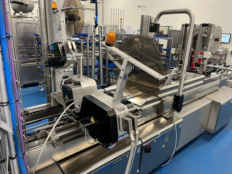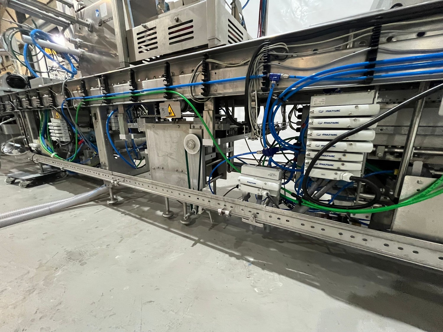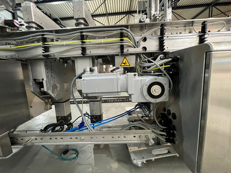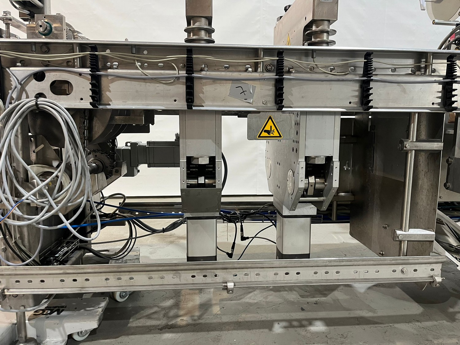 Multivac thermoformer, type: R245, machine number: 124685, year of construction: 2008, 400 V, 3 Ph, 50 Hz, 18 A, 7 kW, film width: 356 mm, dye: 100 mm x 90 mm, with batcher, Busch vacuum pump, total dimensions: 9090 mm x 1000 mm x 2500 mm. And pallet with parts. Without rollies and vacuum pump skid.