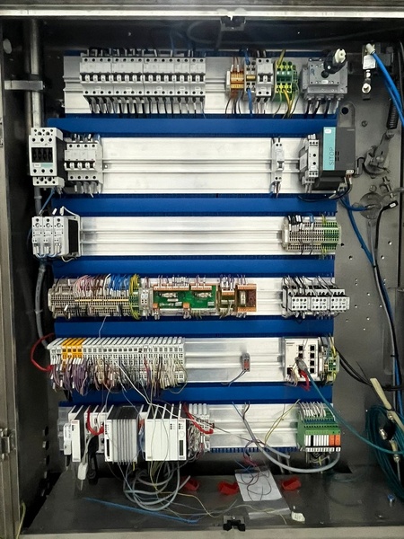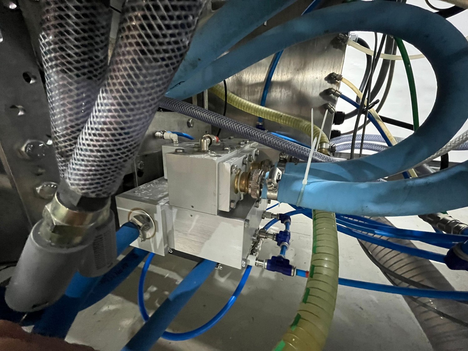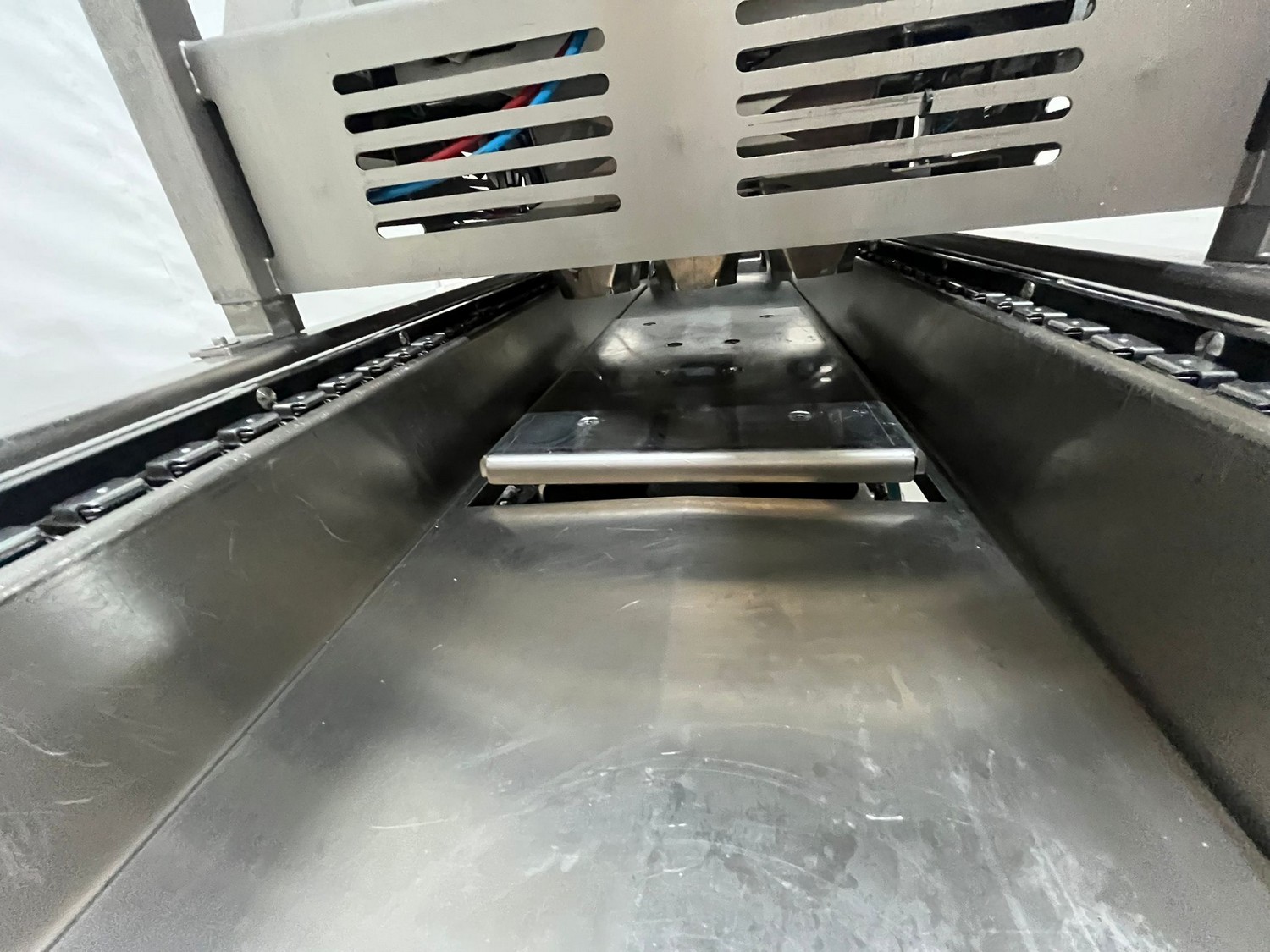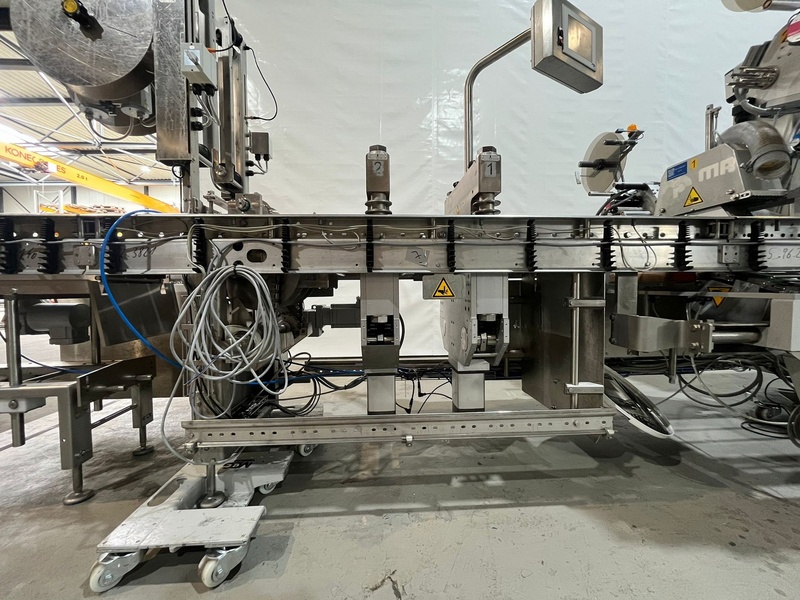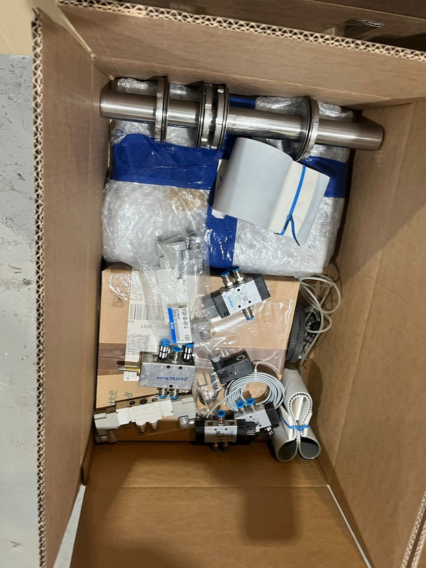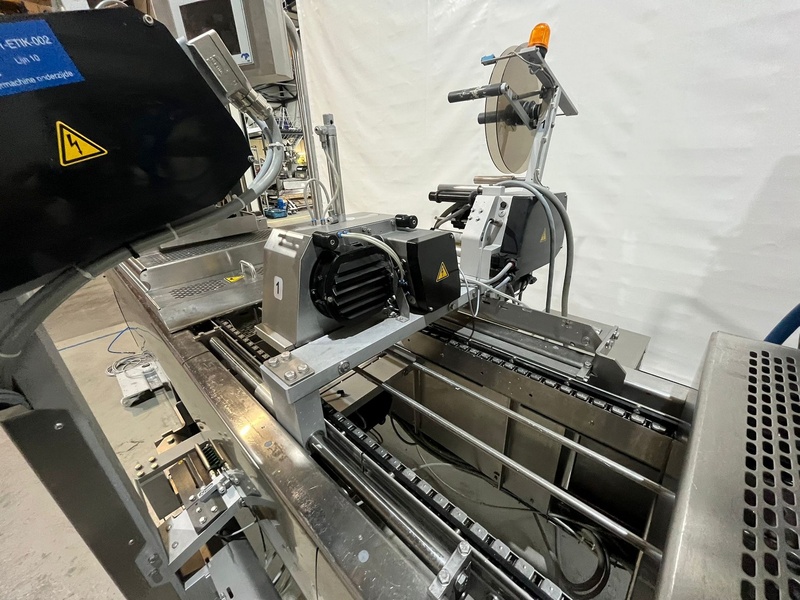 Multivac thermoformer, type: R245, machine number: 124685, year of construction: 2008, 400 V, 3 Ph, 50 Hz, 18 A, 7 kW, film width: 356 mm, dye: 100 mm x 90 mm, with batcher, Busch vacuum pump, total dimensions: 9090 mm x 1000 mm x 2500 mm. And pallet with parts. Without rollies and vacuum pump skid.
