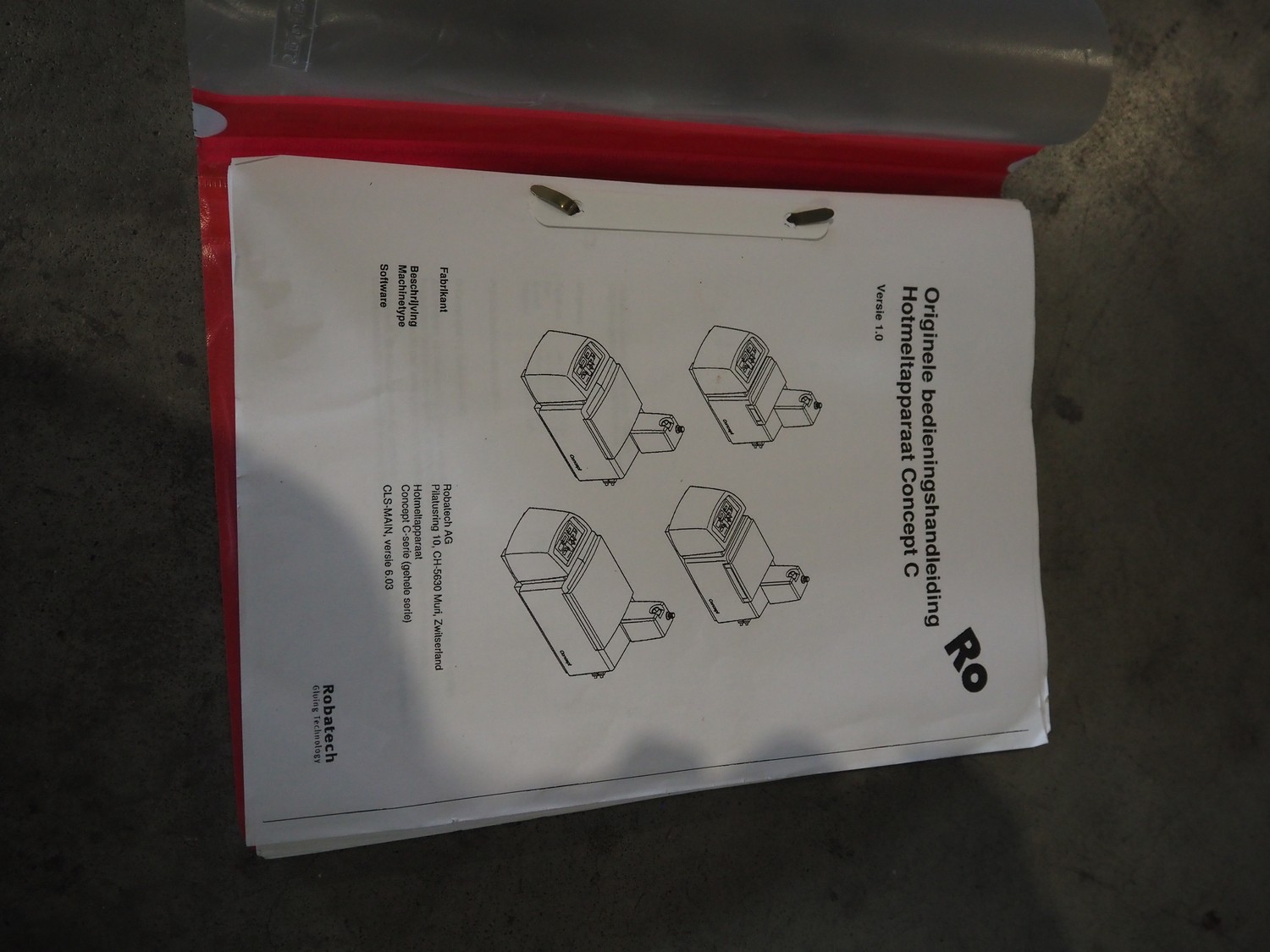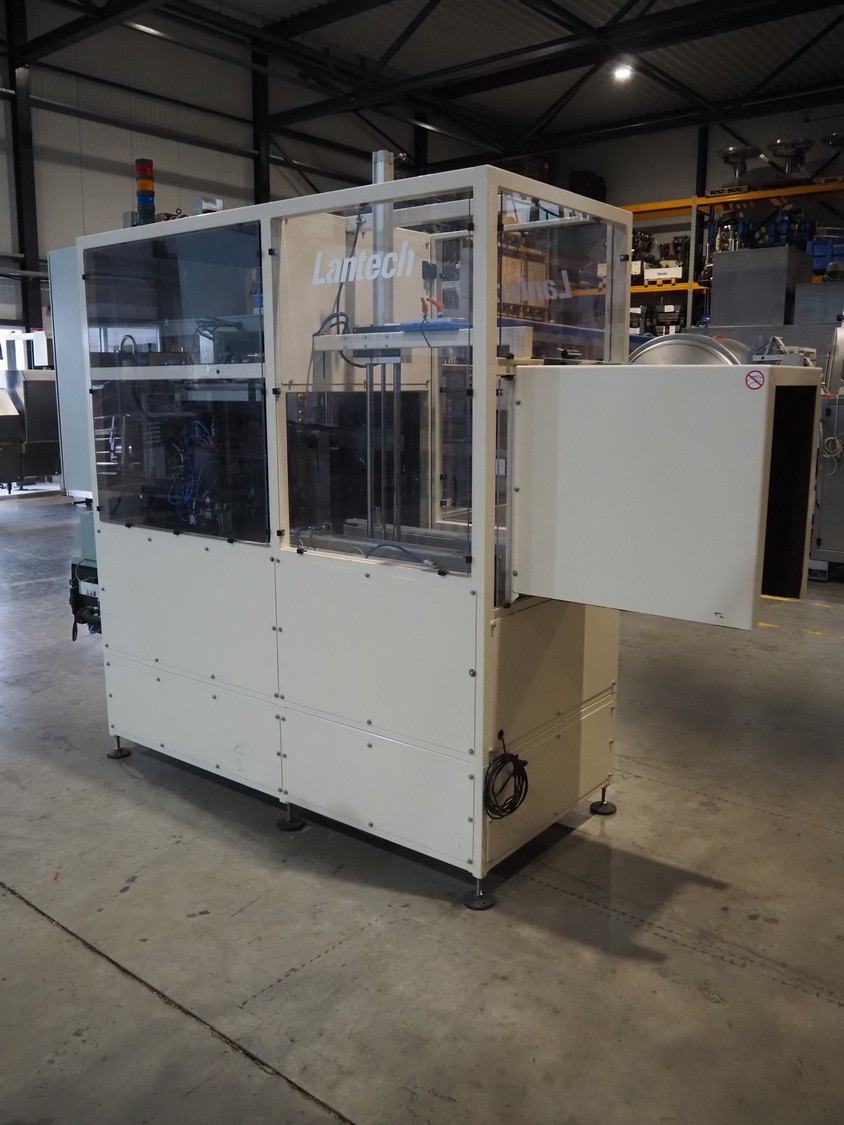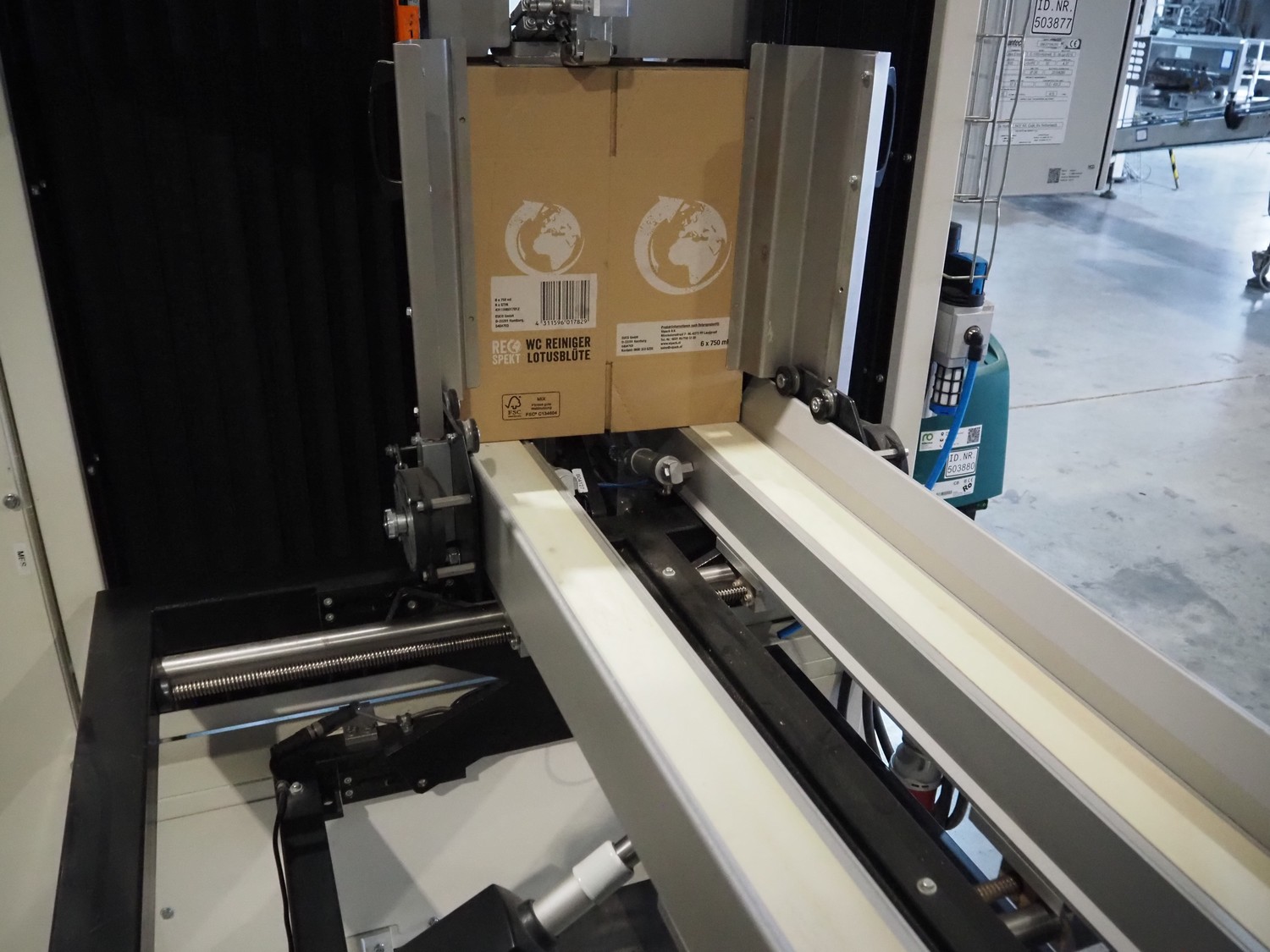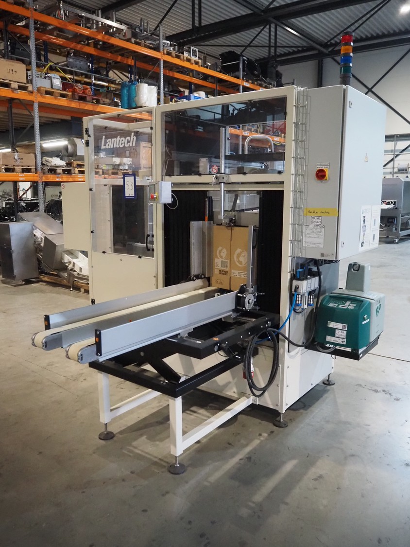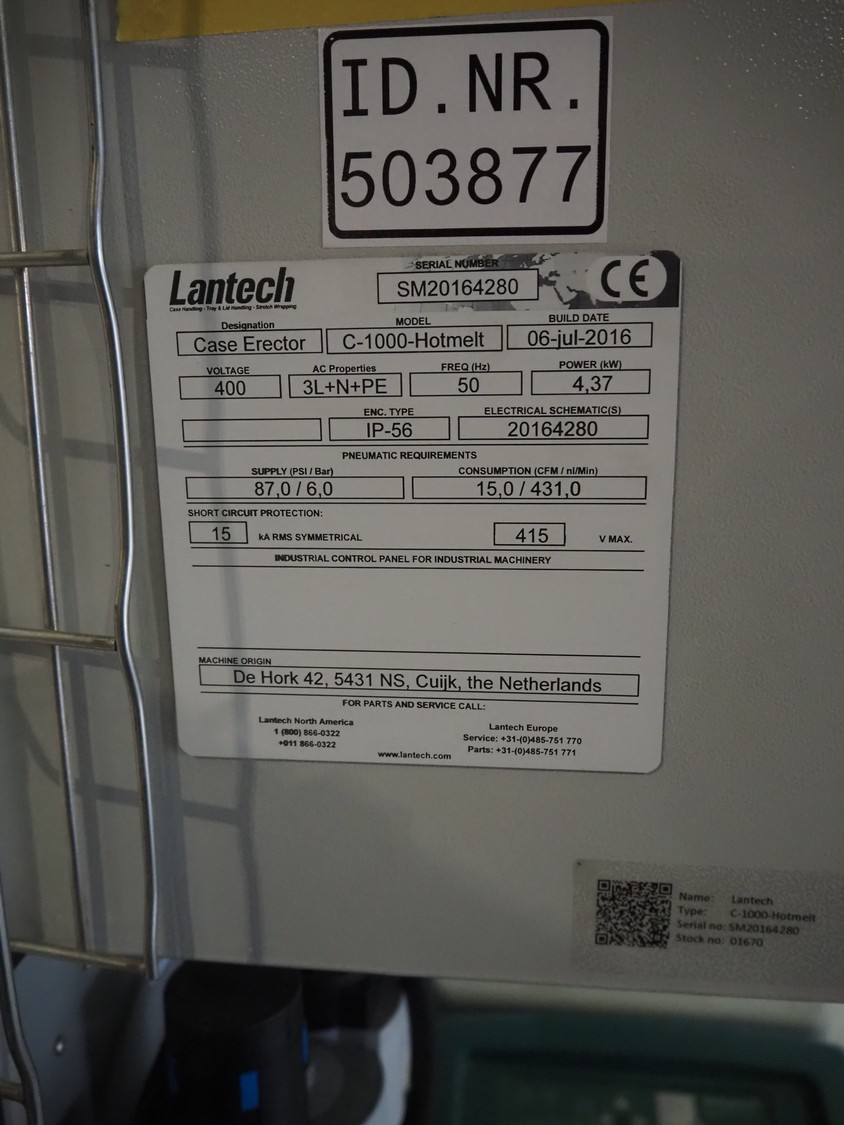 Lantech carton erecter, model C-1000-Hotmelt, serial number: SM20164280, year of construction: 06-jul-2016, 400 V, 3 Ph, 50 Hz, 4.37 kW, Robatech glue unit, type: Concept C 5/2, serial number: 11111103-001, year of construction: 2016, plastic belts, belt width: 65 mm, dimensions plano: 680 mm x 450 mm, total dimensions: 2400 mm x 2300 mm x 2600 mm.