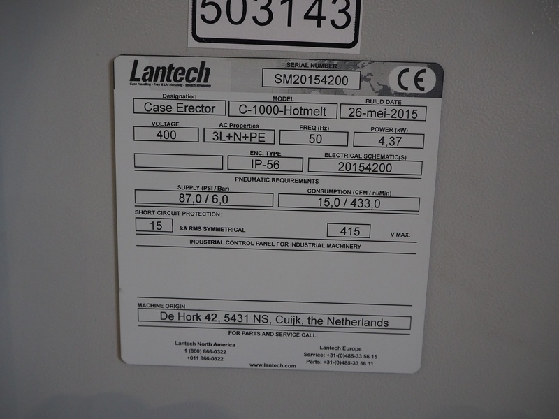 Lantech case erector, model: C-1000-Hotmelt, serial number: SM20154200, year of construction: 26 may 2015, 400 V, 3 Ph,50 Hz, 4.37 kW, air supply: 87.0 PSI / 6.0 Bar, Robatech glue unit, type: Concept C 5/2, plastic infeed belts, belt width: (2x) 65 mm, total dimensions: 3000 mm x 2300 mm x 2650 mm.