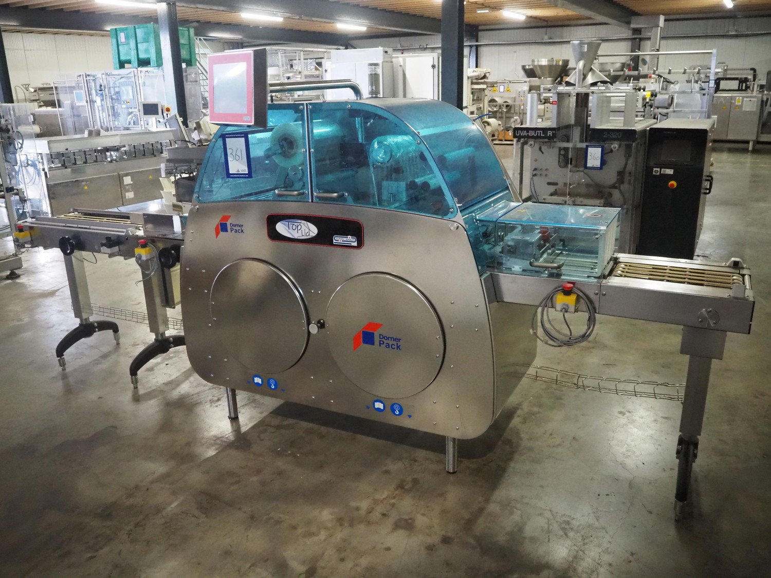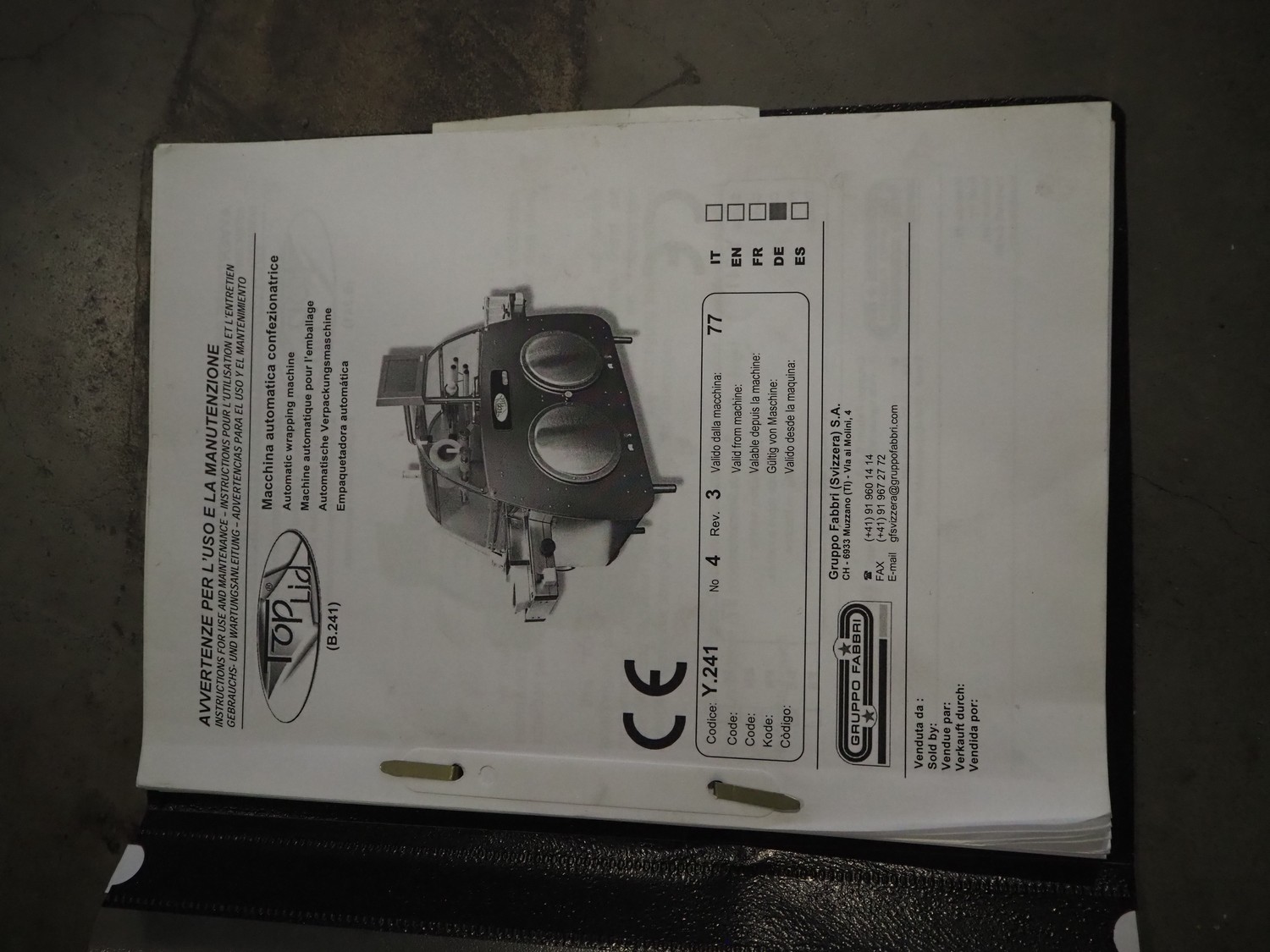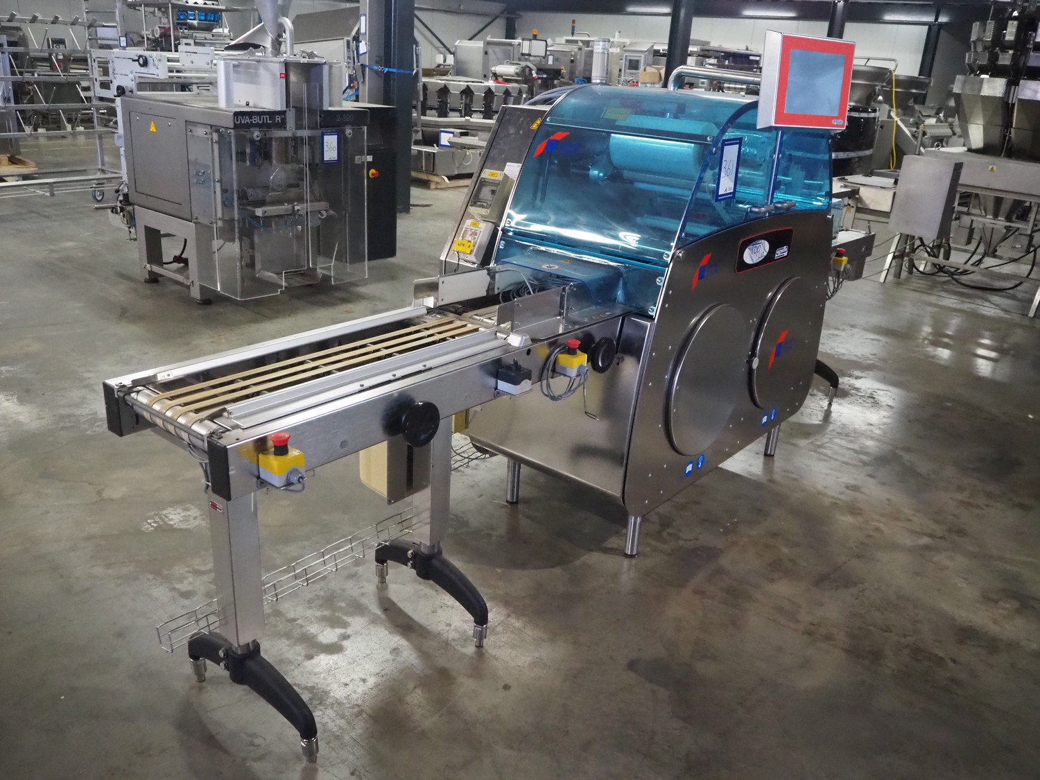 Gruppo Fabbri SA traysealer, model: B-241, serial number: 4-251, year of construction: 2012, 400 V, 3 Ph, 50-60 Hz, 10 A, weight: 610 kg, plastic string belt, belt width: 175 mm, dimensions dye: 300 mm x 240 mm, film width: 330 mm, total dimensions: 3830 mm x 950 mm x 1770 mm.