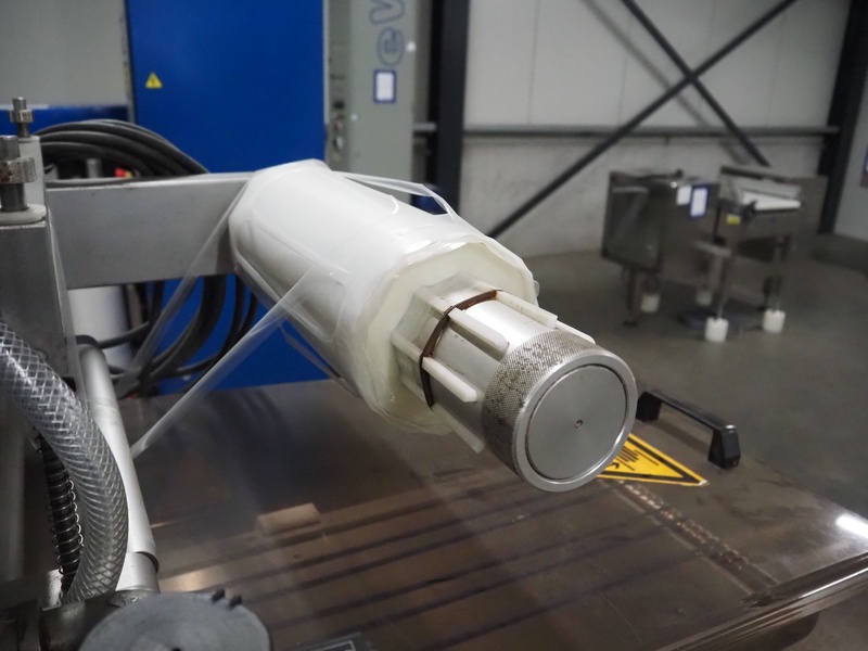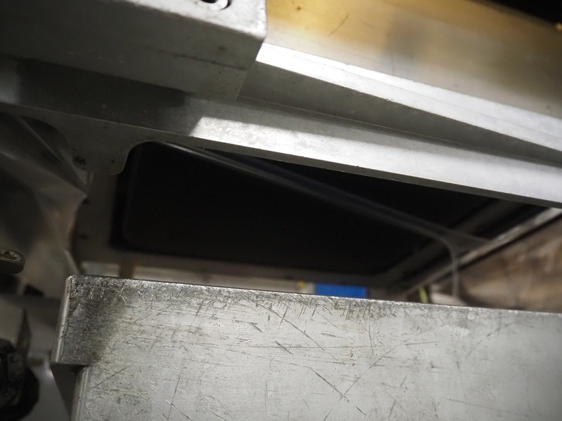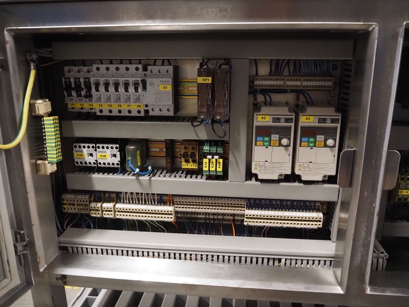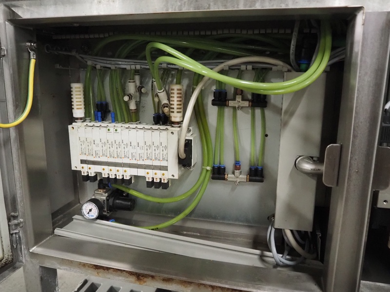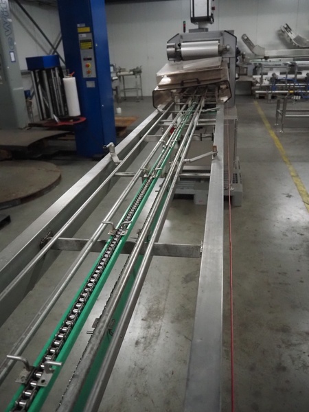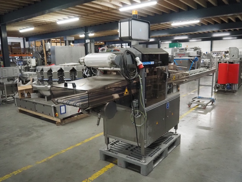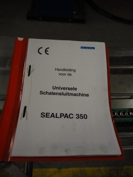 Sealpac traysealer, type: SEALPAC 350, serial number: TVG 0250801, year of construction: 2001, 400/230 V, 3 Ph, 3 kW, weight: 450 kg, dye dimensions: 300 mm x 250 mm, string outfeed belt, belt width: 230 mm, total dimensions: 5400 mm x 700 mm x 1900 mm. Without rollie.