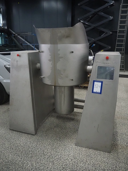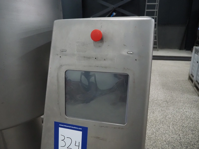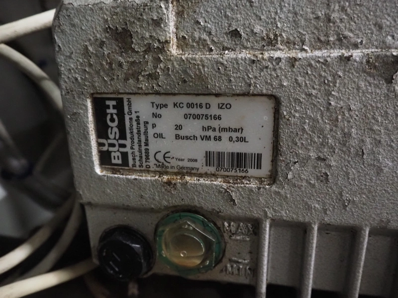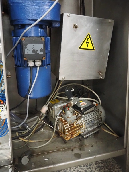 Rühle vacuum tumbler, Busch vacuum pump, type: KC 0016 D IZO, capacity: 16 m³ per hour, dimensions: 1950 mm x 1100 mm x 1920 mm. Incomplete, missing cooling compressor and lifter for 200 liter meat bins.