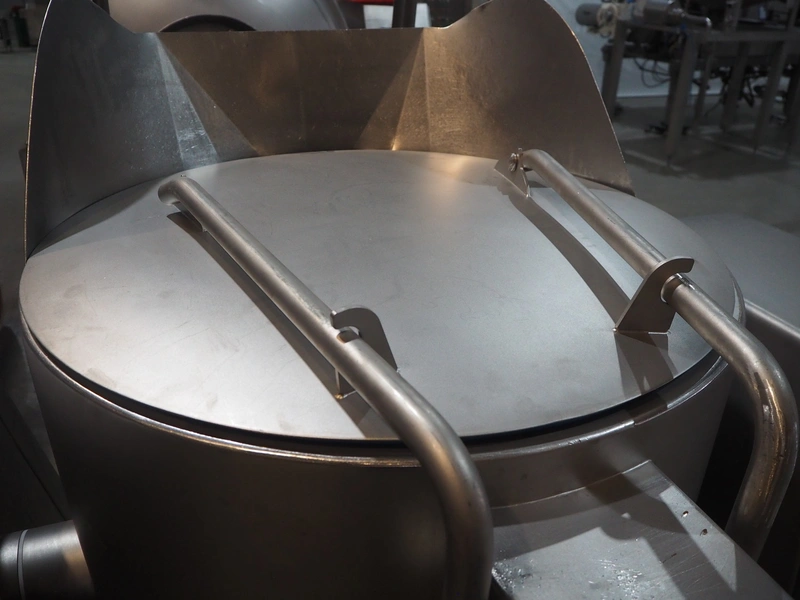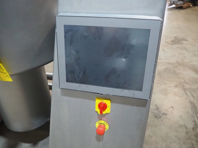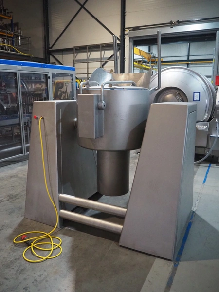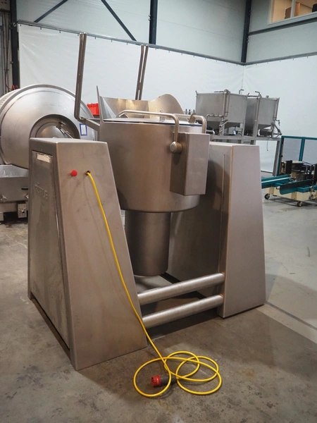 Rühle cooled vacuum tumbler with double lifter for 200 liter meat bins, Busch vacuum pump, type: KC 0016 E 3Z0 MMZZ, capacity: 16 m³ per hour, Rivacold cooling compressor, year of construction: 2025, total dimensions: 1900 mm x 1600 mm x 2400 mm.
