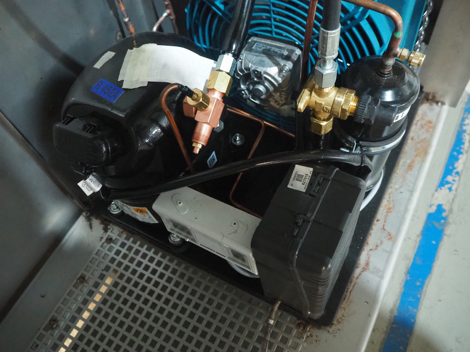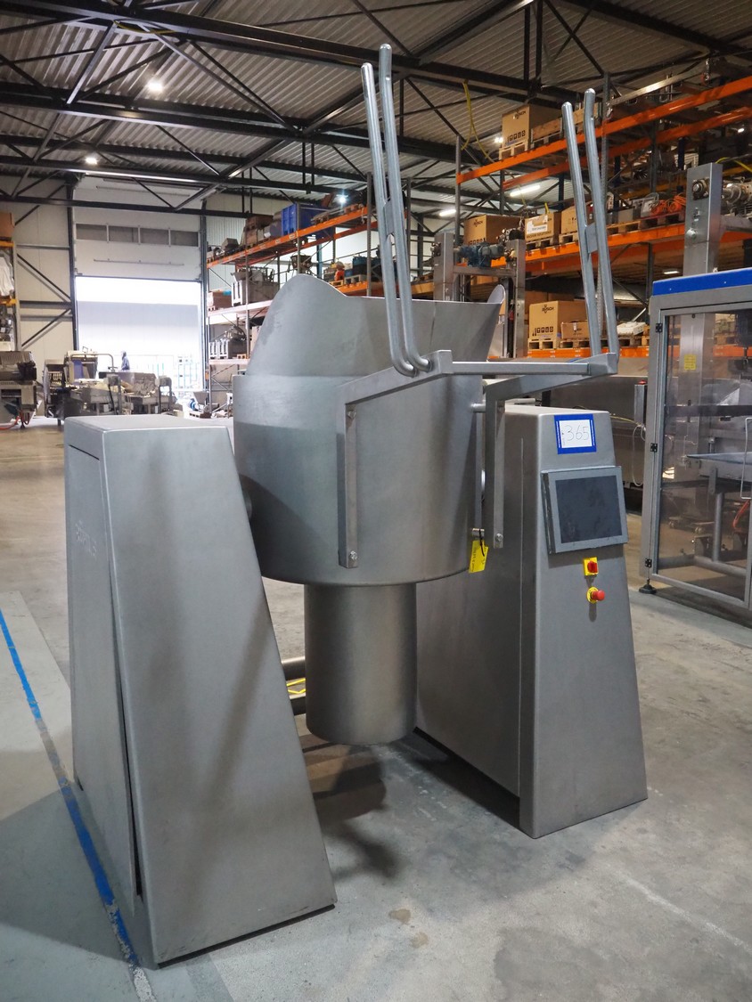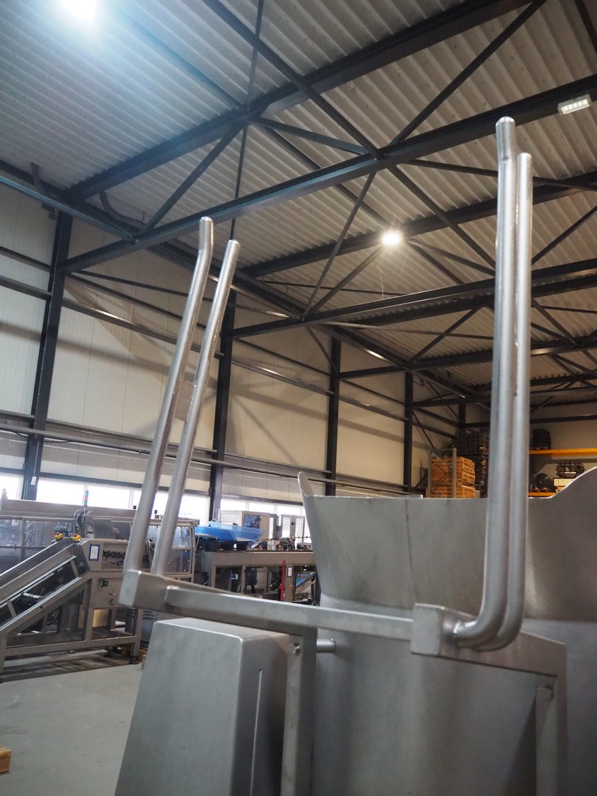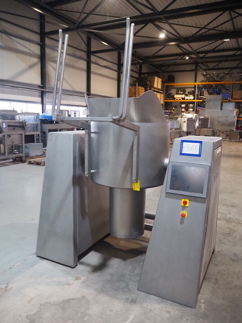 Rühle cooled vacuum tumbler with double lifter for 200 liter meat bins, Busch vacuum pump, type: KC 0016 E 3Z0 MMZZ, capacity: 16 m³ per hour, Rivacold cooling compressor, year of construction: 2025, total dimensions: 1900 mm x 1600 mm x 2400 mm.