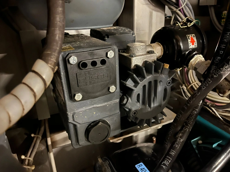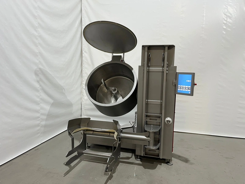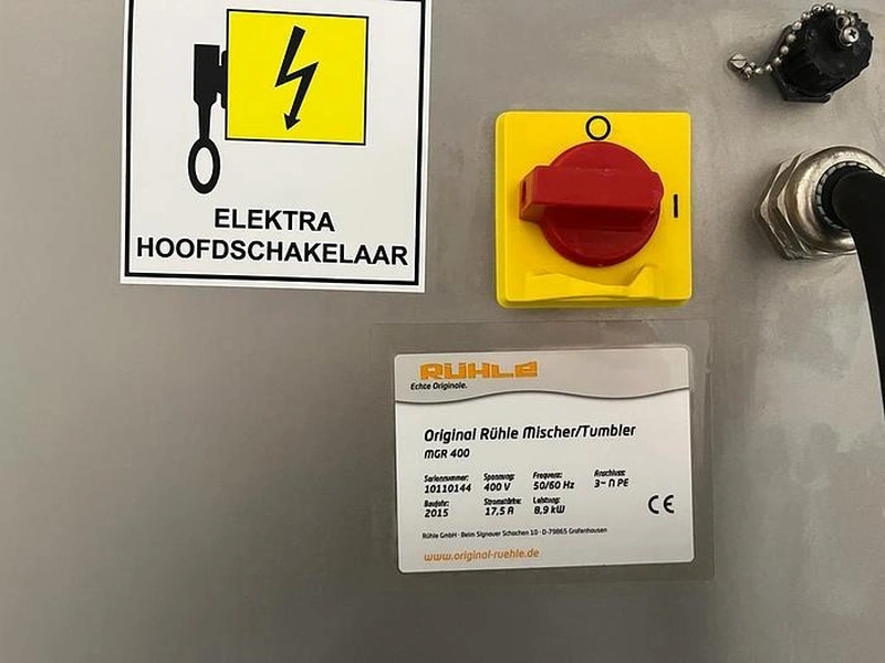Rühle cooled vacuum tumbler / mixer with lifter for 200 liter meat bins, model: MGR 400, serial number: 10110144, year of construction: 2015, 400 V, 50 Hz, 8.9 kW, volume: 400 liter, Busch vacuum pump, capacity: 10 m³ per hour, dimensions: 2200 mm x 2100 mm x 2200 mm.
