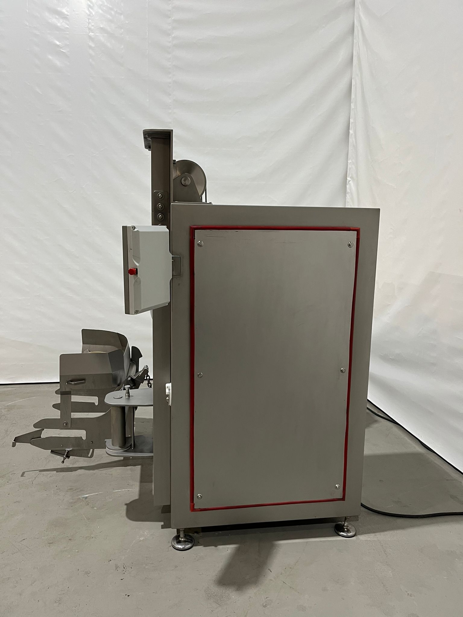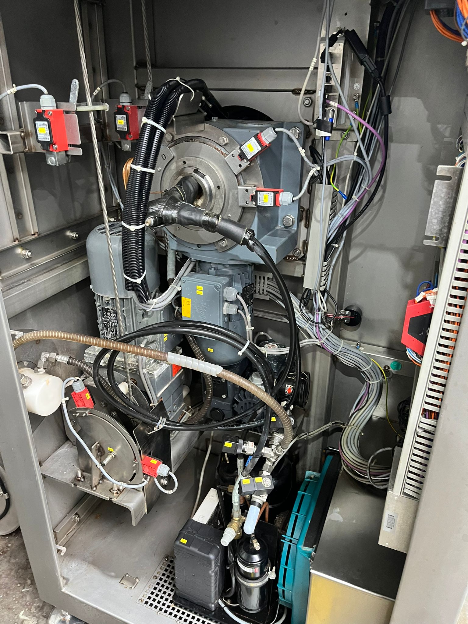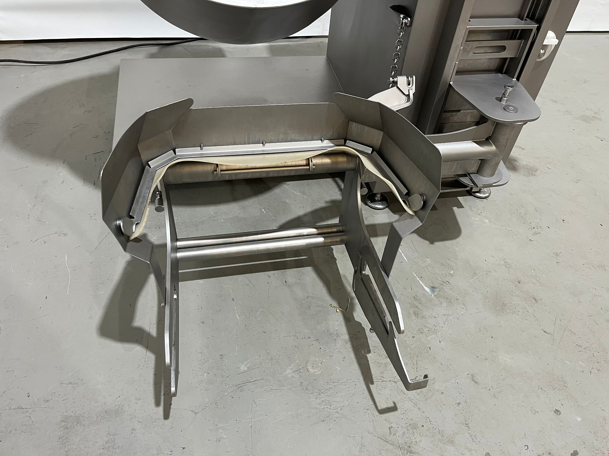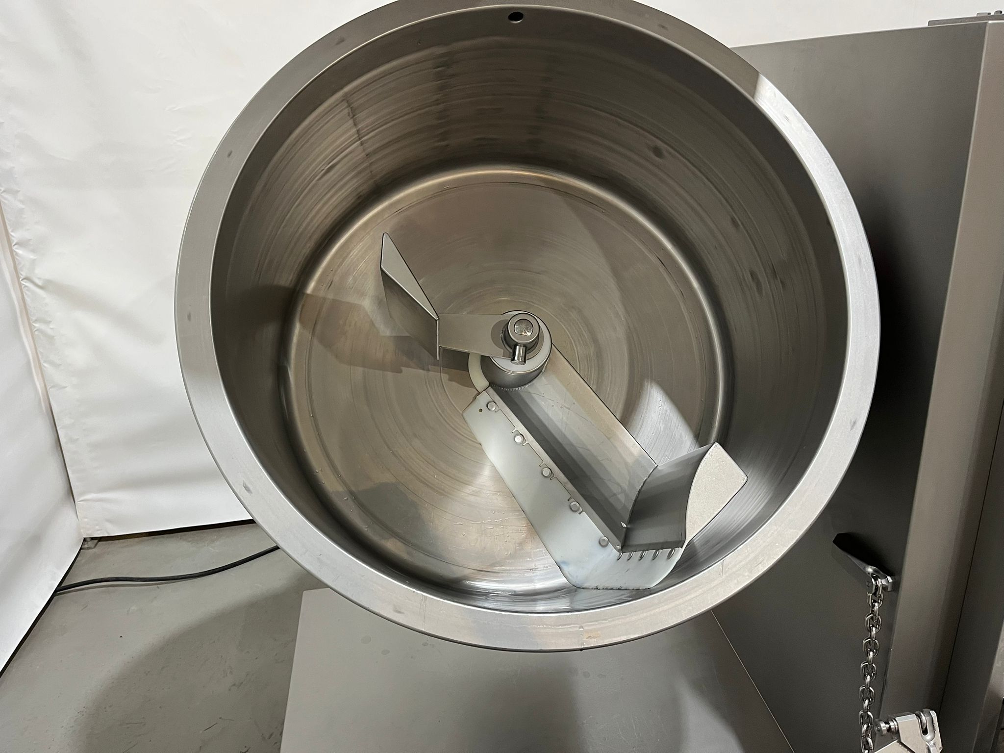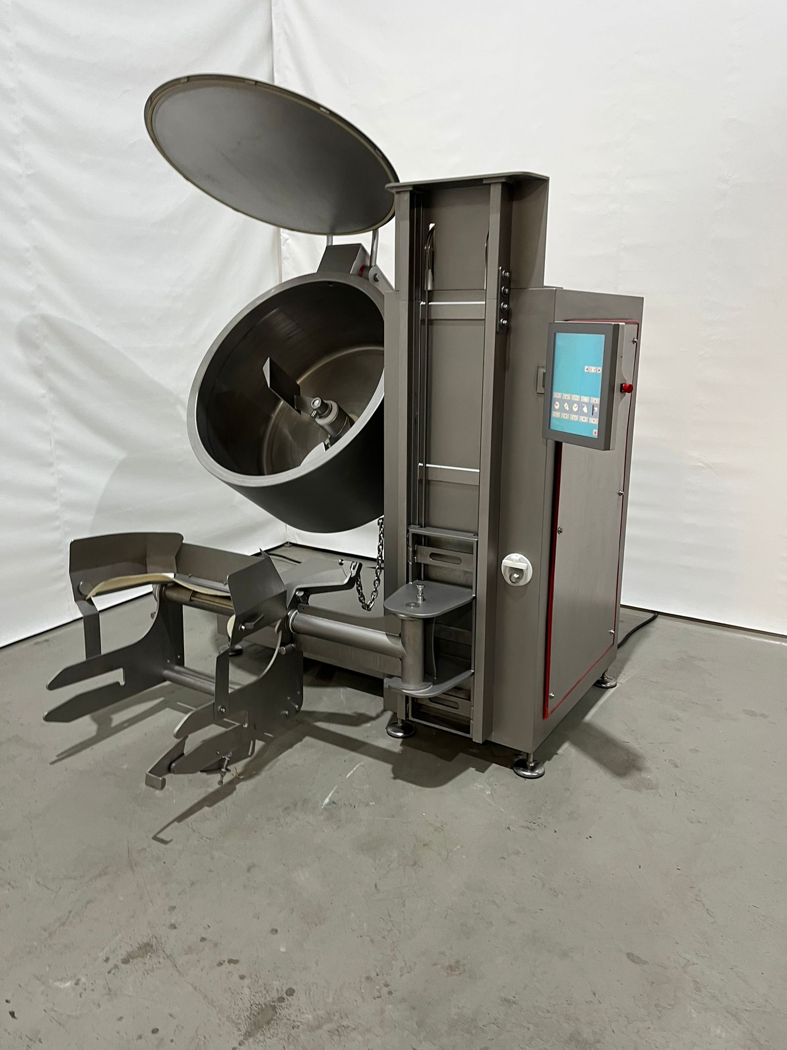 Rühle cooled vacuum tumbler / mixer with lifter for 200 liter meat bins, model: MGR 400, serial number: 10110144, year of construction: 2015, 400 V, 50 Hz, 8.9 kW, volume: 400 liter, Busch vacuum pump, capacity: 10 m³ per hour, dimensions: 2200 mm x 2100 mm x 2200 mm.