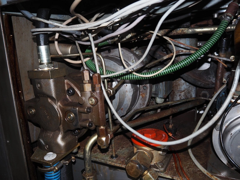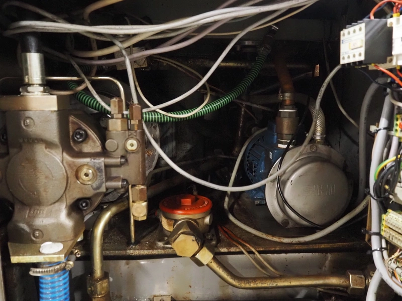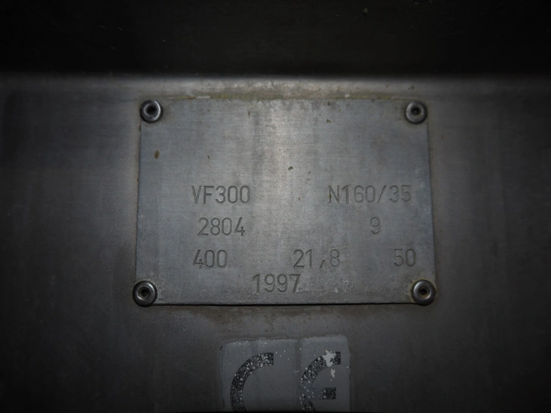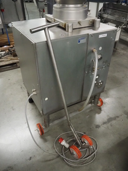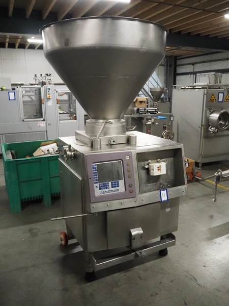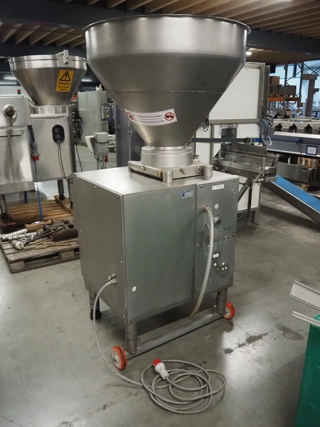 Handtmann mobile vacuum filling machine, type: VF300, number: 2804, year of construction: 1997, 400 V, 50 Hz, 21.8 A, 9 kW, dimensions: 1150 mm x 950 mm x 2050 mm. Incomplete.