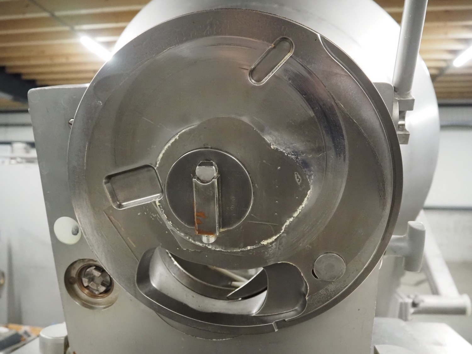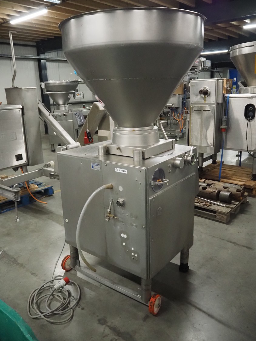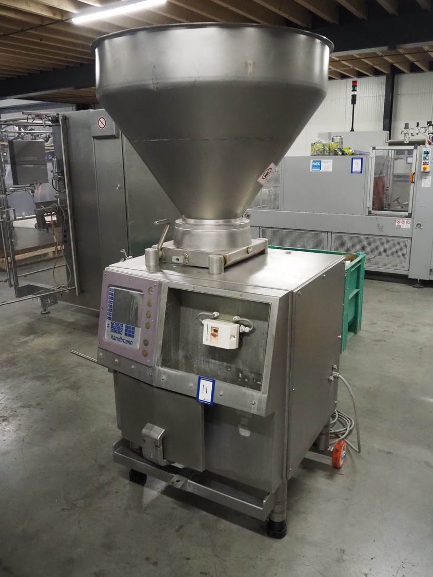 Handtmann mobile vacuum filling machine, type: VF300, number: 2804, year of construction: 1997, 400 V, 50 Hz, 21.8 A, 9 kW, dimensions: 1150 mm x 950 mm x 2050 mm. Incomplete.
