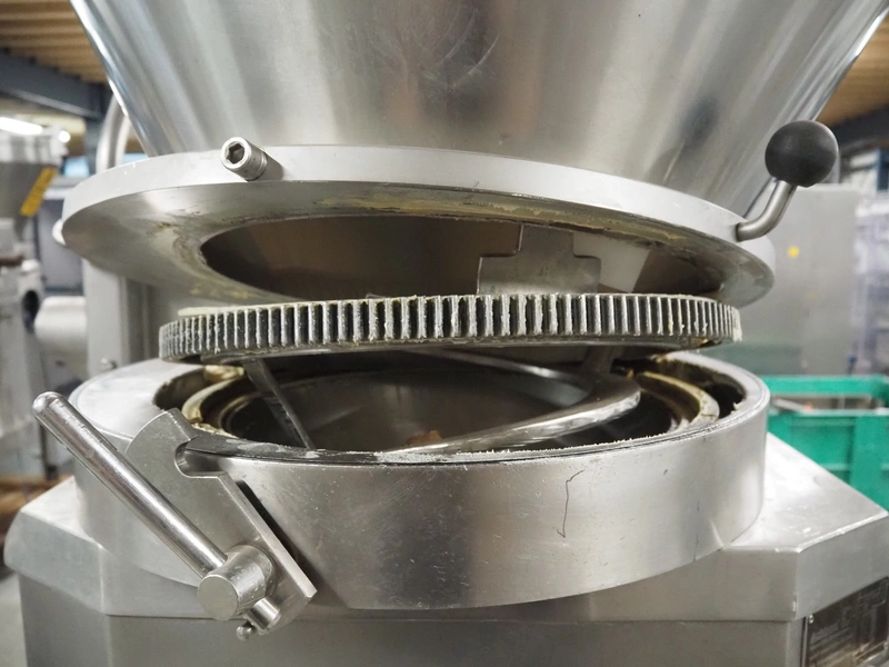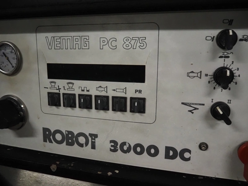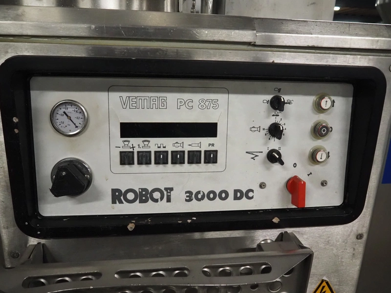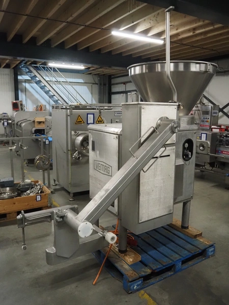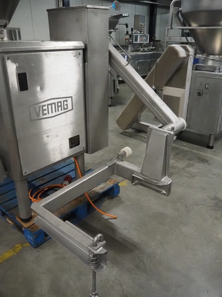 Vemag vacuum filling machine with lifter for 200 liter meat bins, model: Robot 3000DC, type: 124, number: 1240611-1, 380 V, 3 Ph, 29/63 A, dimensions: 2100 mm x 1200 mm x 2350 mm. Incomplete.