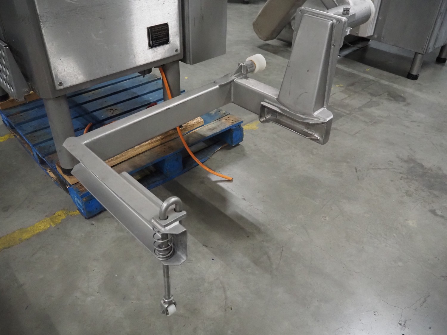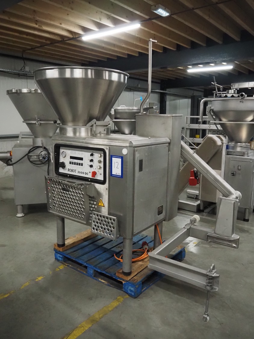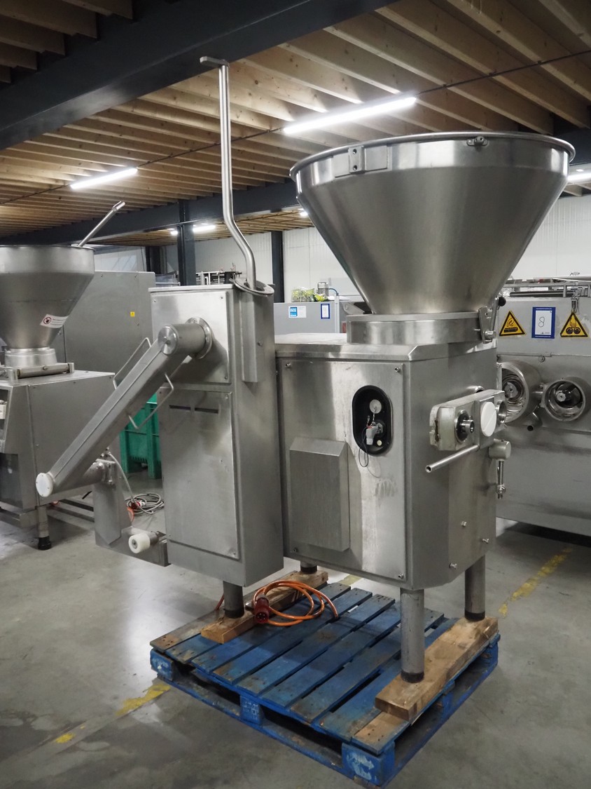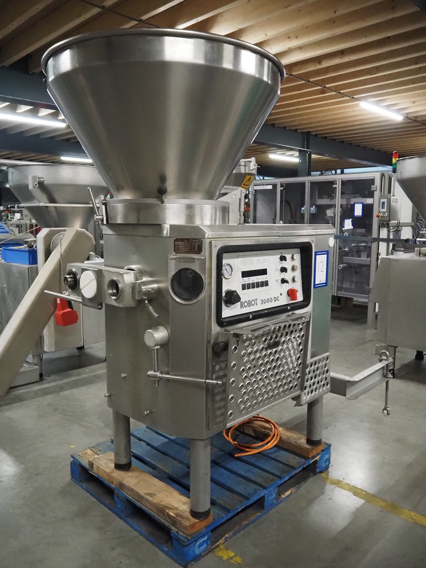 Vemag vacuum filling machine with lifter for 200 liter meat bins, model: Robot 3000DC, type: 124, number: 1240611-1, 380 V, 3 Ph, 29/63 A, dimensions: 2100 mm x 1200 mm x 2350 mm. Incomplete.