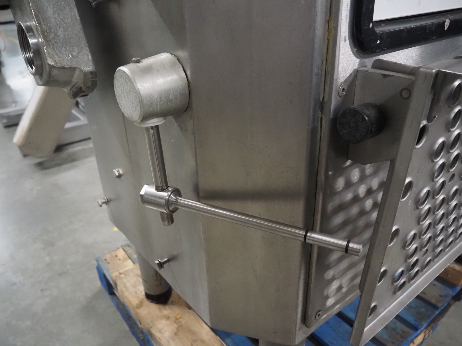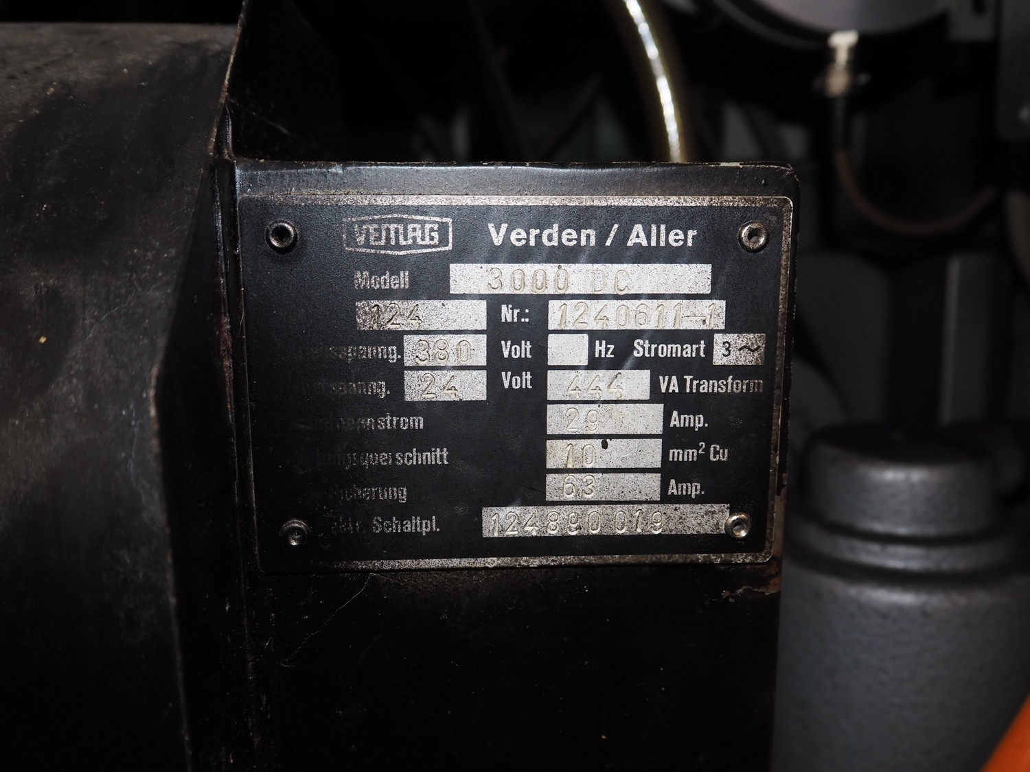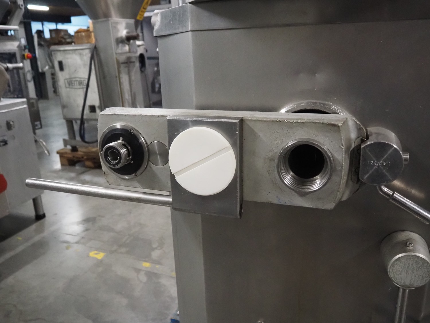 Vemag vacuum filling machine with lifter for 200 liter meat bins, model: Robot 3000DC, type: 124, number: 1240611-1, 380 V, 3 Ph, 29/63 A, dimensions: 2100 mm x 1200 mm x 2350 mm. Incomplete.