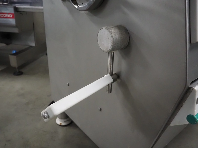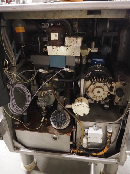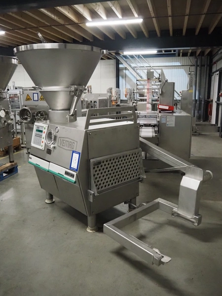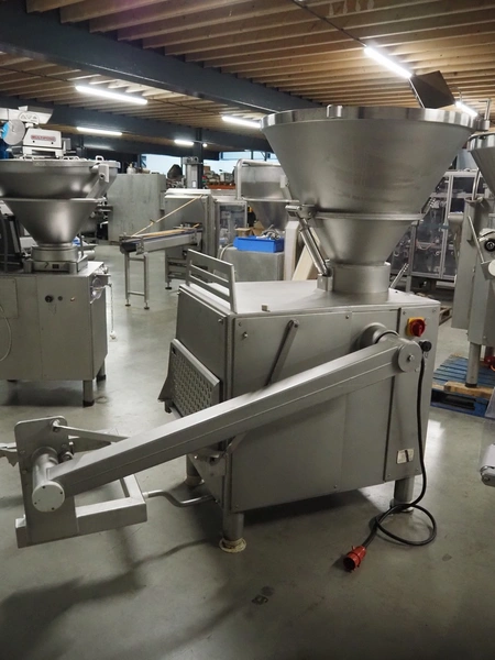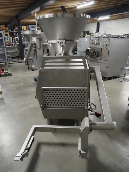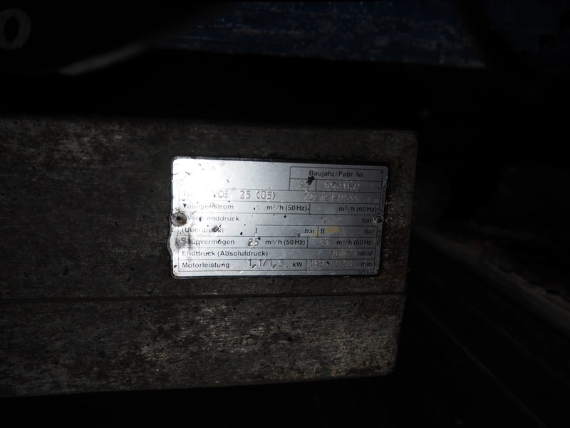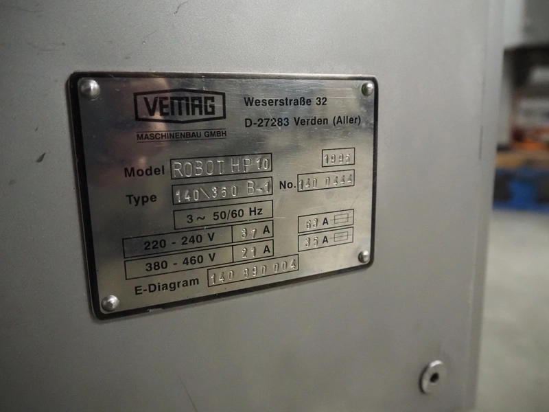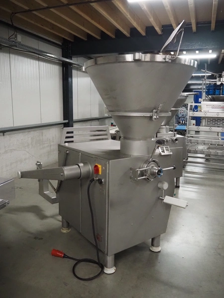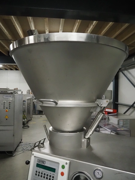 Vemag vacuum filling machine with lifter for 200 liter meat bins, model: ROBOT HP10, type: 140/350 B-1, number: 140 0444, year of construction: 1995, 220-460 V, 3 Ph, 50/60 Hz, 21/63 A, with Rietschle vacuum pump, type: VCE 25, number: 1569062, dimensions: 2100 mm x 1200 mm x 2350 mm.