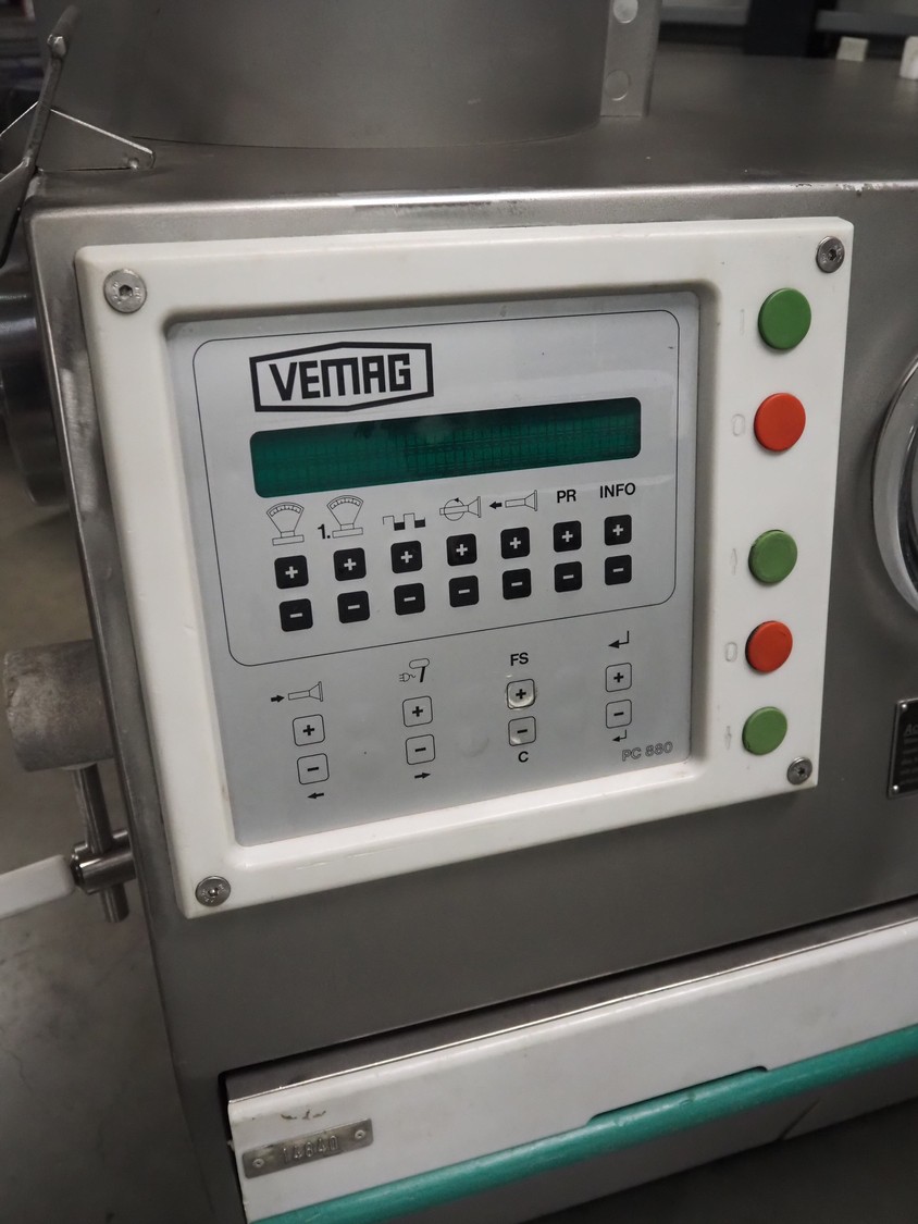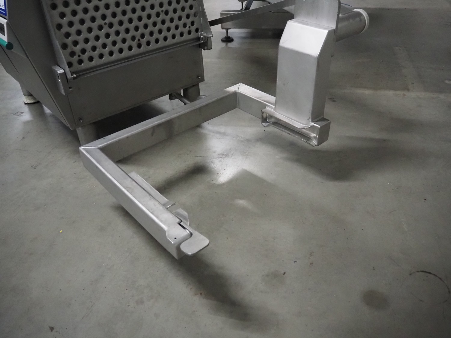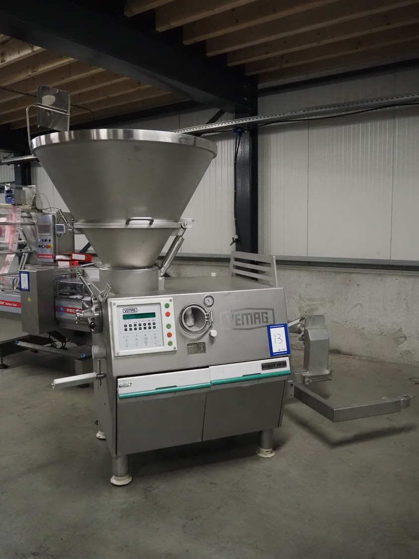 Vemag vacuum filling machine with lifter for 200 liter meat bins, model: ROBOT HP10, type: 140/350 B-1, number: 140 0444, year of construction: 1995, 220-460 V, 3 Ph, 50/60 Hz, 21/63 A, with Rietschle vacuum pump, type: VCE 25, number: 1569062, dimensions: 2100 mm x 1200 mm x 2350 mm.