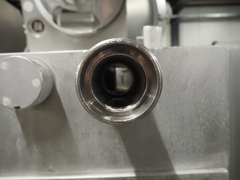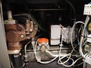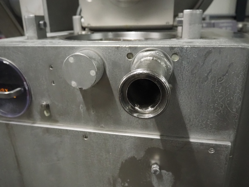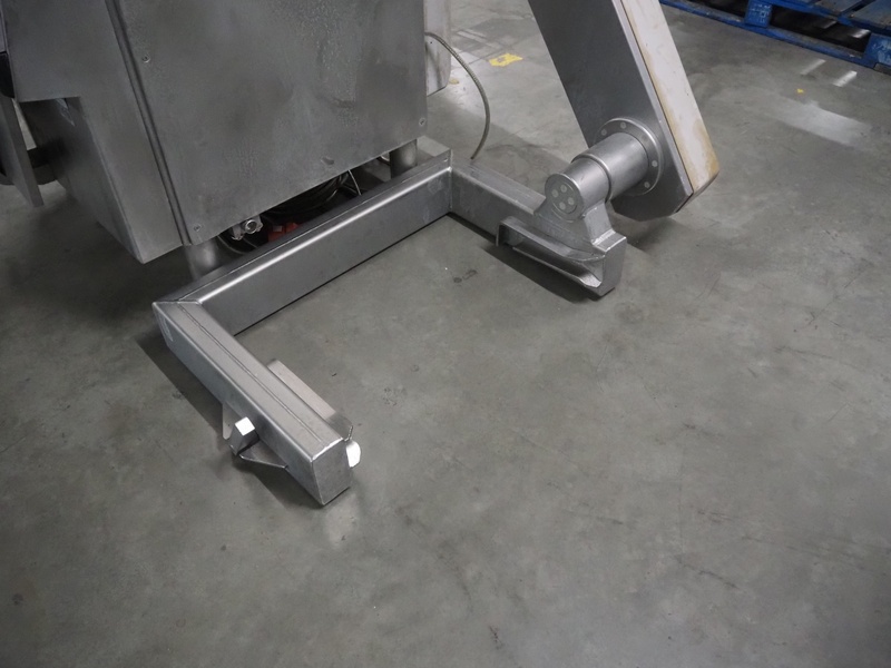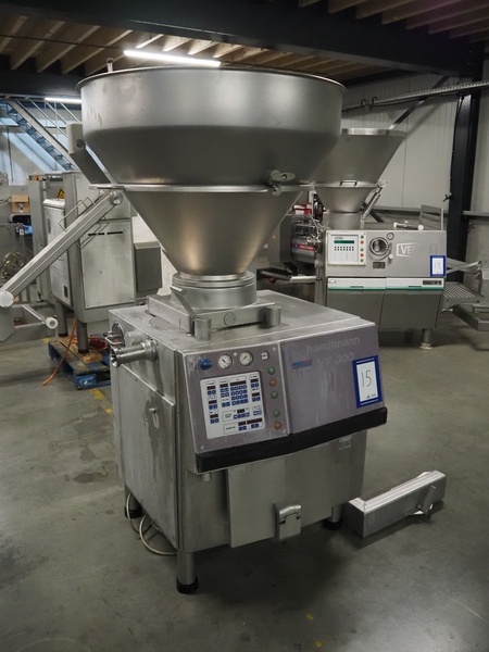 Handtmann vacuum filling machine with lifter for meat bins, type: VF300B, number: 2645, 400 V, 50 Hz, 23.6 A, 9.5 kW, Becker vacuum pump, type: U 1.16SA-31, number: B 2678255, year of construction: 2012, capacity: 16 m³ per hour, dimensions: 1700 mm x 1400 mm x 1970 mm.