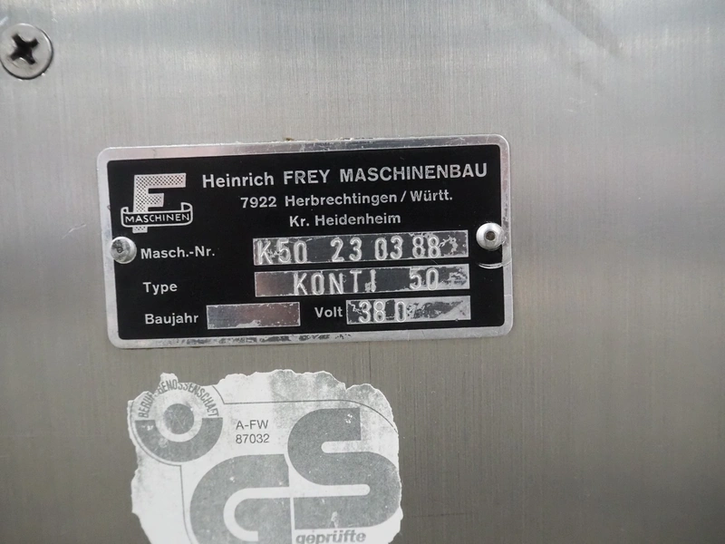 Frey vacuum filling machine, type: Konti 50, machine number: K50 23 03 88, 380 V, dimensions: 750 mm x 900 mm x 1450 mm.