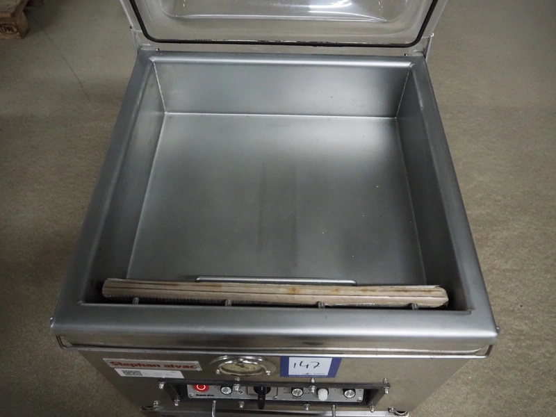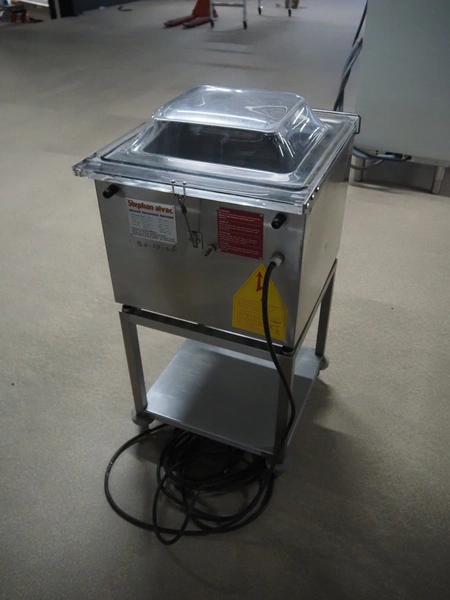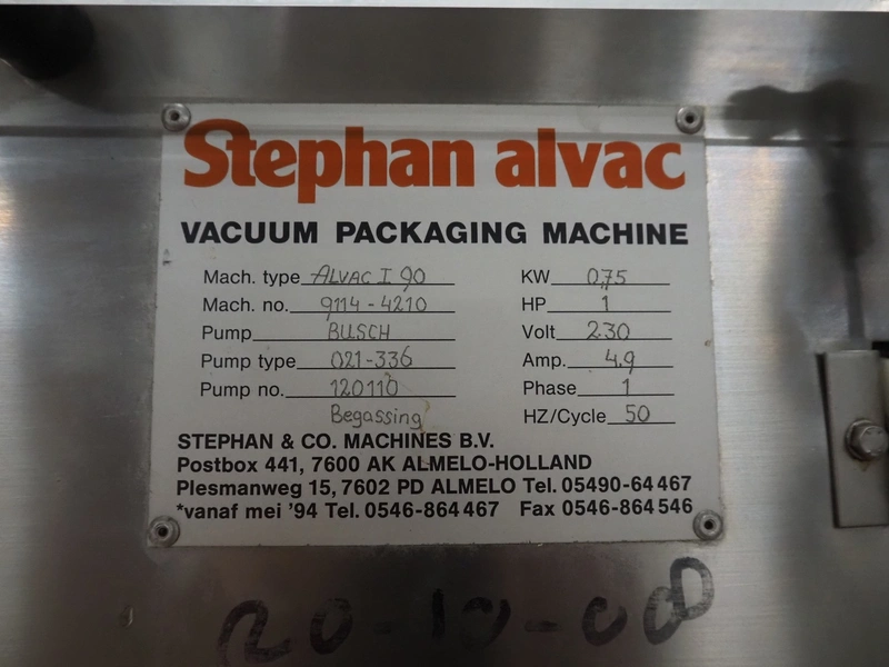 Stephan alvac vacuum machine on mobile s/s frame, type: Alvac I 90, machine number: 9114-4210, 230 V, 1 Ph, 50 Hz, 4.9 A, 0.75 kW, Busch vacuum pump, type: 021-336, seal length: 420 mm, dimensions chamber: 430 mm x 380 mm, total dimensions: 500 mm x 480 mm x 1070 mm.
