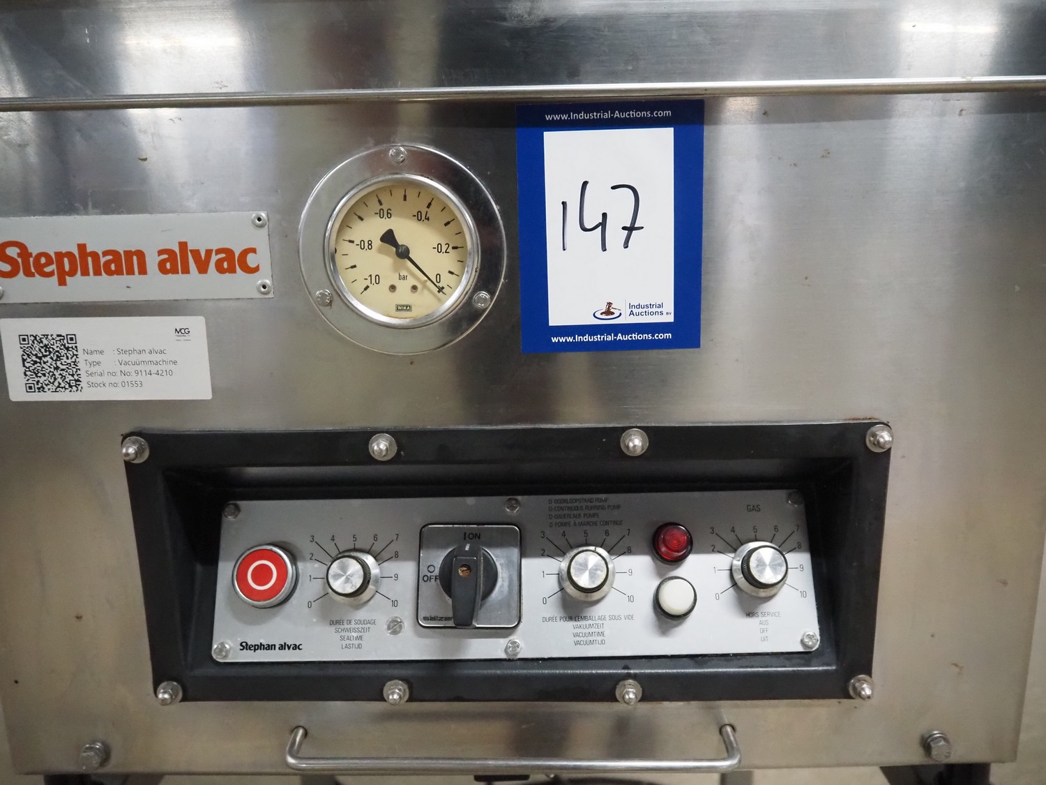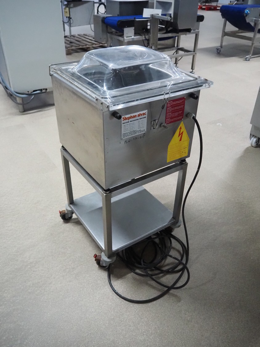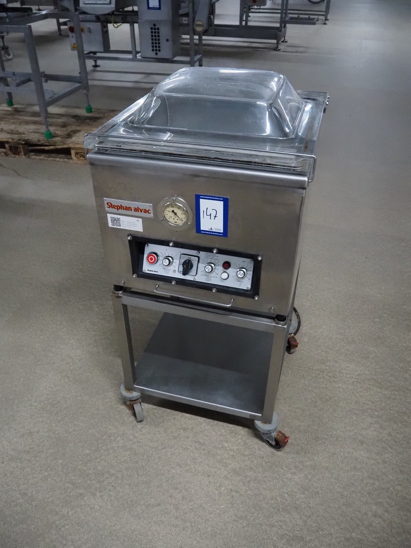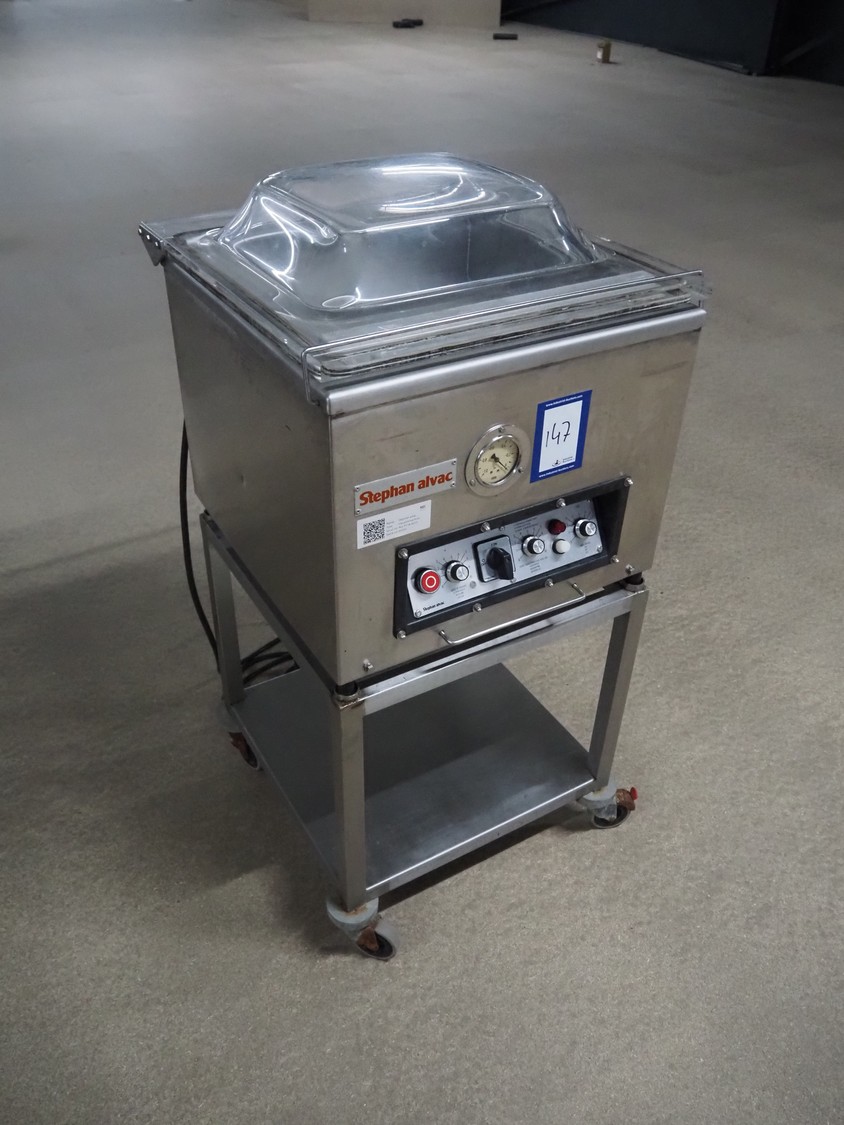 Stephan alvac vacuum machine on mobile s/s frame, type: Alvac I 90, machine number: 9114-4210, 230 V, 1 Ph, 50 Hz, 4.9 A, 0.75 kW, Busch vacuum pump, type: 021-336, seal length: 420 mm, dimensions chamber: 430 mm x 380 mm, total dimensions: 500 mm x 480 mm x 1070 mm.