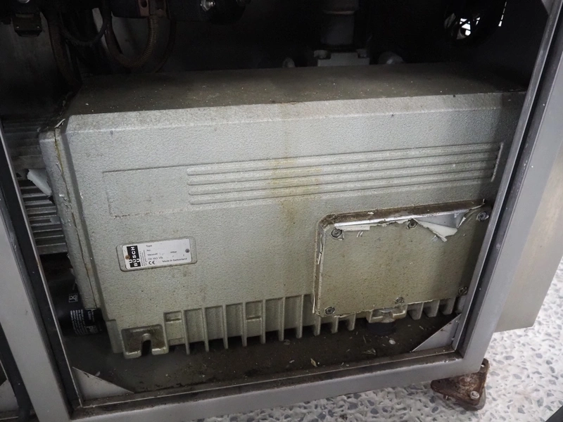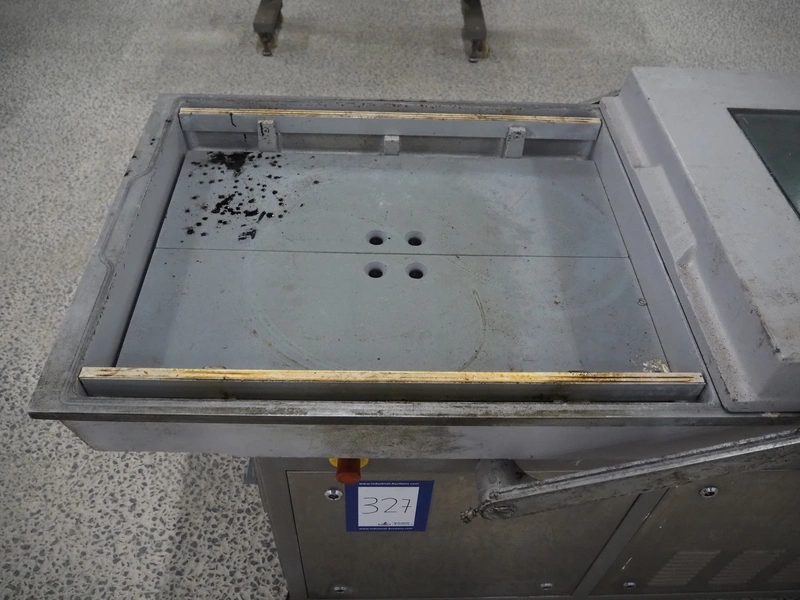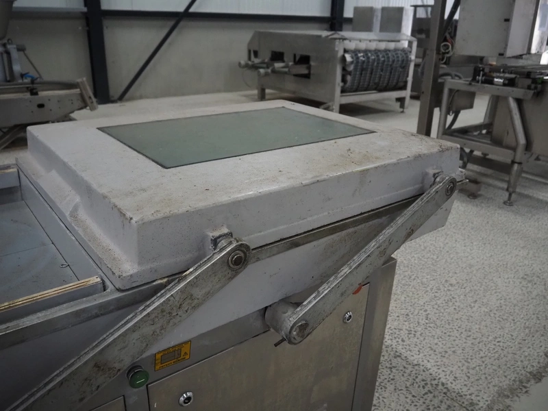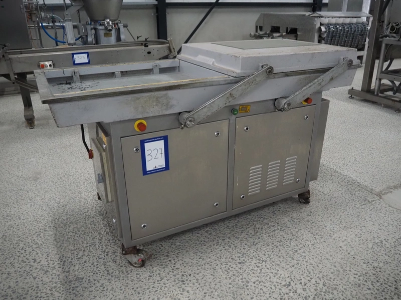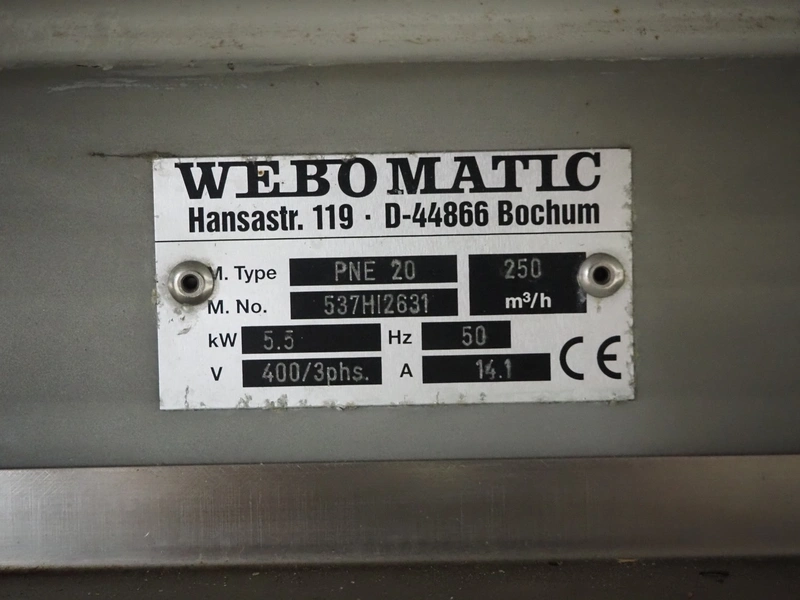 Webomatic mobile double chamber vacuum machine, type: PNE 20, machine number: 537HI2631, 400 V, 3 Ph, 50 Hz, 14.1 A, 5.5 kW, seal length: (4x) 850 mm, chamber dimensions: (2x) 850 mm x 720 mm, Busch vacuum pump, type: RA 0250 D 561 CUXX, capacity: 250 m³ per hour, total dimensions: 1870 mm x 850 mm x 1100 mm.