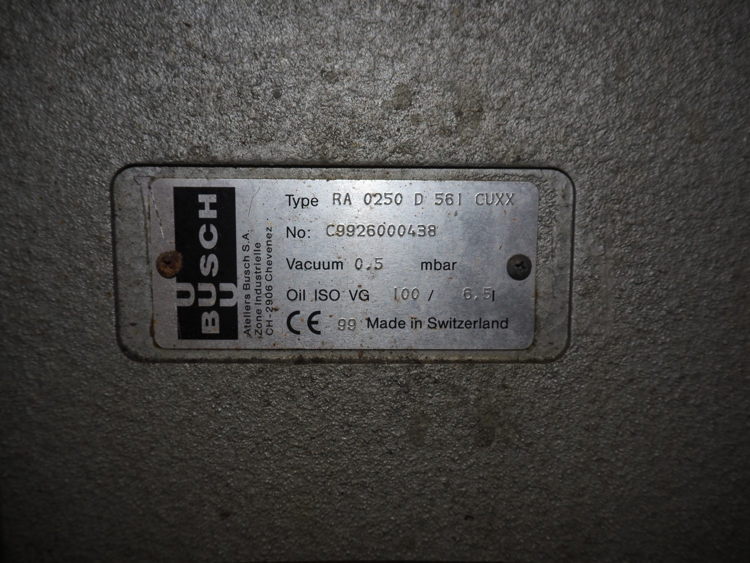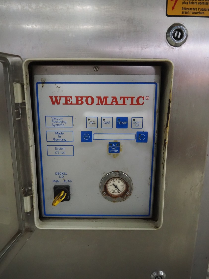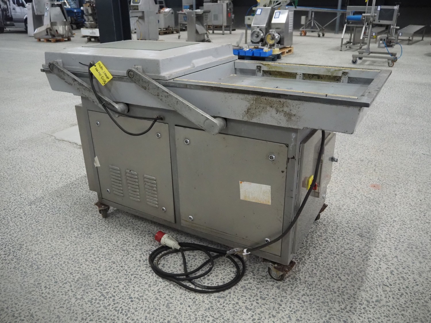 Webomatic mobile double chamber vacuum machine, type: PNE 20, machine number: 537HI2631, 400 V, 3 Ph, 50 Hz, 14.1 A, 5.5 kW, seal length: (4x) 850 mm, chamber dimensions: (2x) 850 mm x 720 mm, Busch vacuum pump, type: RA 0250 D 561 CUXX, capacity: 250 m³ per hour, total dimensions: 1870 mm x 850 mm x 1100 mm.