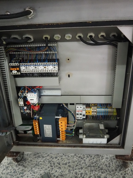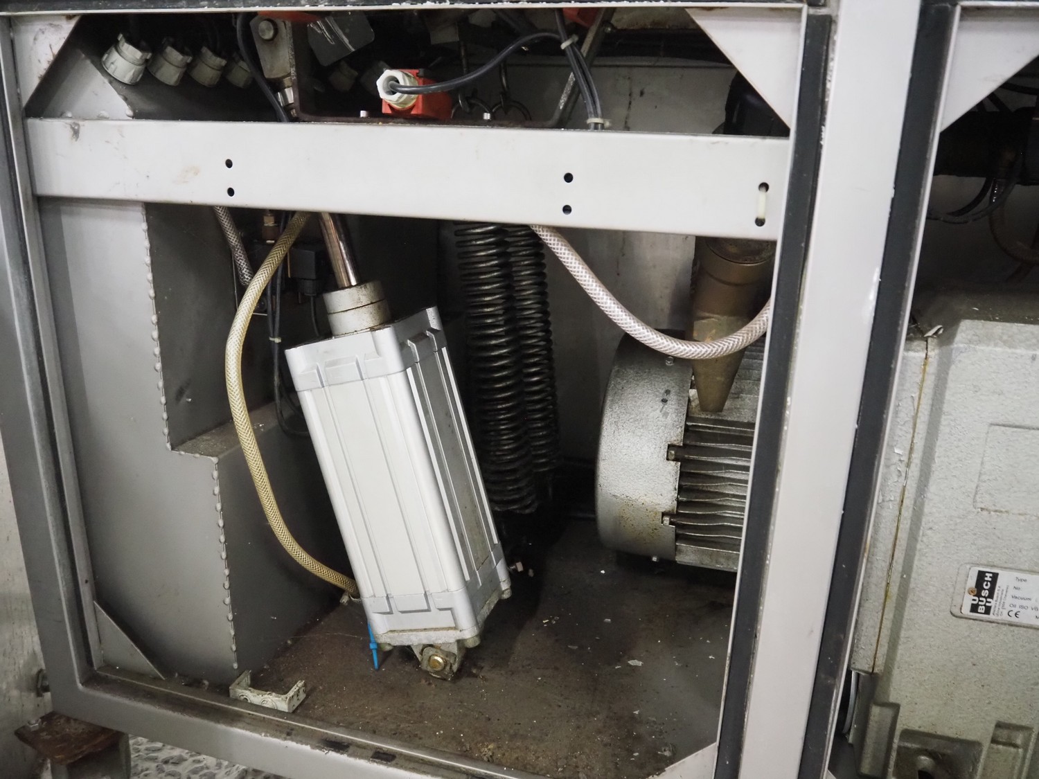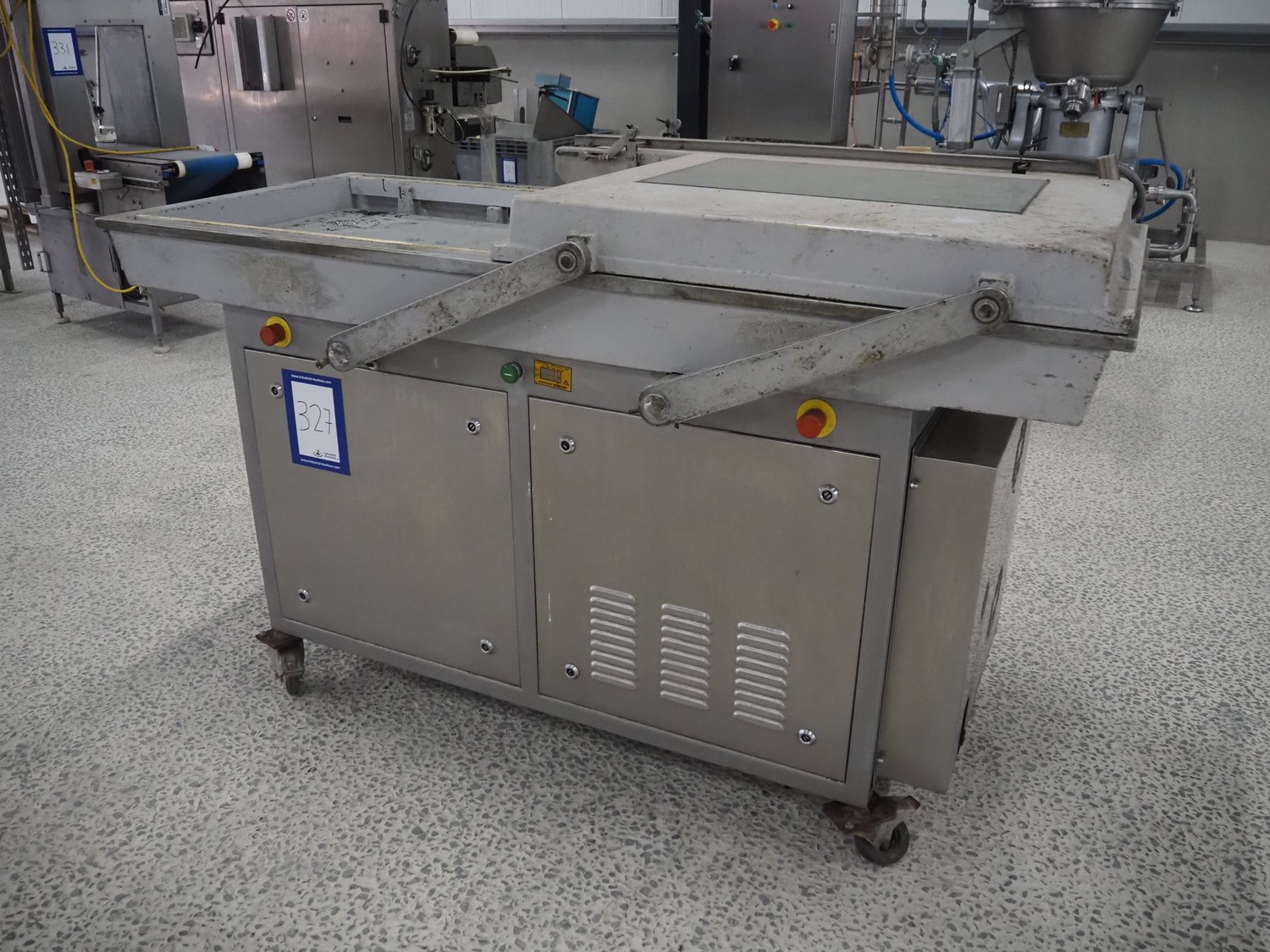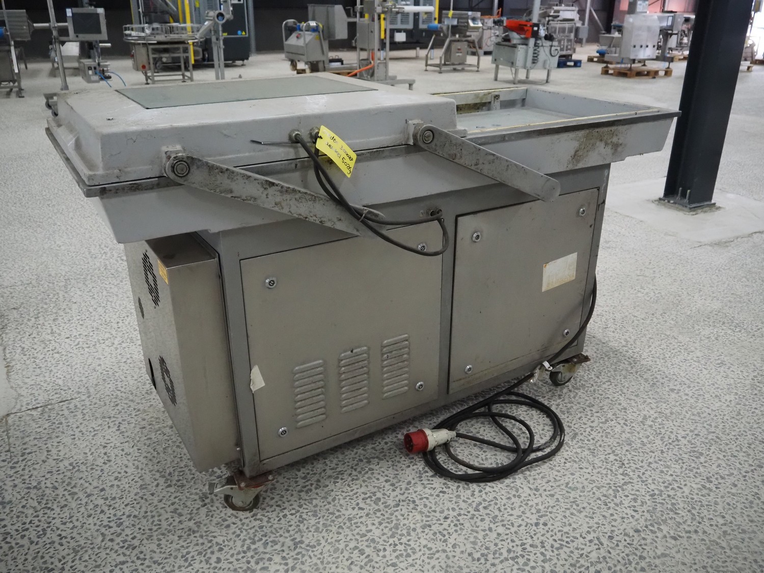 Webomatic mobile double chamber vacuum machine, type: PNE 20, machine number: 537HI2631, 400 V, 3 Ph, 50 Hz, 14.1 A, 5.5 kW, seal length: (4x) 850 mm, chamber dimensions: (2x) 850 mm x 720 mm, Busch vacuum pump, type: RA 0250 D 561 CUXX, capacity: 250 m³ per hour, total dimensions: 1870 mm x 850 mm x 1100 mm.