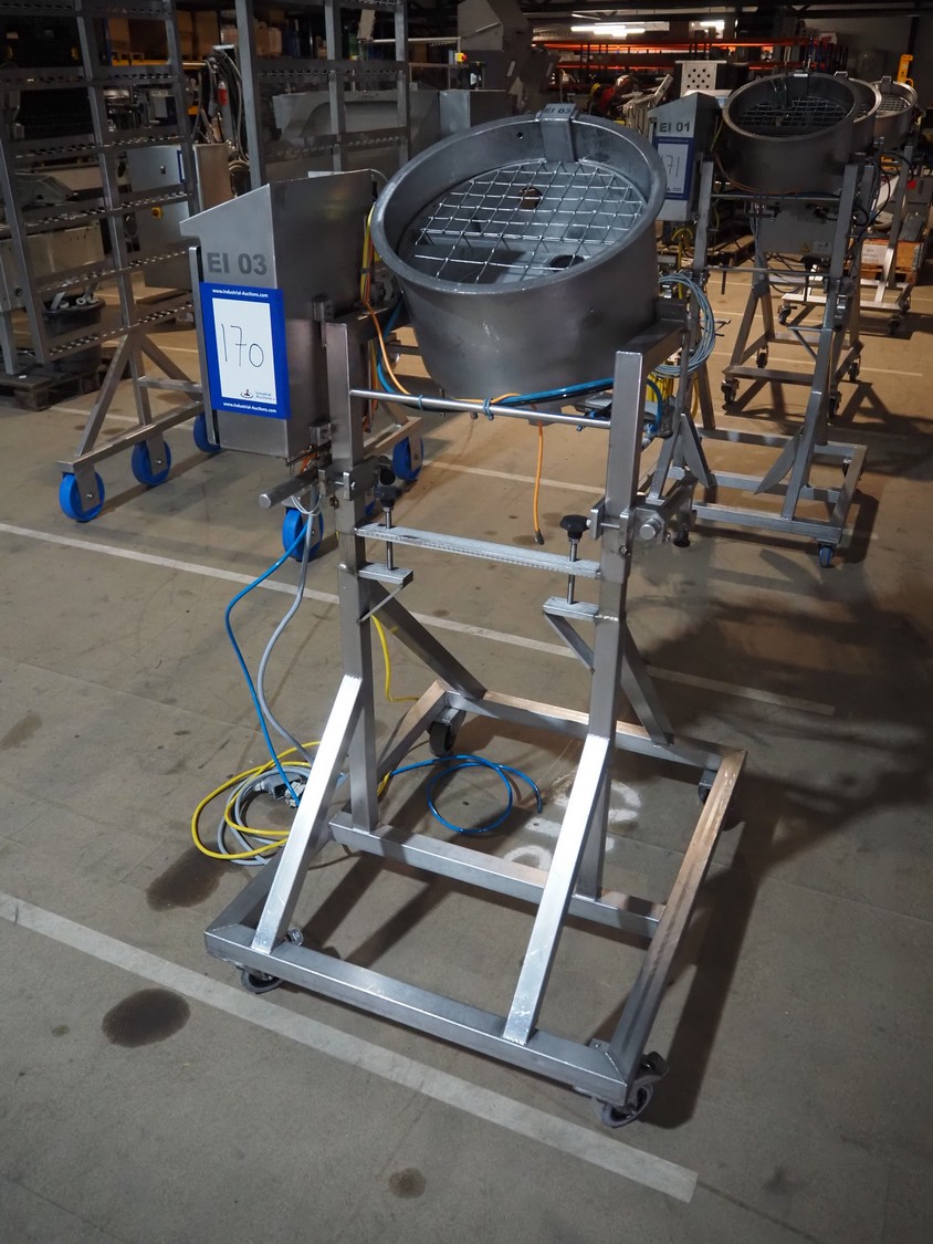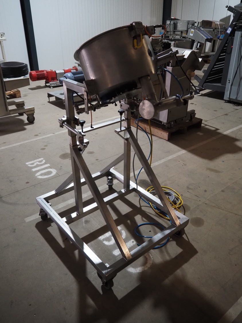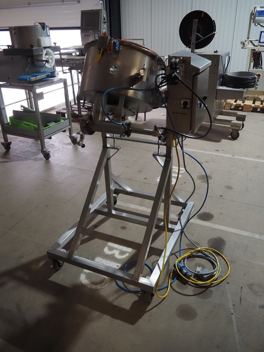 Mobile egg shell cutter for 16 eggs, dimensions: 950 mm x 850 mm x 1500 mm.