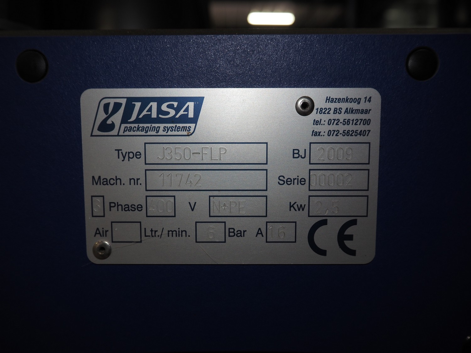 Jasa vertical form-, fill-, and seal machine, type: J350-FLP, machine number: 11742, year of construction: 2009, serie: 00002, 400 V, 3 PH, 2.5 kW, 16 A, 6 bar, film width: 745 mm, seal length: 370 mm, total dimensions: 1150 mm x 850 mm x 1300 mm.