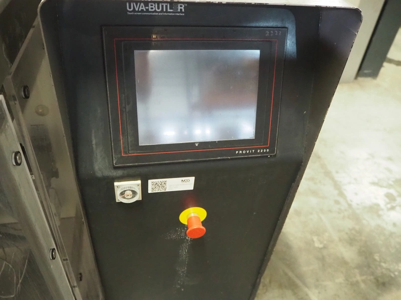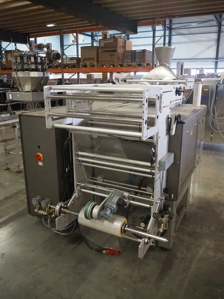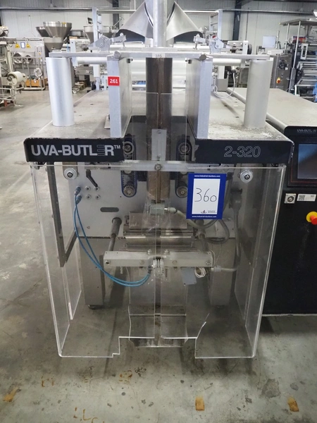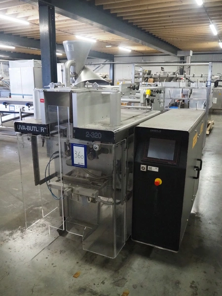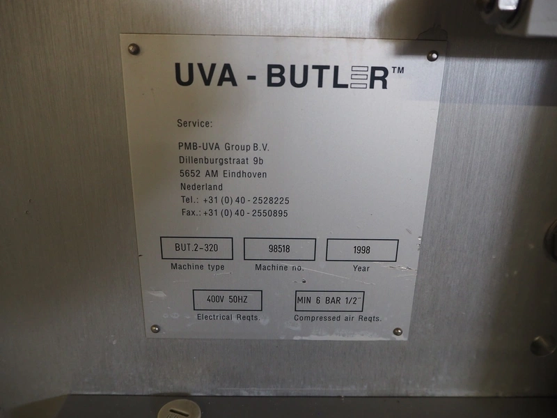 Uva-Butler vertical form-, fill-, and seal machine, type: BUT.2-230, machine number: 98518, year of construction: 1998, 400 V, 50 Hz, diameter filling pipe: 120 mm, vertical seal length: 600 mm, horizontal seal length: 370 mm, film width: 380 mm, total dimensions: 1970 mm x 1500 mm x 1910 mm.