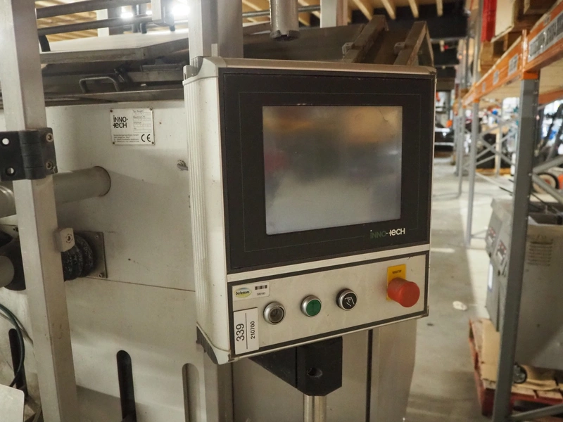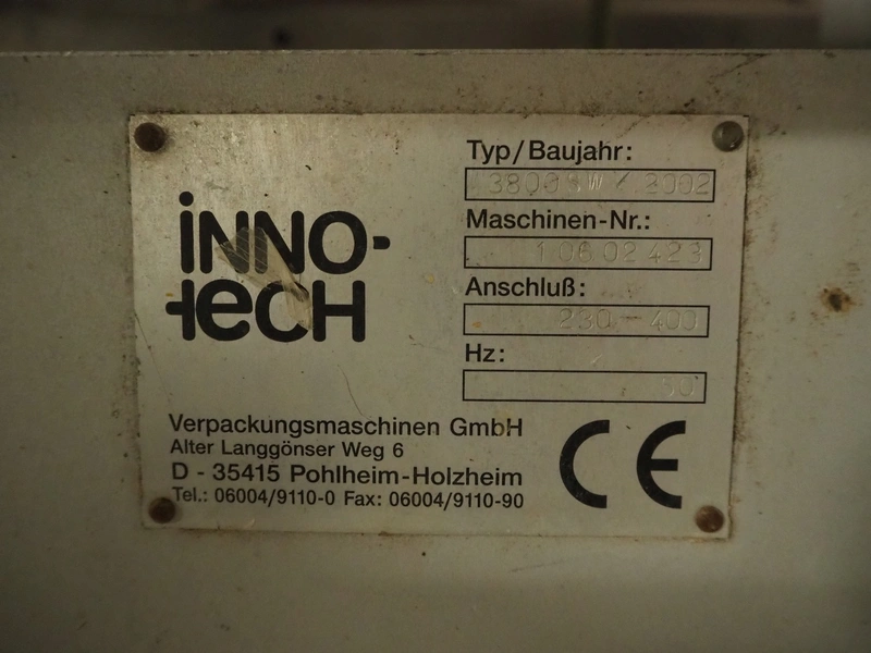 Inno-Tech vertical bag fill-, form-, and seal machine, type: 3800SW/2002, machine number: 106 02 423, 230-400 V, 50 Hz, seal length: 400 mm, total dimensions: 2700 mm x 1600 mm x 2700 mm.