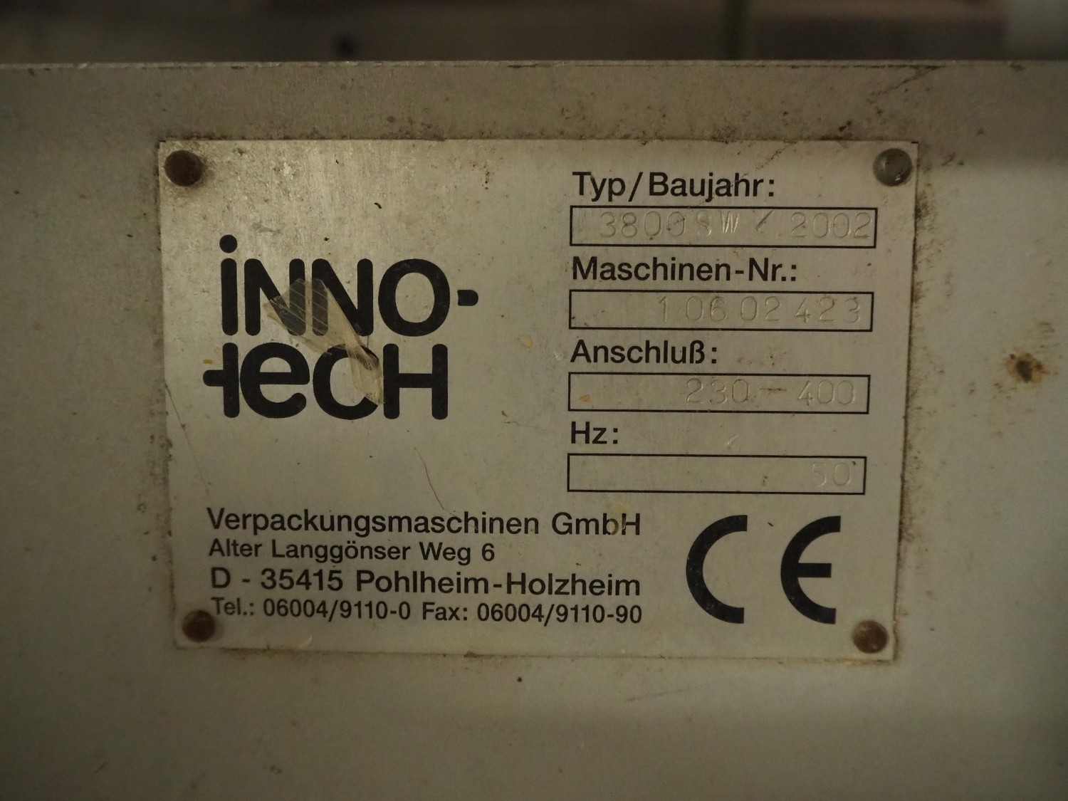 Inno-Tech vertical bag fill-, form-, and seal machine, type: 3800SW/2002, machine number: 106 02 423, 230-400 V, 50 Hz, seal length: 400 mm, total dimensions: 2700 mm x 1600 mm x 2700 mm.