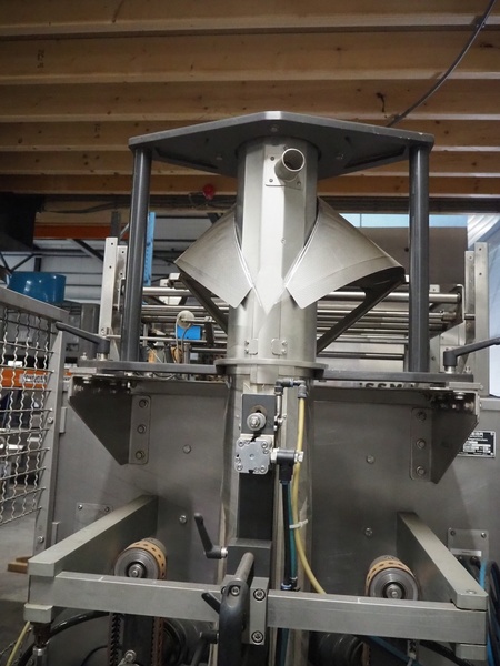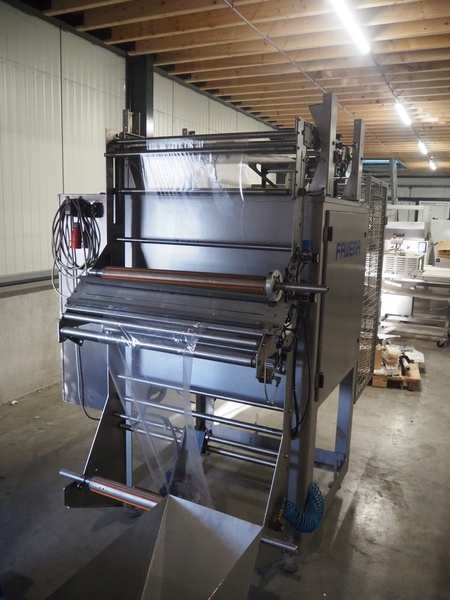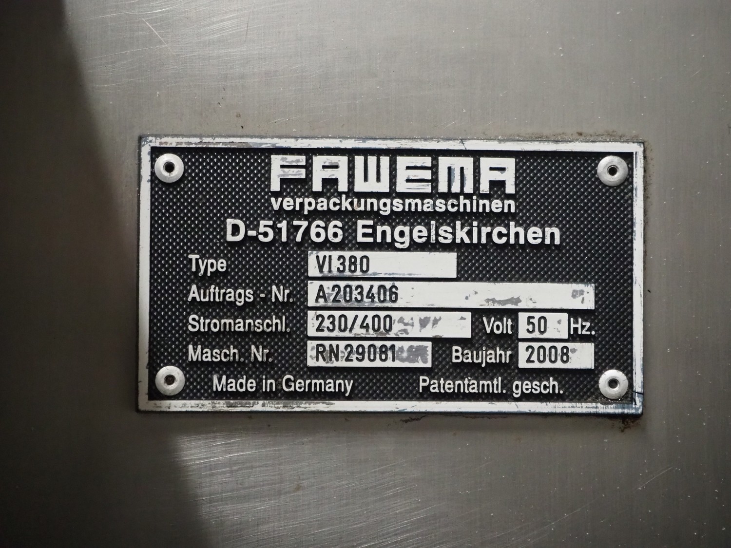 Fawema Verpackungsmaschinen vertical bag form-, fill- and seal machine, type: VI380, machine number: RN29081, year of construction: 2008, 230/400 V, 50 Hz, film width: 520 mm, diameter pipe: 150 mm, vertical seal length: 570 mm, horizontal seal length: 400 mm, total dimensions: 2300 mm x 1600 mm x 2300 mm.