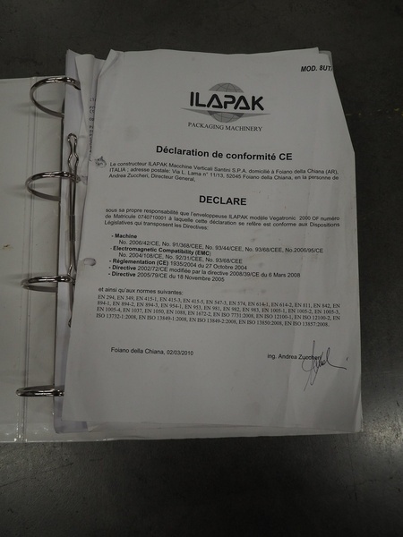 Ilapak vertical bag form-, fill-, and seal machine, type: VT 2000.OF S, serial number: 0741111003, year of construction: 05 2011, 400 V, 50 Hz, 5000 W, film width: 340 mm, diameter filling pipe: 100 mm, vertical seal length: 530 mm, horizontal seal length: 450 mm, total dimensions: 2100 mm x 1630 mm x 2110 mm. Including 3 pallets with parts and extra filling pipes, diameters filling pipes: 150 mm / 130 mm / 115 mm.