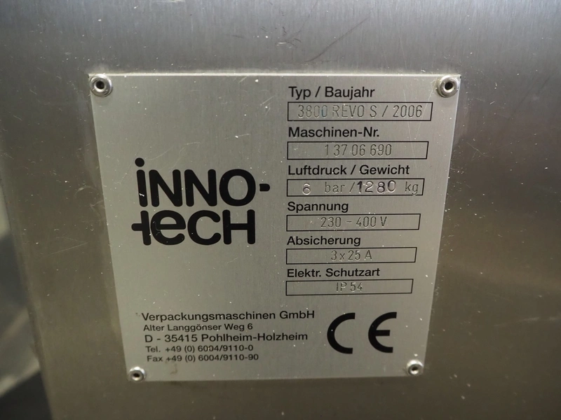 Inno-Tech vertical bag fill-, form-, and seal machine, type: 3800 Revo S, machine number: 137 06 690, year of construction: 2006, 230-400 V, 3x25 A, film width: 635 mm, seal width: 420 mm, total dimensions: 2800 mm x 1600 mm x 2450 mm. With pallet with parts.