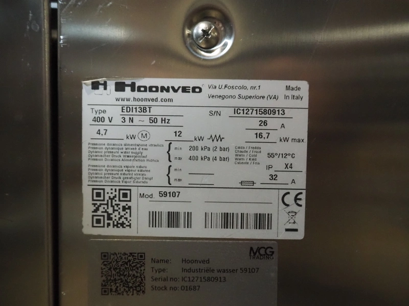 Hoonved dishwasher, type: EDI13BT, serial number: IC1271580913, 400 V, 3 Ph, 50 Hz, 26 A, 16.7 kW, dimensions: 1500 mm x 900 mm x 1850 mm.