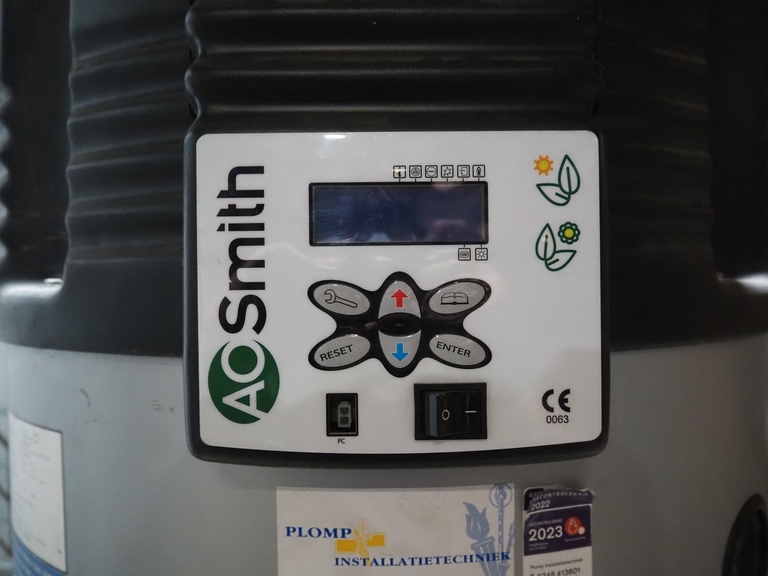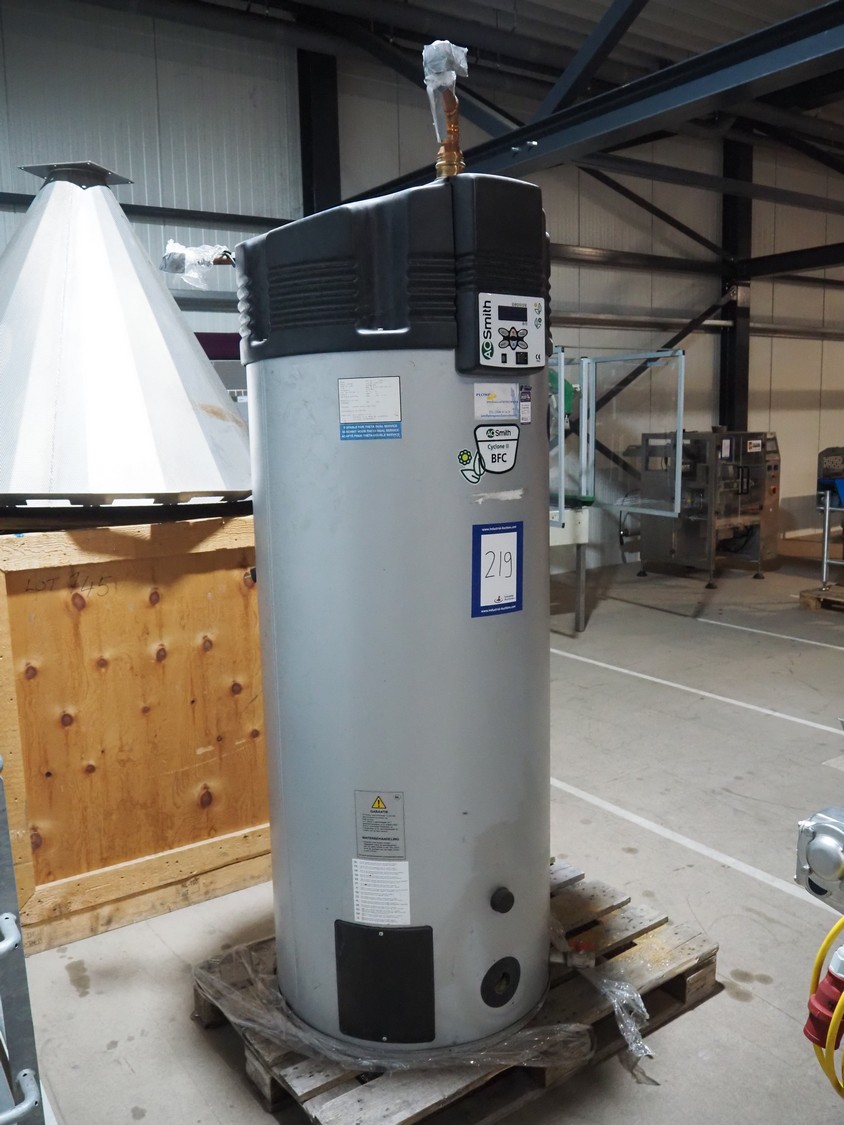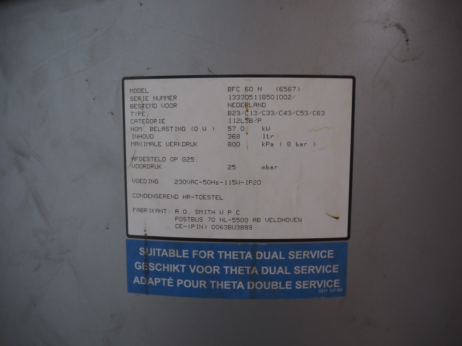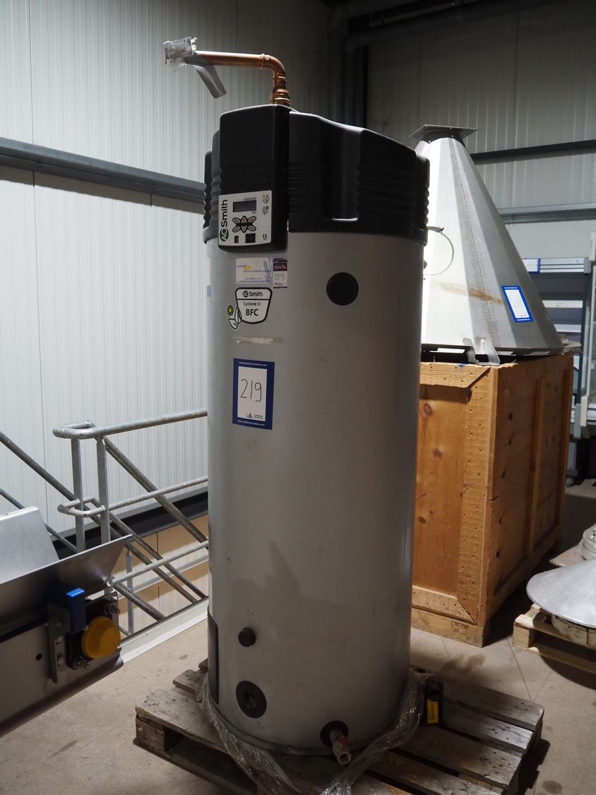 A.O. Smith W.P.C. boiler, model: BFC 60 N (6567), serial number: 133305118501002, 230 V, 50 Hz, 115 W, volume: 368 liter, nominal capacity: 57.0 kW, maximum working pressure: 800 kPa (8 bar), dimensions: Ø 760 mm x 2100 mm.