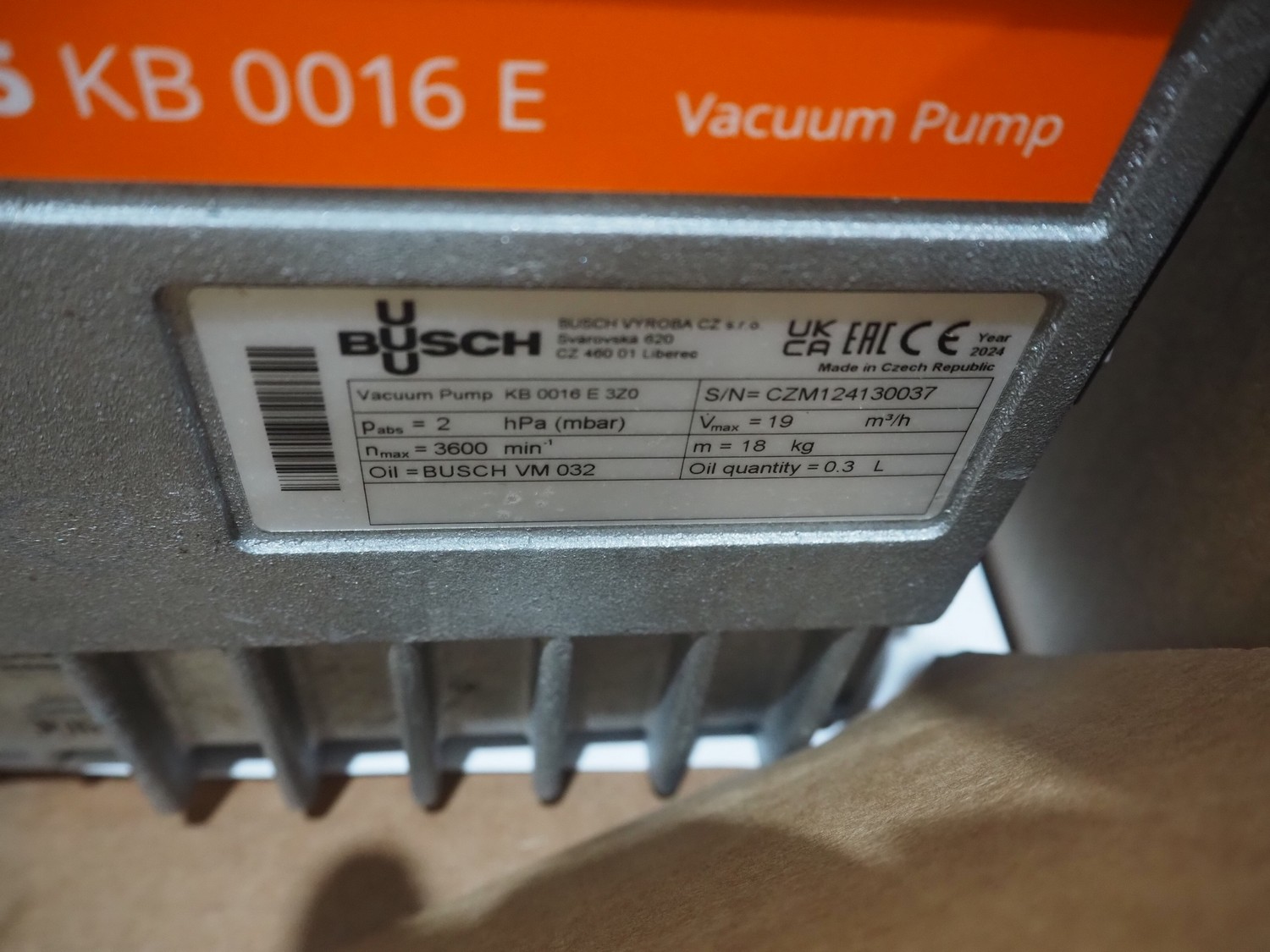 Busch vacuum pump, type: KB 0016 E 3ZO, serial number: CZM124130037, year of construction: 2024, capacity: 19 m³ per hour, dimensions: 290 mm x 220 mm x 200 mm.
