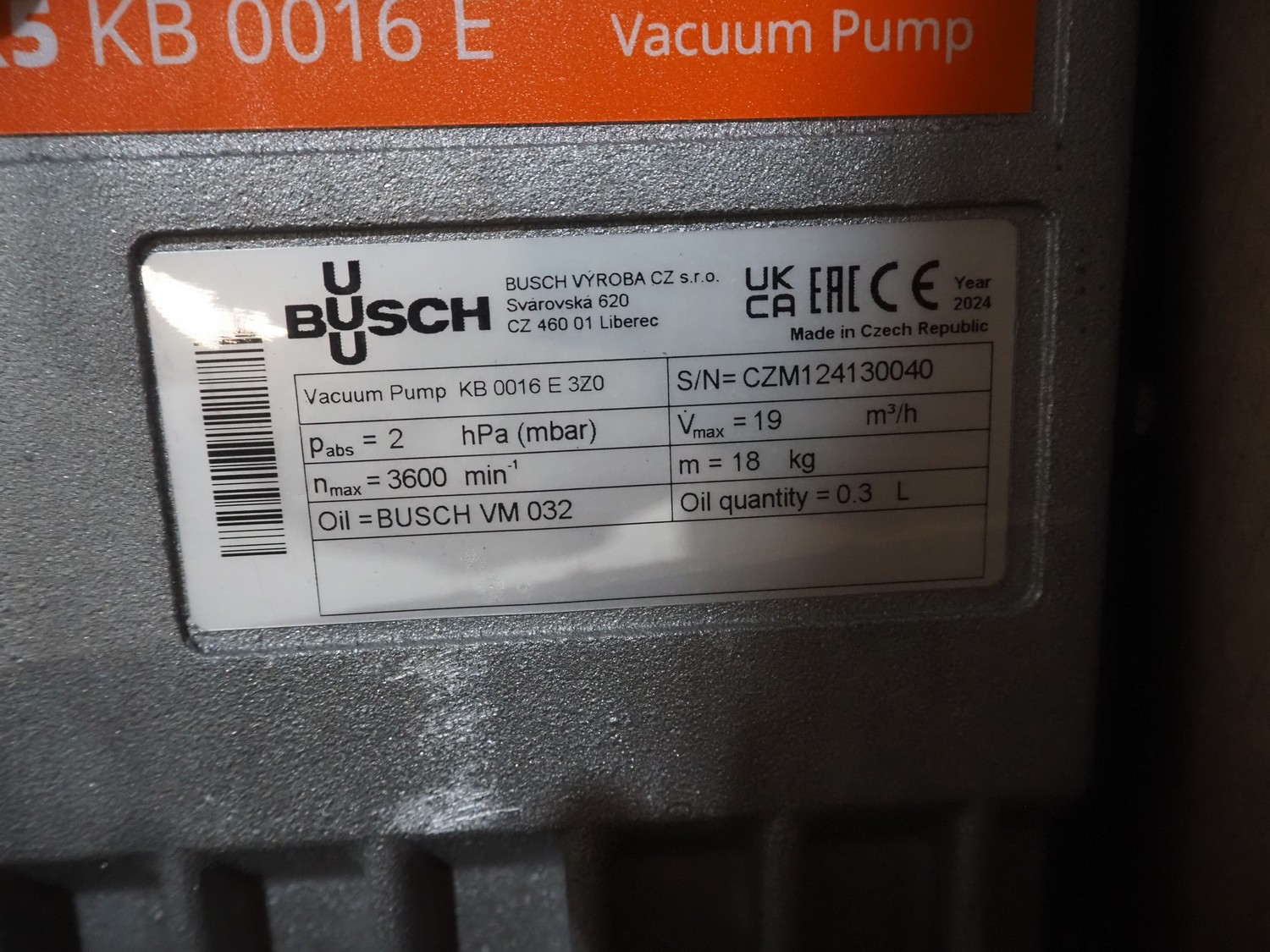 Busch vacuum pump, type: KB 0016 E 3ZO, serial number: CZM124130042, year of construction: 2024, capacity: 19 m³ per hour, dimensions: 290 mm x 220 mm x 200 mm.